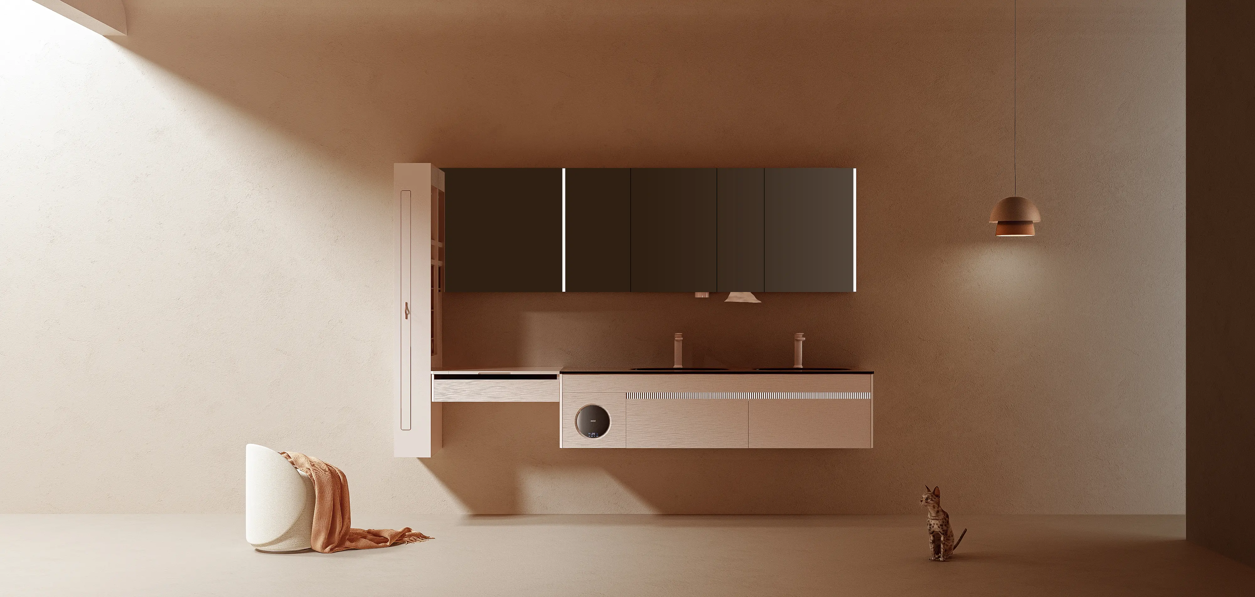 MUYAN is a light luxury intelligent beauty integrated bathroom cabinet designed for women. Elegant light pink texture cabinet carries professional-grade cosmetic lighting and intelligent mirror system, integrating beauty refrigerator, jewelry display area and exclusive storage compartment. The side cabinet cleverly hides the full-body mirror, and the embedded mini washing machine completes the function matrix, seamlessly integrating the efficient skin care process with exquisite storage, creating a luxury space integrating professional beauty and aesthetics of life in a small space.