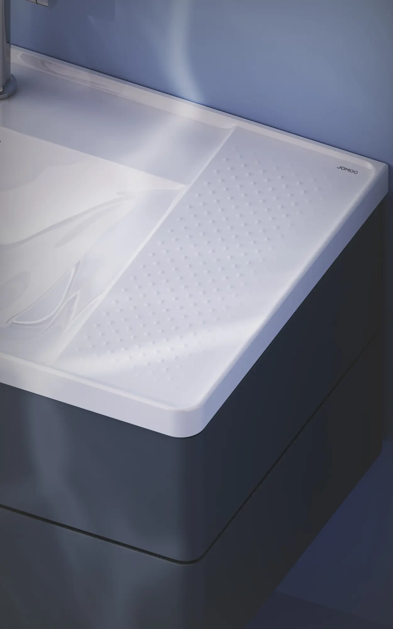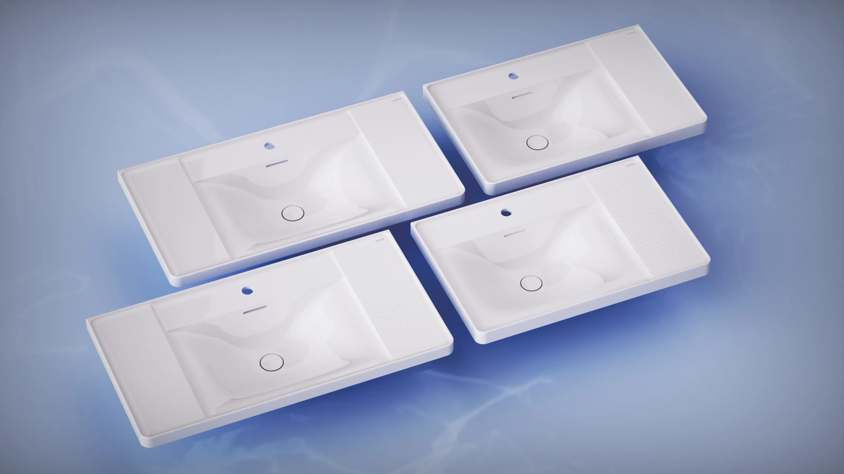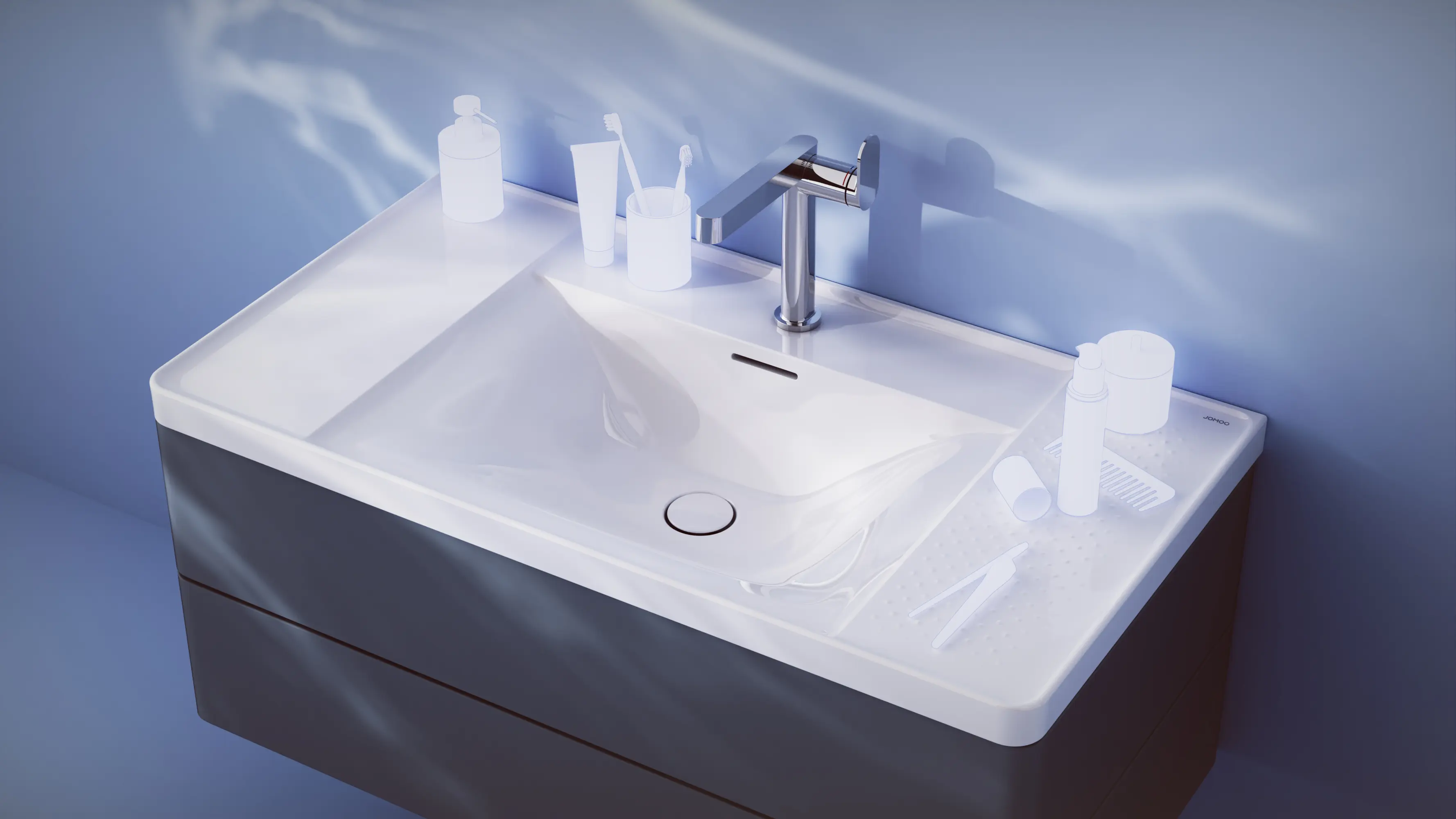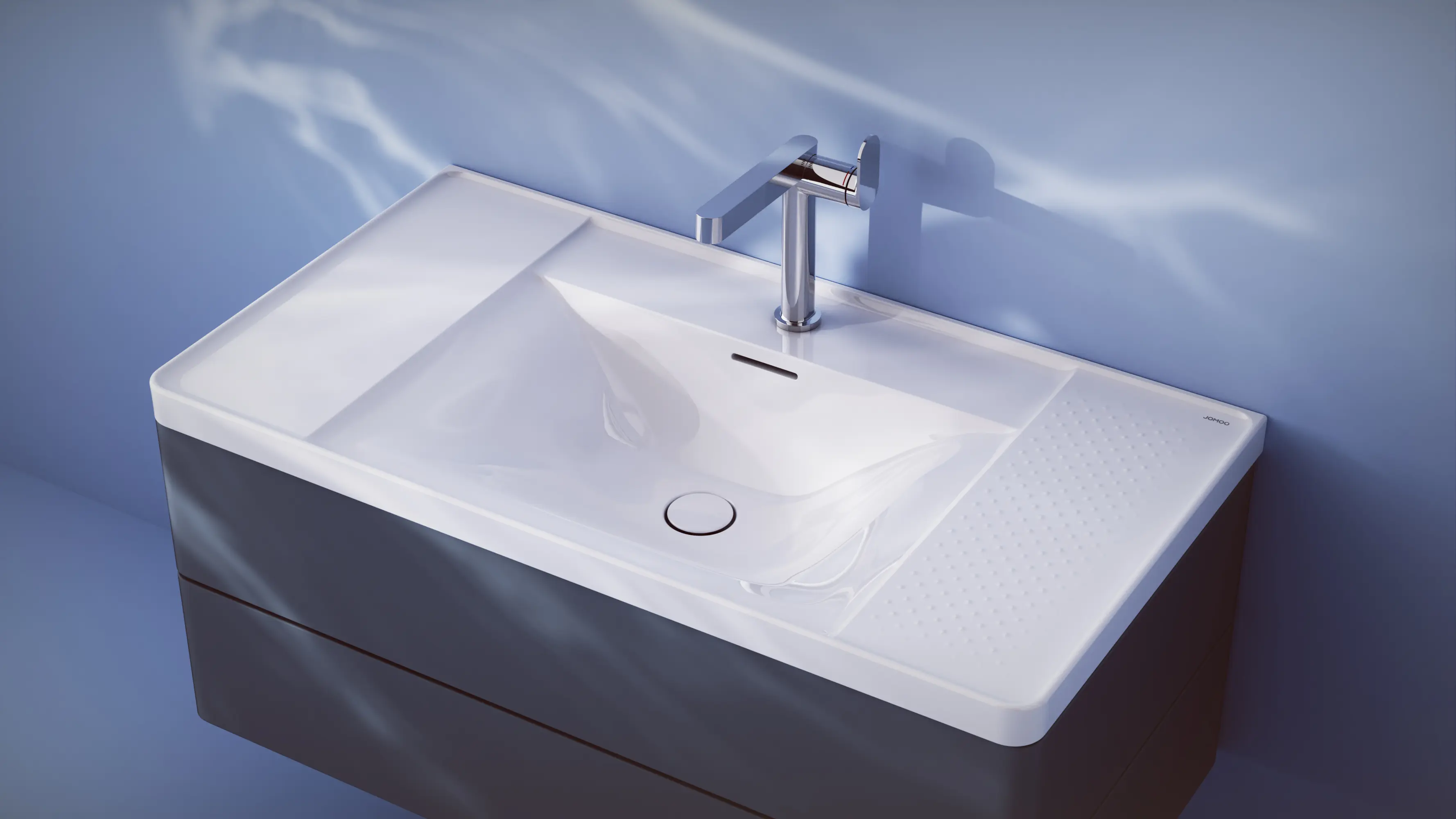 REEFS offers a functional, practical solution for everyday routines. It features a well-structured shelf layout at different heights to keep the basin tidy and organized. Recessed side shelves create easy-to-clean areas for storing personal care products or for items that might temporarily soil it. An optional 3D pattern prevents objects from rolling into the wet area. A deeper faucet bench confines droplets during faucet operation. A special nano-glaze and soft design ensure optimal drainage, cleanability and hygiene. Zirconium ceramic enables fine detailing and increases durability, preventing glaze cracks over time.