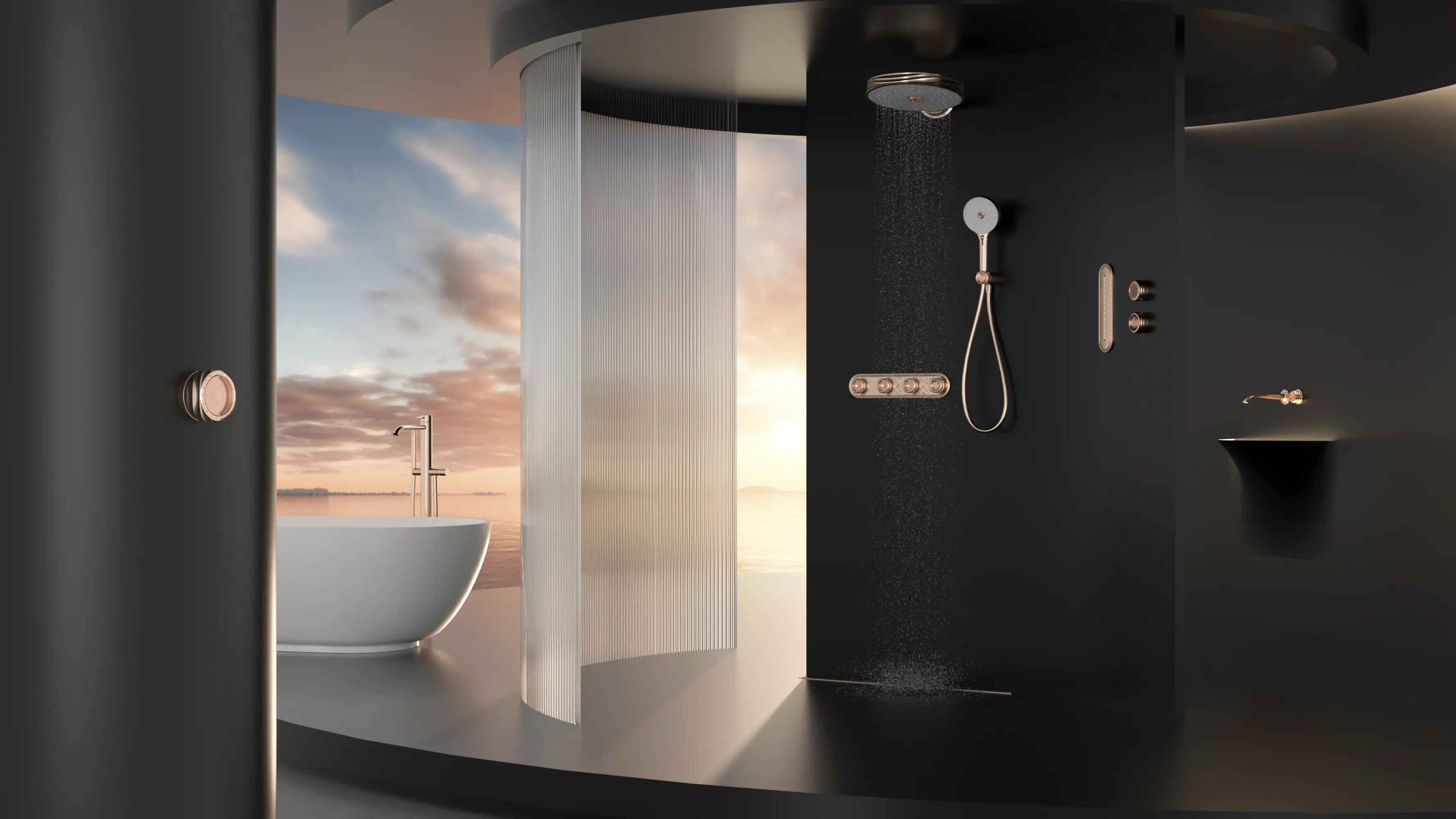 Inspired by roses, the series features rose twist designs on showerhead buttons, face cover, and faucet switch handle, blending elegance with strength to bring romantic artistry. Crafted from premium brass, the showerhead and faucet are formed as a single piece for structural stability and leak prevention. Ceramic and copper materials inhibit bacteria for a healthy, eco-friendly shower. The zero-cold water pre-drain function via remote control ensures instant, consistent-temperature water. Built-in modules such as ambient lighting, aroma diffuser, and speaker make it ideal for various spaces.