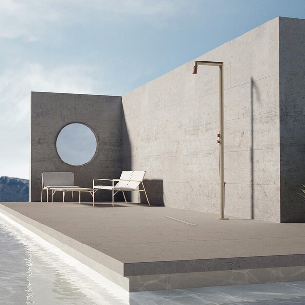 Shiva garden shower is characterized by a modern design that combines functionality and aesthetics. This freestanding column 100 % Made in Italy is realized in 316L stainless steel, 2mm thick and can be customized in the AMA finishes “Back to Nature”. Shiva is presented in finish RAL1019 “Matera” with all accessories in brushed copper PVD. Its showerhead is completed with 3 Cache’ Neoperl water save certificated aerators and a progressive mixer with an innovative handle. Shiva model was designed and created by AMA, a family company that is now in its third generation of activity in the sector of mechanic and in the branch of marine steel taps.
