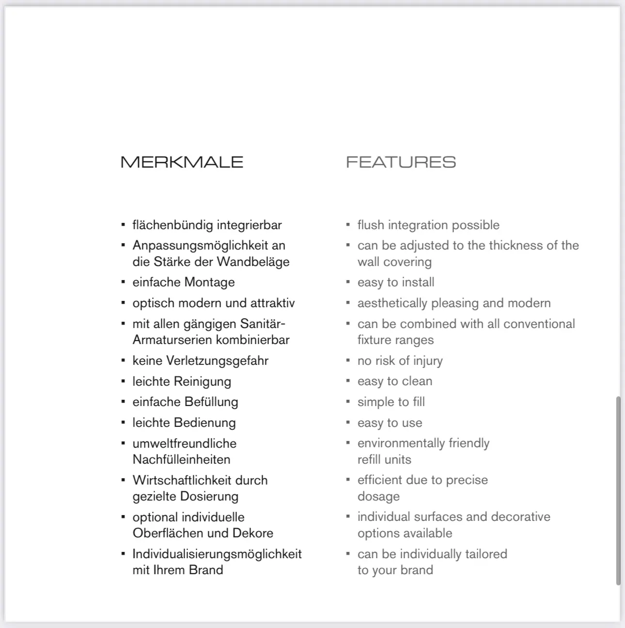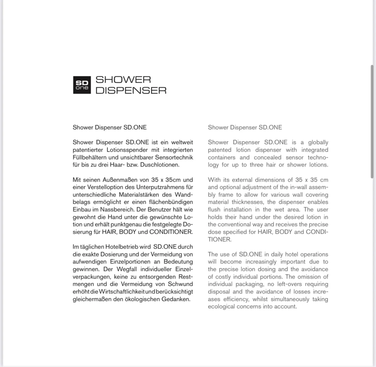 Shower Dispenser SD.ONE is a globally patented lotion dispenser with integrated containers and concealed sensor technology for up to three hair or shower lotions. With its external dimensions of 35 x 35 cm and optional adjustment of the in-wall assembly frame to allow for various wall covering material thicknesses, the dispenser enables flush installation in the wet area. The user holds their hand under the desired lotion in the conventional way and receives the precise dose specified for HAIR, BODY, and CONDITIONER. The use of SD.ONE in daily hotel operations will become increasingly important due to the precise lotion dosing and the avoidance of costly individual portions. The omission of individual packaging, no left-overs requiring disposal and the avoidance of losses increases efficiency, whilst simultaneously taking ecological concerns into account.