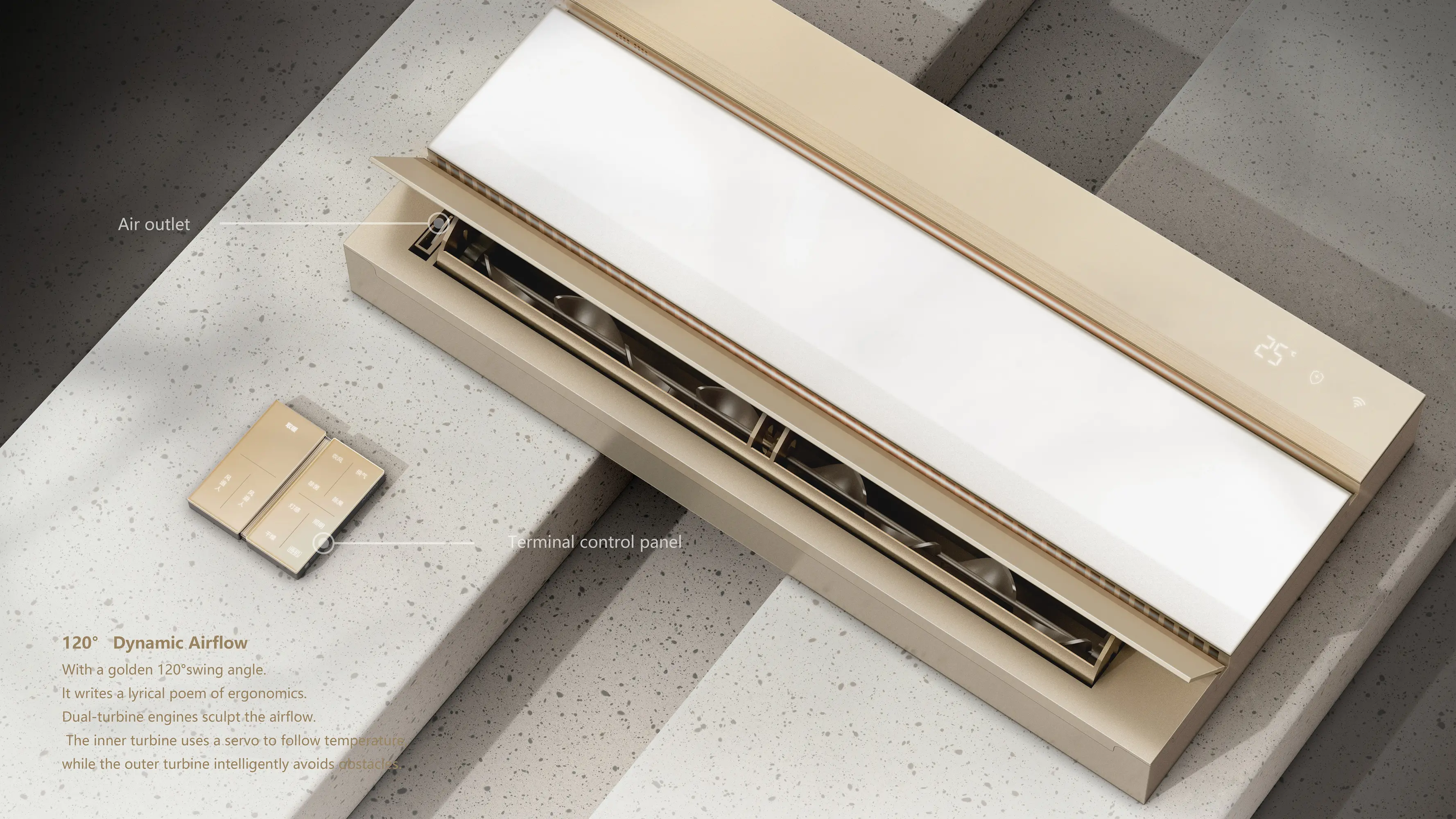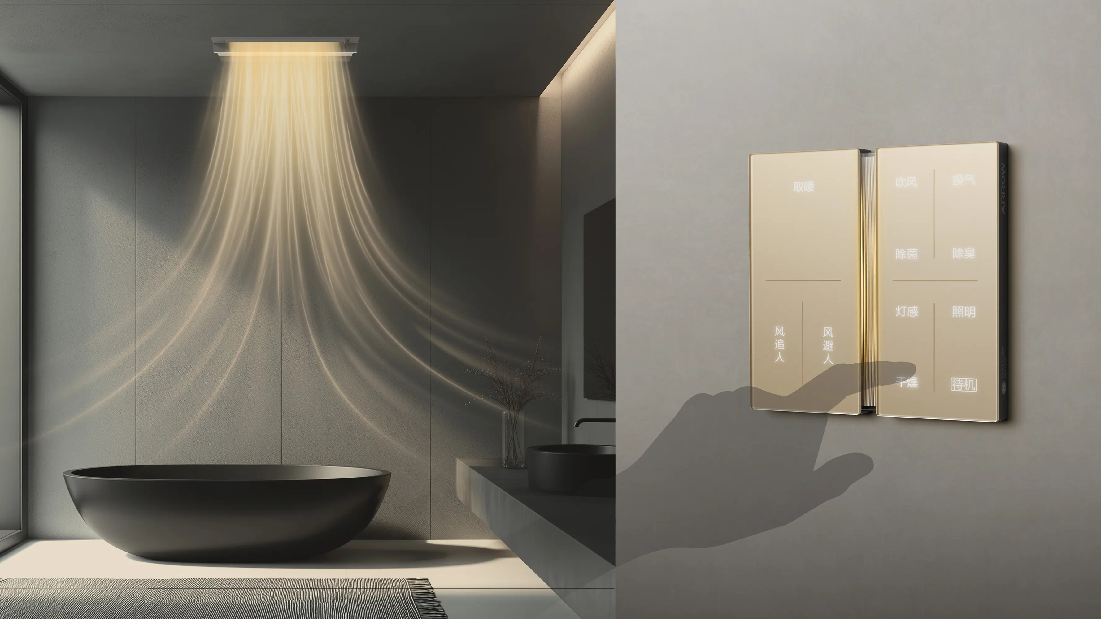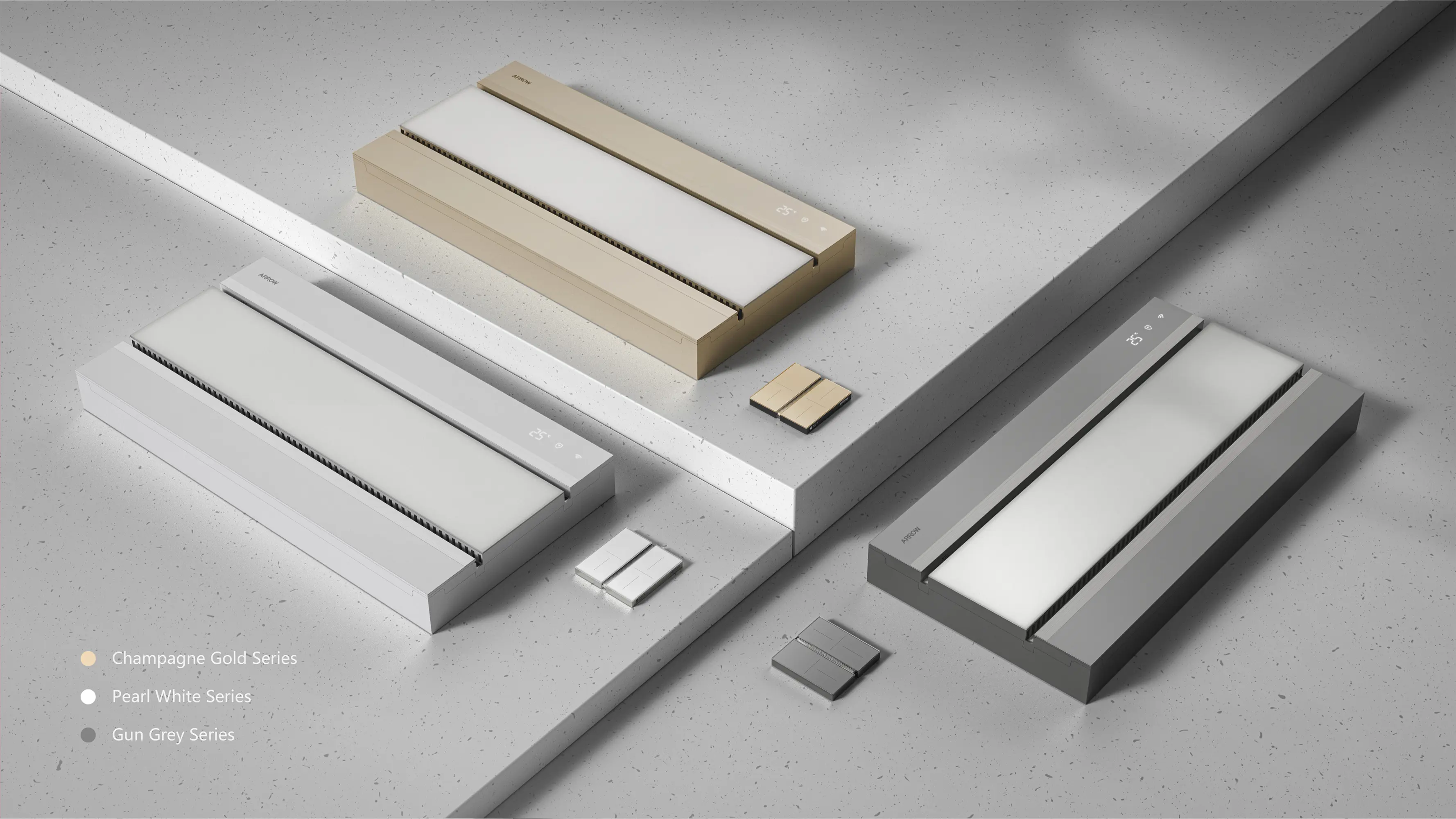 The Symmet bathroom heater features rational lines that sculpt balance and order. Its dual-turbine engine powers a 120° oscillating blade, directing airflow intelligently: the inner fan tracks temperature, while the outer avoids obstacles. A dual-duct system renews the atmosphere, dispelling dampness and imbuing freshness. The stepped-floating control panel, with anti-glare skin-feel glass, minimizes seams and offers refined tactile interaction. A touch on the matte surface activates a breathing light, enabling intuitive control. Three ambient —tying into unit status—elevate daily showers into elegant rituals of self-renewal.