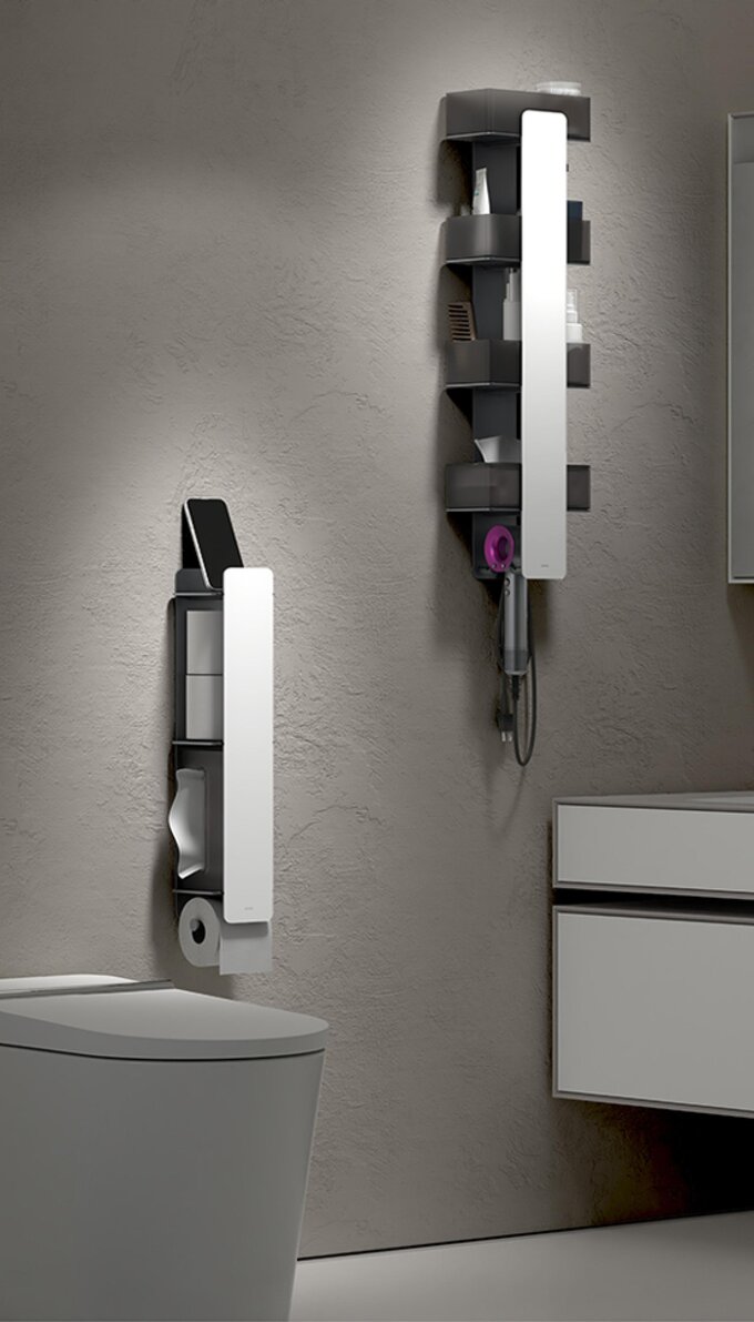 The "Veil Collection" features a modular system for vanity, toilet, and shower areas, with flexible horizontal and vertical orientations. The vertical shelf maximizes storage in limited spaces, offering a compact yet spacious solution. Movable trays on the shelves allow users to organize utilities by function. For example, a tray for makeup essentials can be removed from the shelf and placed nearby during use, then easily returned to its spot. This adaptability enhances convenience, keeping items neatly arranged yet always within easy reach, optimizing both storage and accessibility.