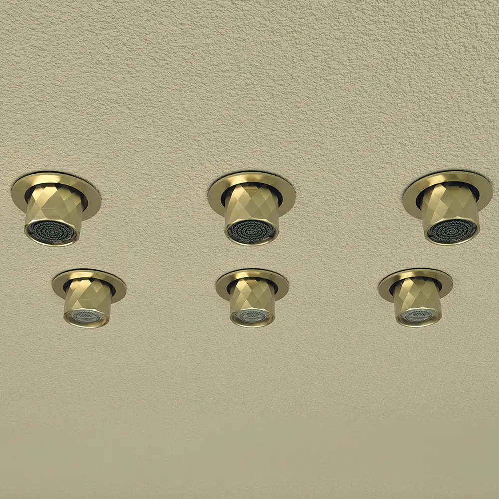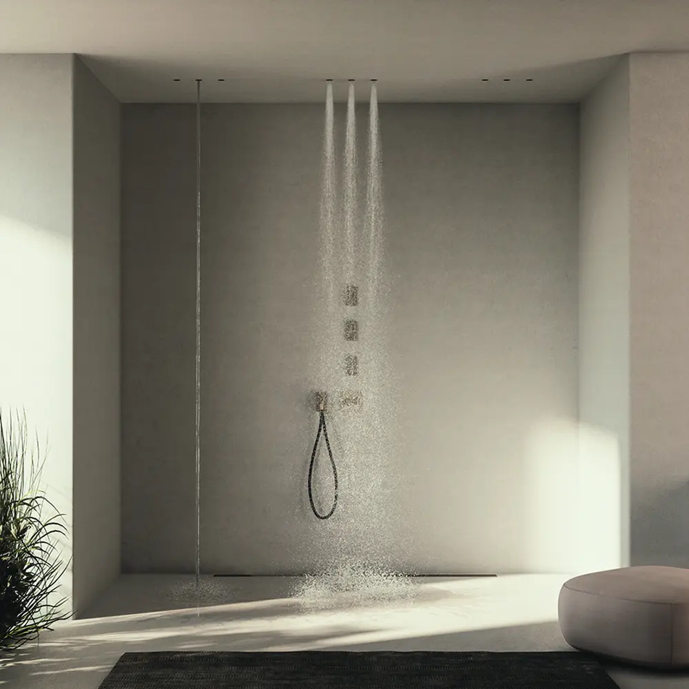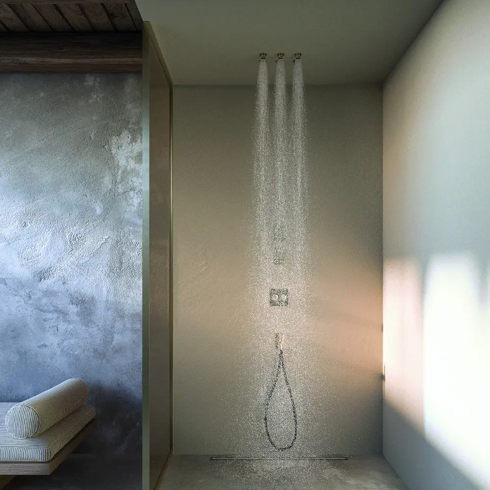 Inspired by the realm of illumination, WATERDOT mimics the form and subtle installation of classic recessed lights, discreet yet adaptable to every need. This innovative shower system comprises a series of compact micro shower heads, easily mounted on plasterboard, allowing them to be arranged and interconnected freely, creating limitless scenarios and functionalities. Its essence lies in dynamism and movement, where minimalist geometries invite the creation of a fully customizable shower tailored to individual desires.
