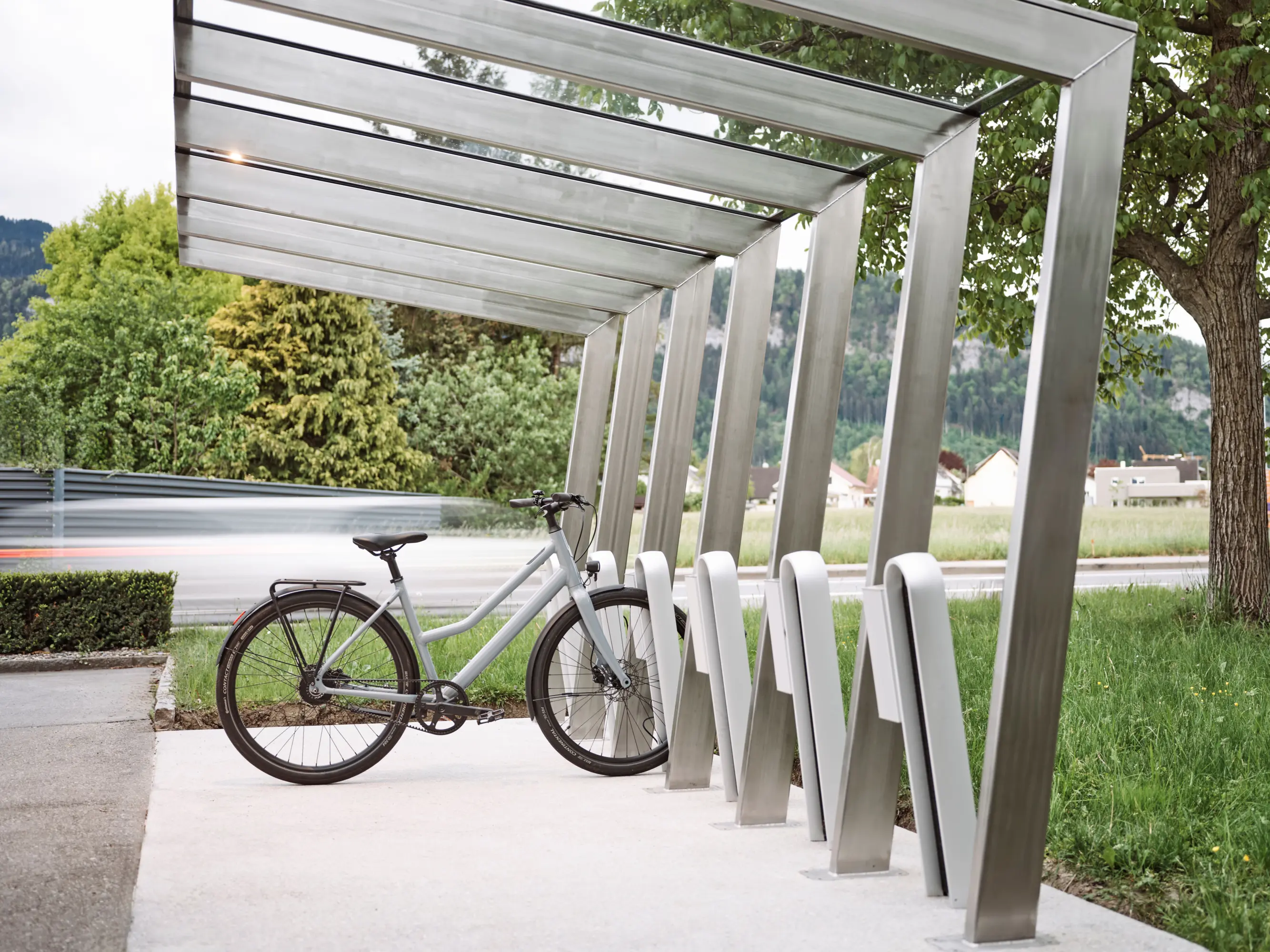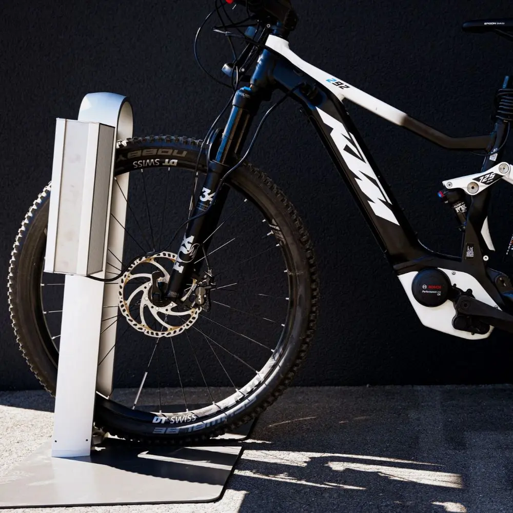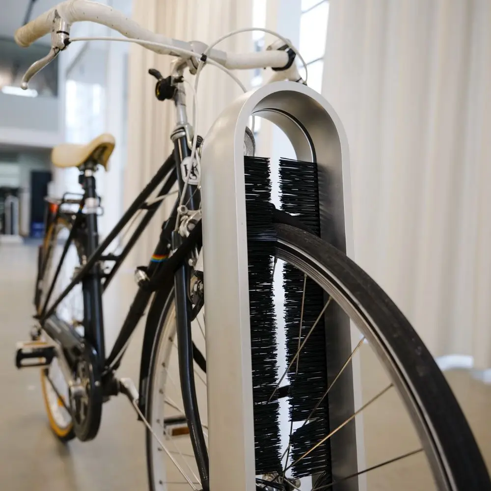 stromport.slash is a modern bicycle stand featuring patented brush technology – suitable for all types of bicycle tires. Each unit is designed for exactly one bicycle. This creates order and a clearly defined parking space. The minimal design blends discreetly into any environment and contributes to a harmonious overall appearance. User- and bike-friendly in everyday use: The front wheel is held securely and gently – without contact to the frame, rim, or brake disc. Operation is intuitive: simply roll in, and the bike stands upright and stable. Optionally available: a lockable, weather-protected charging box for e-bikes.