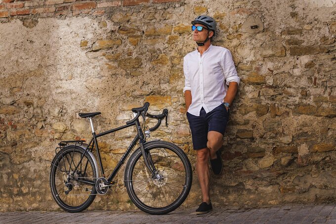 If you want to travel without an electric drive but with a lot of luggage, the Reiserad R611 from Wanderer is the right choice. The steel frame of the touring bike can cope with all requirements, including the Tubus Logo pannier rack. Thanks to a lighting system from Busch+ Müller and GRXRX400 hydraulic disc brakes from Shimano, safety and visibility are also taken care of. The lighting system is powered by a hub dynamo. Other highlights include the 11-speed Shimano GRX RD-RX812 gears and the comfortable Brooks Cambium C17 saddle. The bike in the colour black-glossy is available as a diamond or trapeze frame.