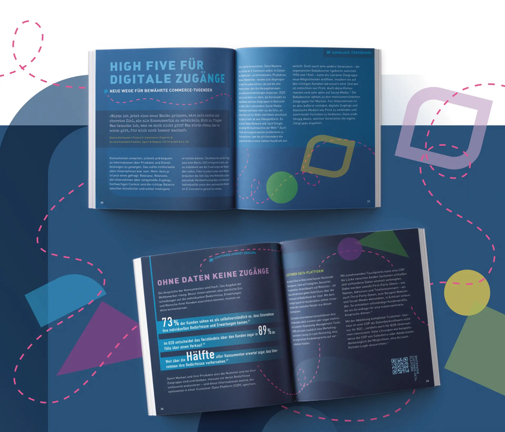 The Handelskraft Trend Book 2025 »High Five« is more than just a specialist publication – it's a visual experience that provides clarity and makes digital topics tangible. The design concept combines clarity, structure and emotion: typography, colour schemes and illustrations guide readers through complex content, create recognition value and enhance understanding. Infographics and visual markers simplify navigation and invite deeper exploration. Every two-page spread is thoughtfully designed – with the goal of not just conveying content but making it an experience. This turns the Trend Book into a lasting source of inspiration.