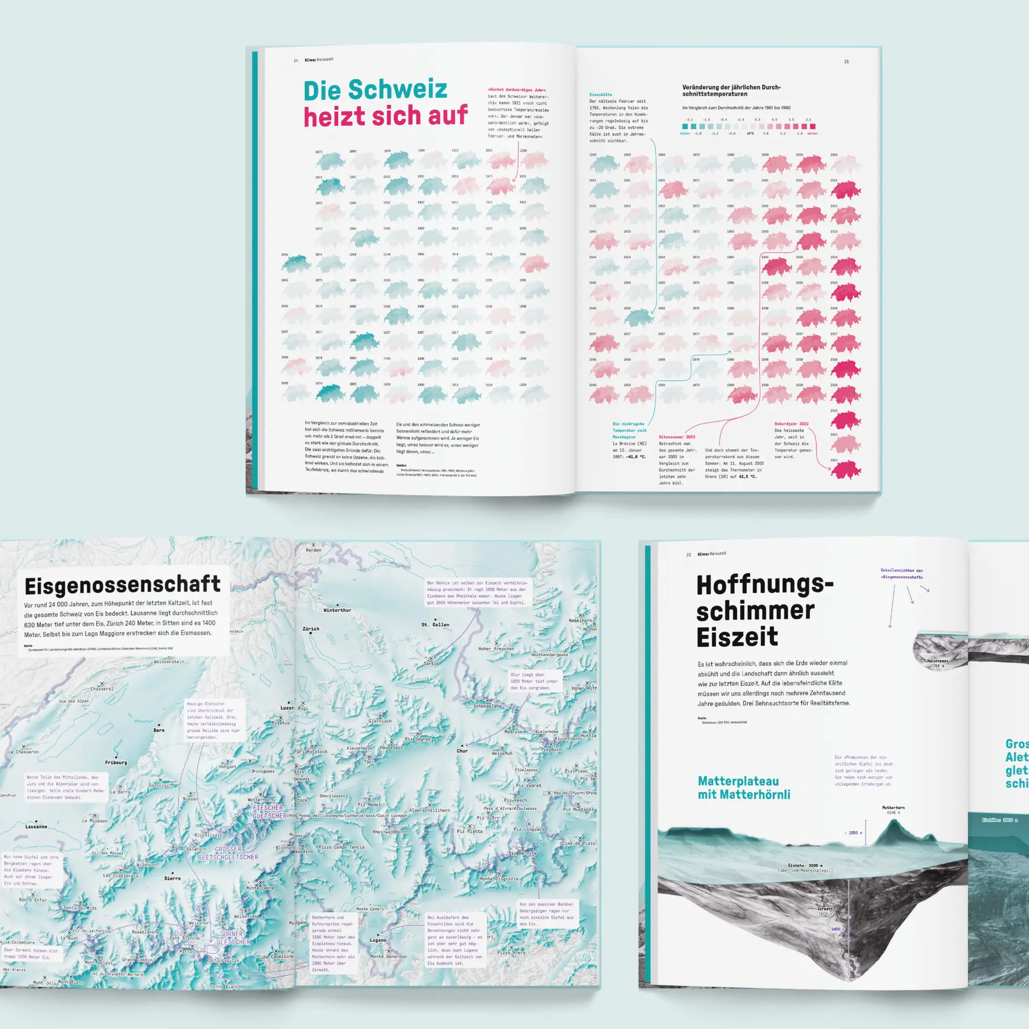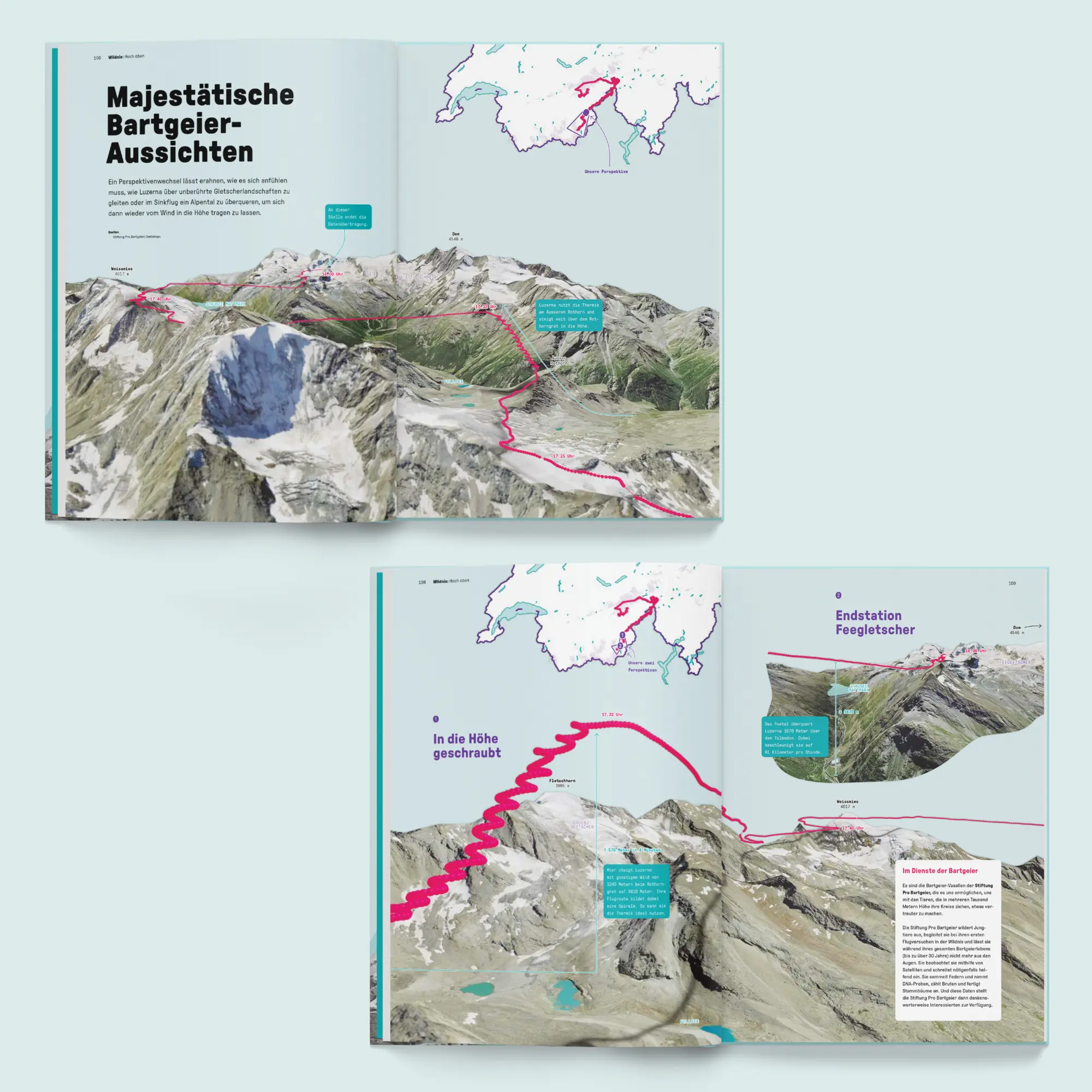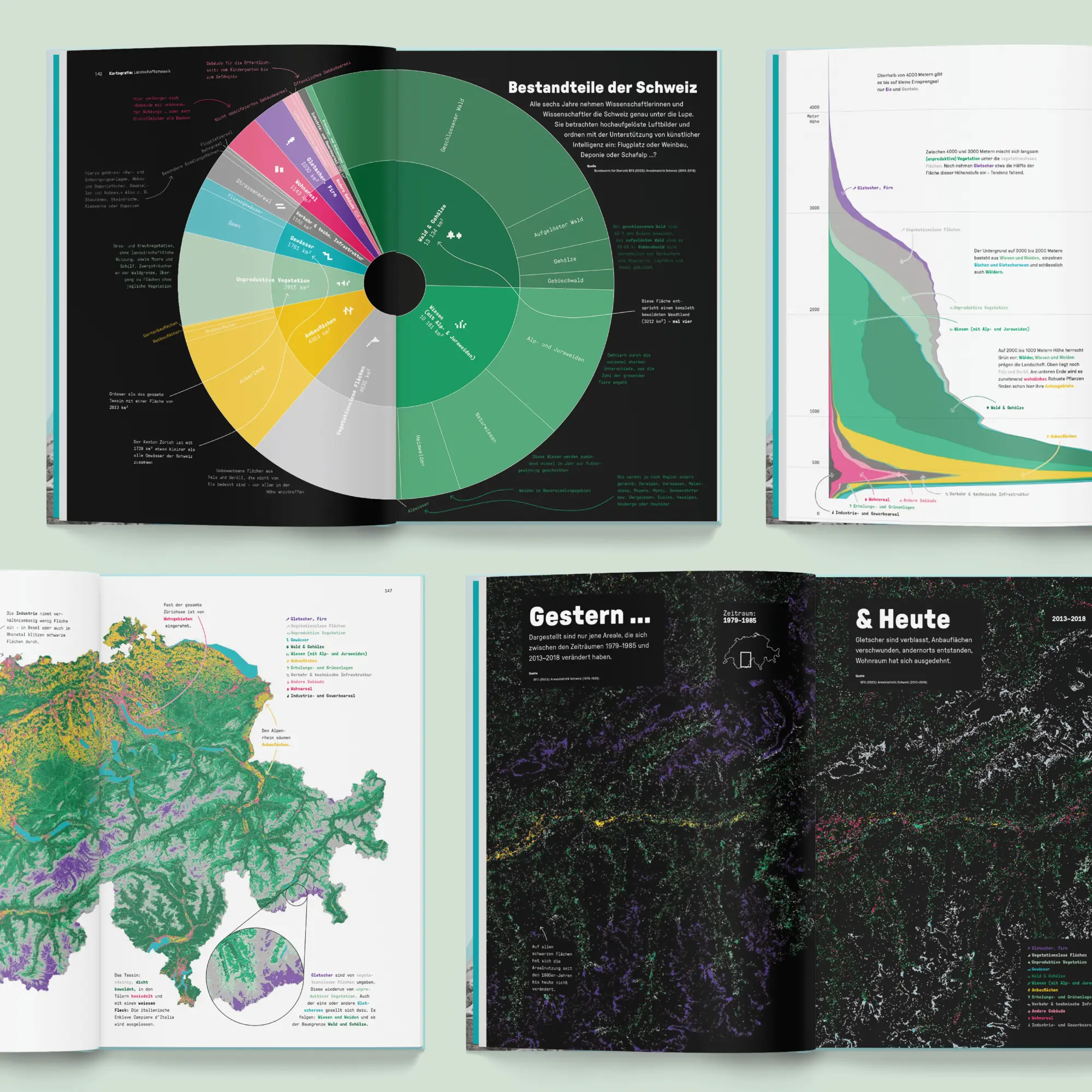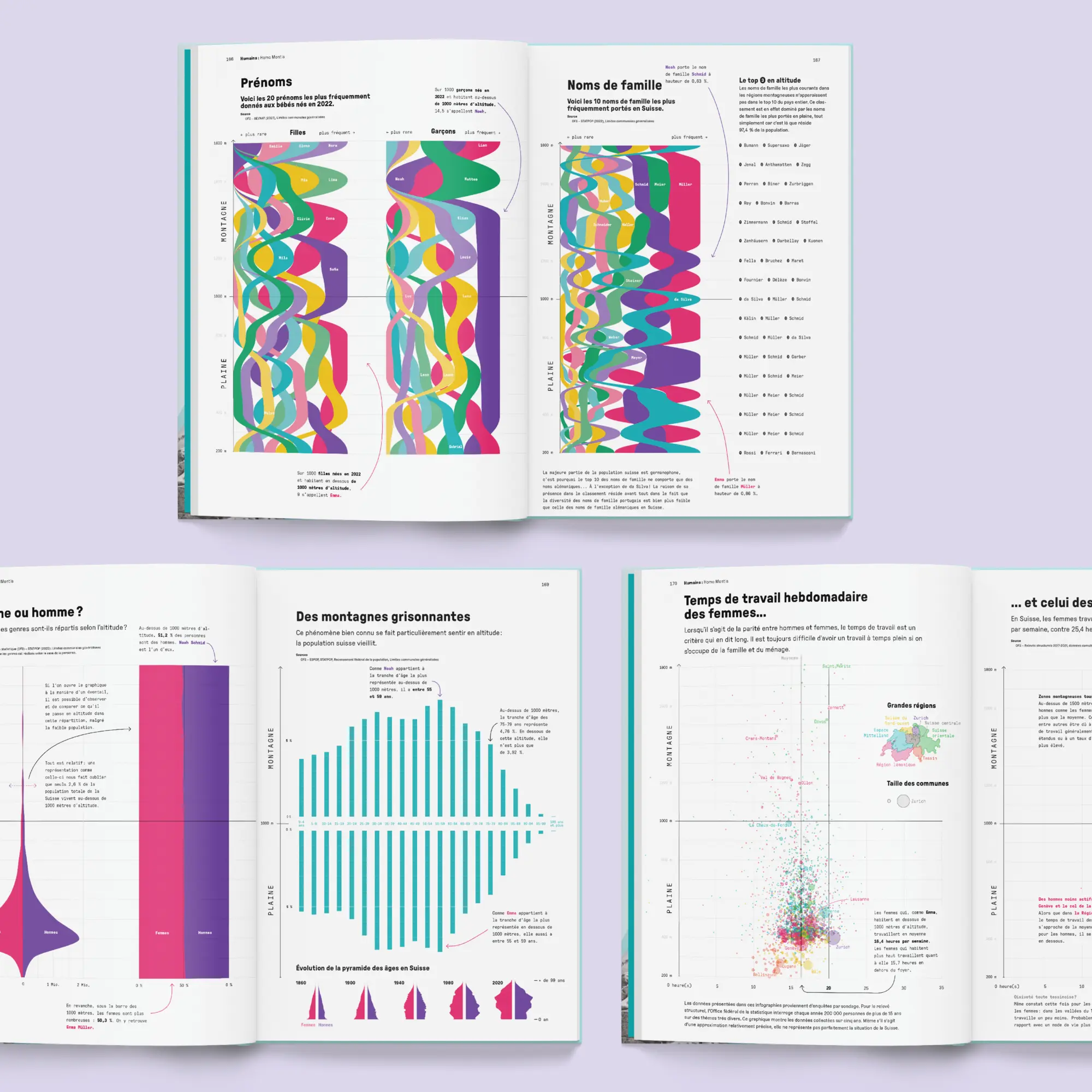 For three years, Fabian Lang searched the Swiss Alps, archives, and open-source catalogues for extraordinary data and imagery. With support from experts in climatology, cartography, and glaciology, he turned this material into visual stories for a wide audience. The result is a 200-page book filled with infographics on topics like GPS-tracked bearded vultures, the past and future of major glaciers, mountain biodiversity based on 30,000 sightings, human-wolf coexistence, climate change, gender (in)equality, energy transition, Swiss cartography, and the distribution of surnames by elevation.