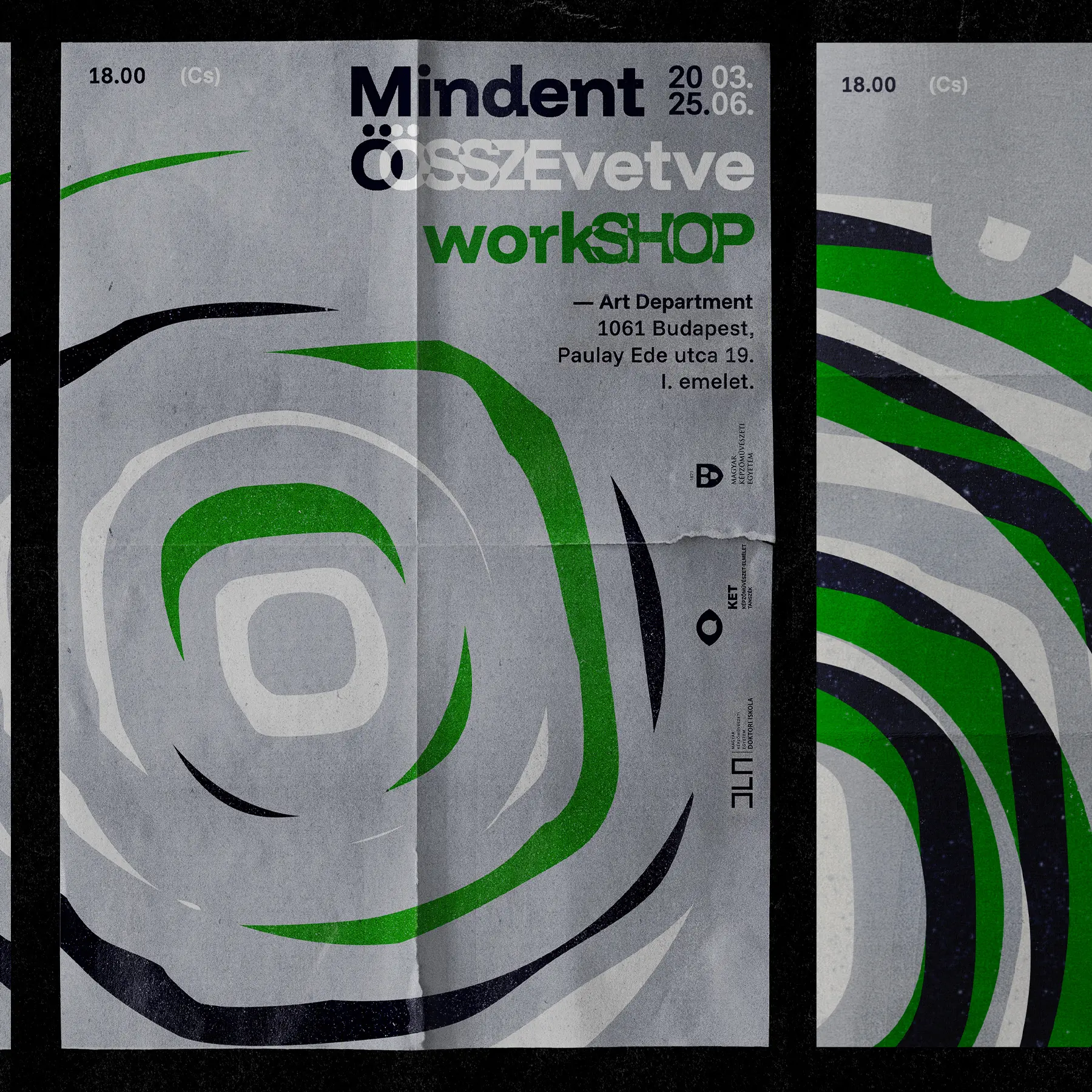 The visual identity for the Mindent Összevetve (i.e. All Things Considered) exhibition came out for the collaboration between the Doctoral School at the Hungarian University of Fine Arts and first-year MA students from the Fine Art Theory Department. The core graphic theme explores how all these different works are tangled up, influencing each other, reflecting the close interweaving of elements. The main design embodies the central ideas of the concept: it's about all the points where things meet, how different artistic practices cross paths in one space, and the new connections at the boundary between organic and non-organic structures.