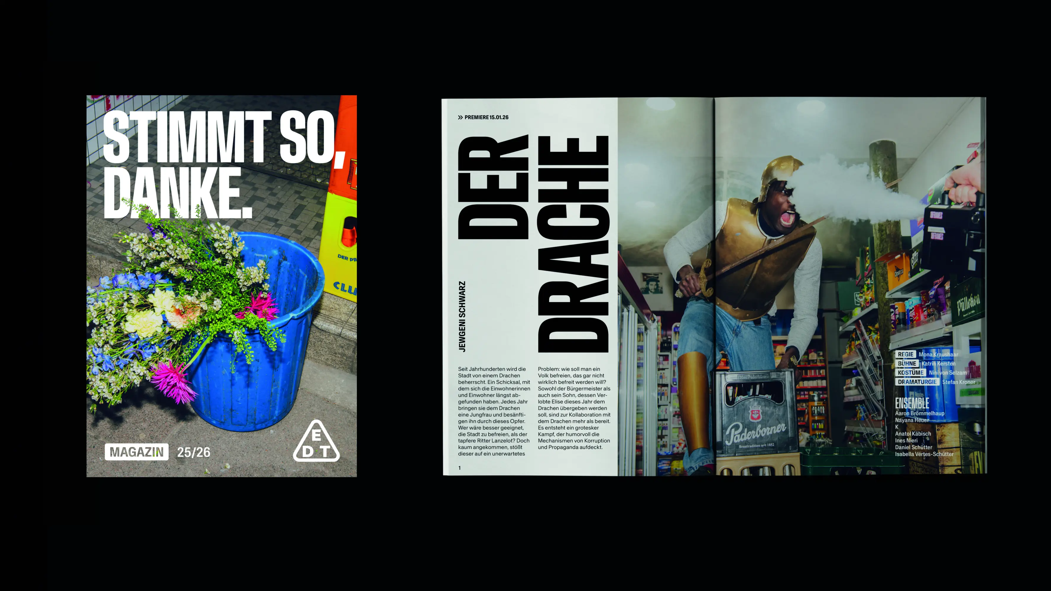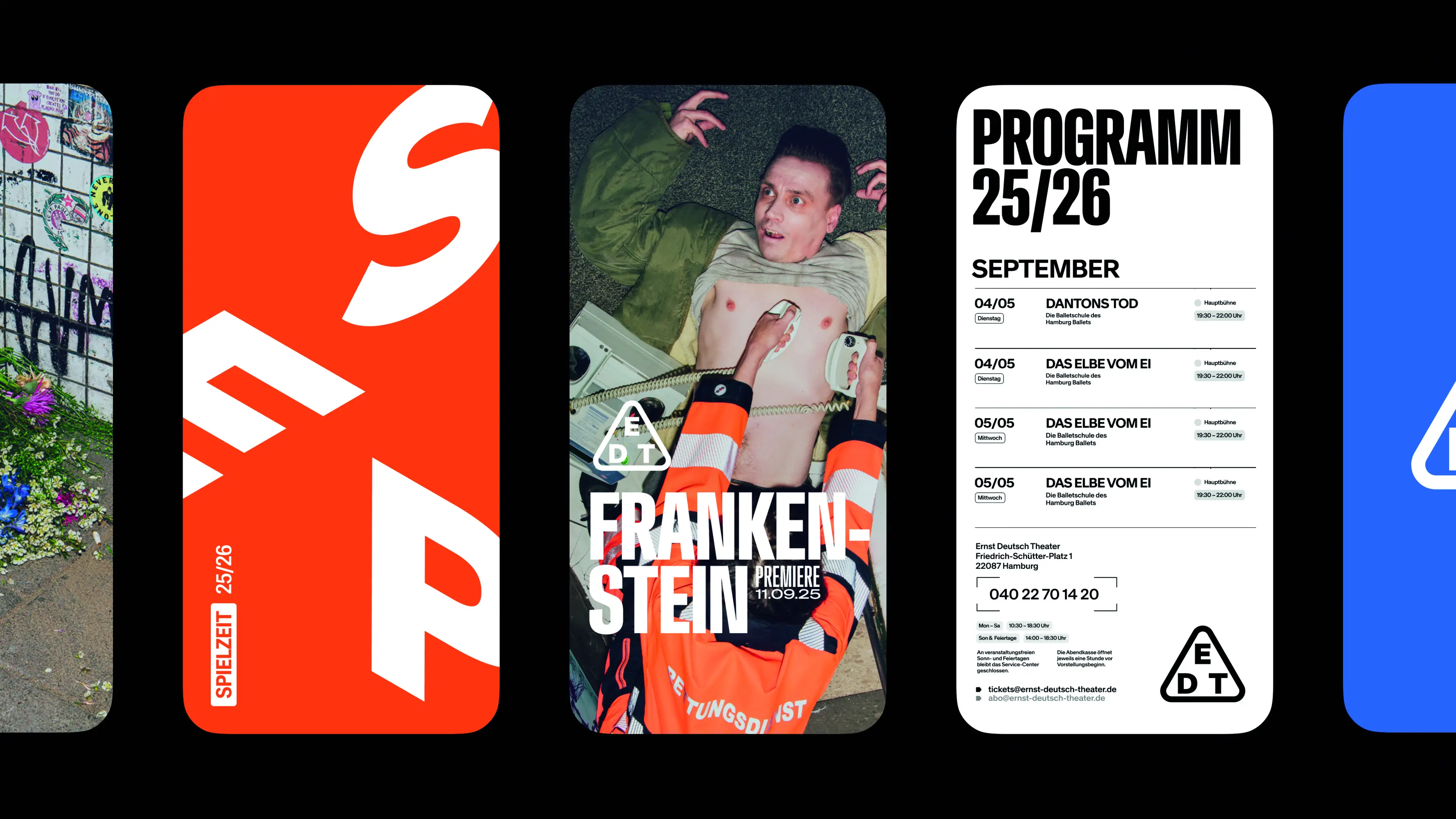 The Ernst Deutsch Theater rebranding merges architecture with urban aesthetics. The logo derives from the triangular shape of the forecourt, transformed into a striking signet. A brutalist design approach adds strength, featuring typography inspired by industrial manufacturers and equipment data, creating a bold and contemporary presence. The result is a visual identity that highlights the venue’s architectural uniqueness while emphasising its cultural relevance and modern appeal.