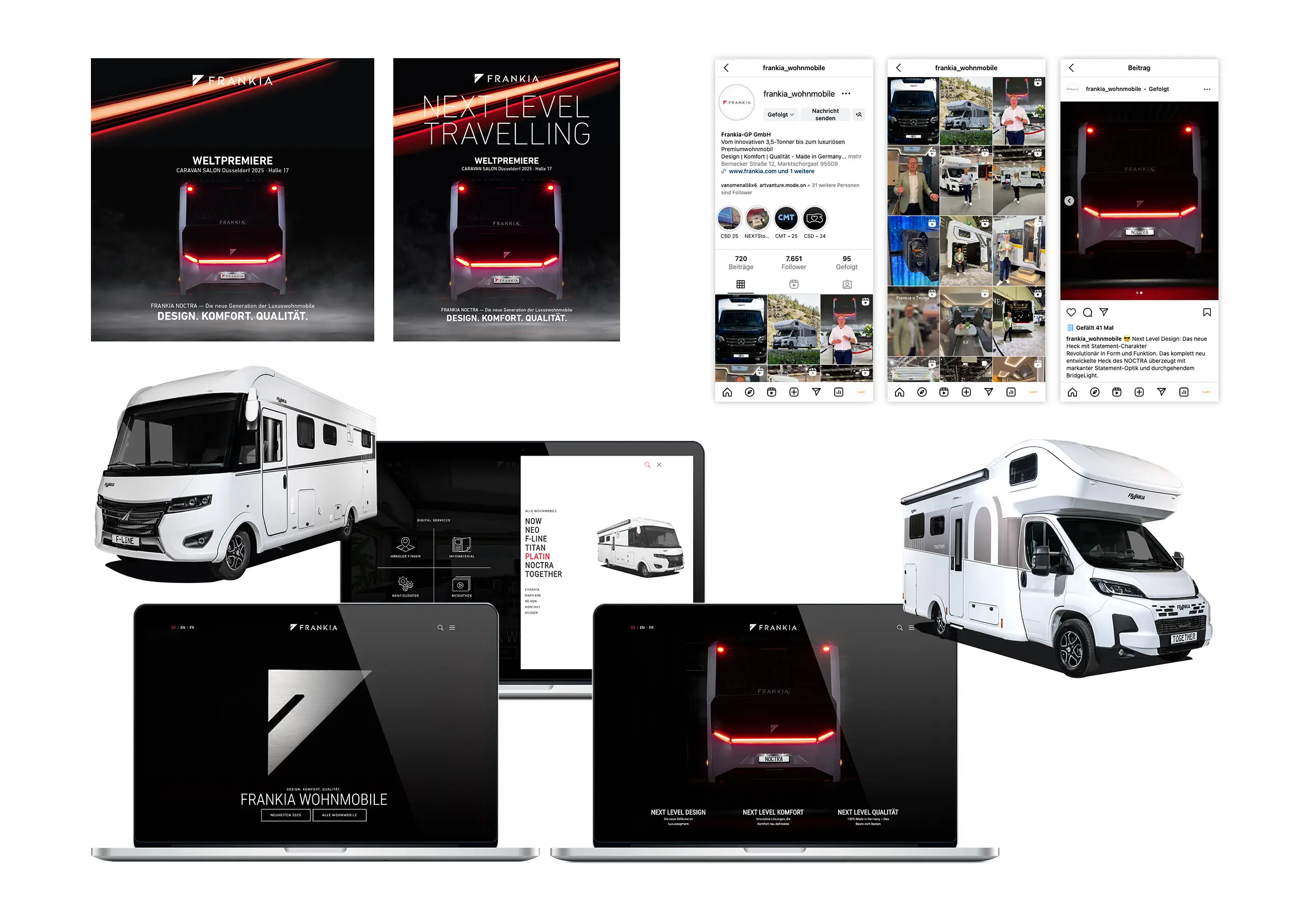 The new brand design for FRANKIA was developed as part of a strategic realignment and marks the transformation into a future-orientated design brand in the motorhome segment. Our work includes the creation of a modern corporate design and a clear word and figurative mark, consistently applied across website, social media, brochures (print and digital), trade fair presence, advertisements, and product photography. This holistic strategy provides the industry leader with maximum clarity and recognition for its international presence and underscores the company’s core values: Design. Comfort. Quality. – “Made in Germany.”