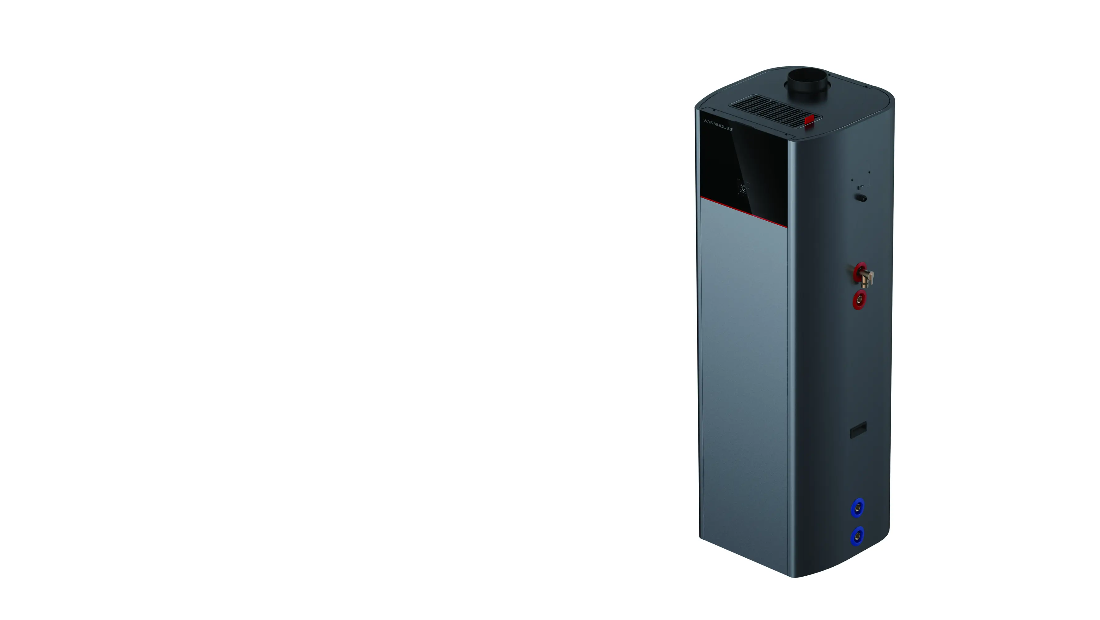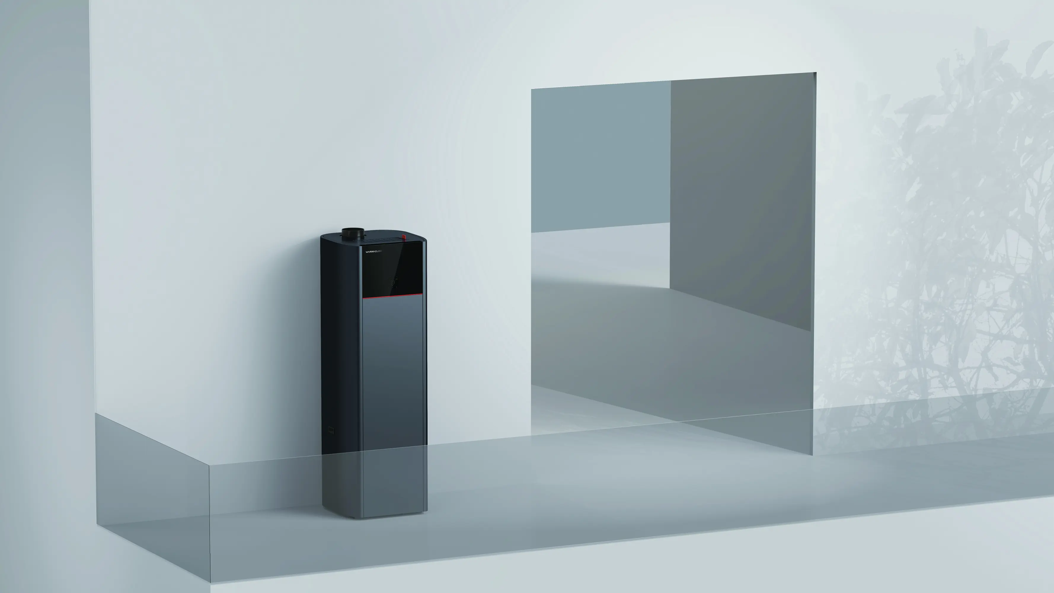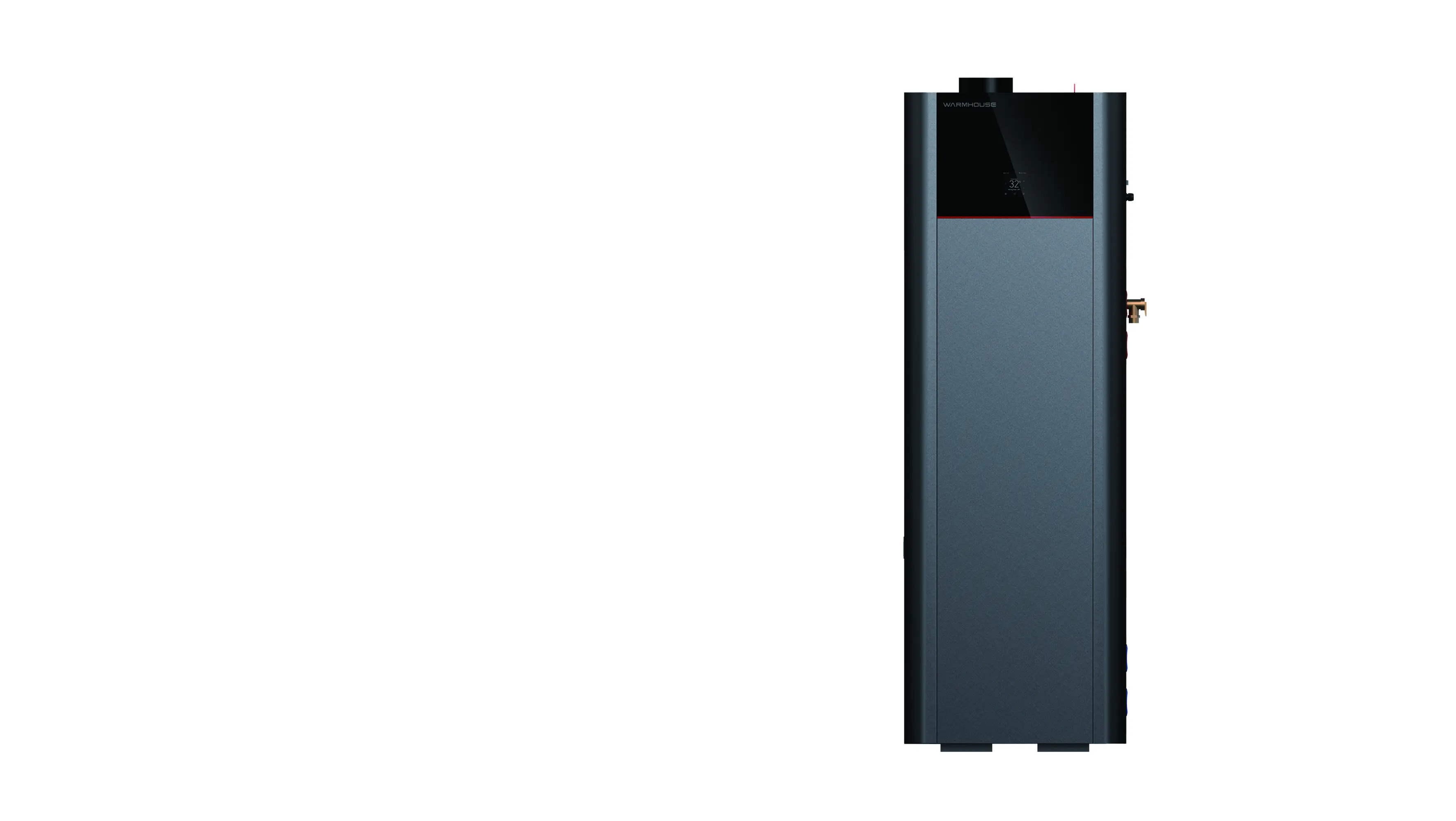 This integrated heat pump provides domestic hot water and is inspired by the shape of a water droplet. Its sleek, rounded design with a large glass display and curved metal sides reflects a modern, tech-savvy aesthetic. It supports both side and top air intake modes, adapting to various home settings such as balconies or basements. Using eco-friendly R290 refrigerant, it extracts heat from the air to reduce carbon emissions and save energy.