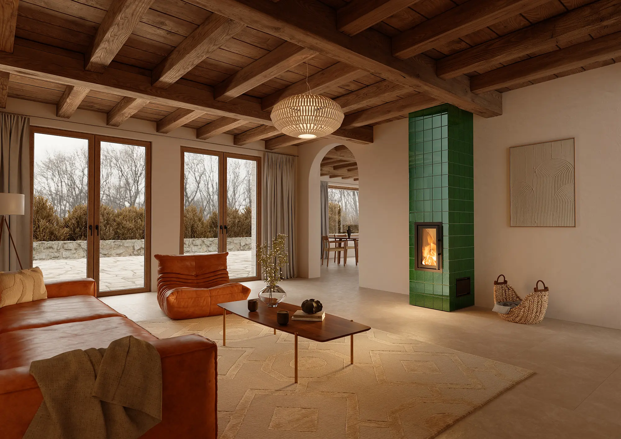 Erlutherm – Where warmth meets design. The first storage stove inside a chimney combines technology, comfort, and aesthetics in the most compact form. Perfectly suited for modern new builds and energy-efficient homes.