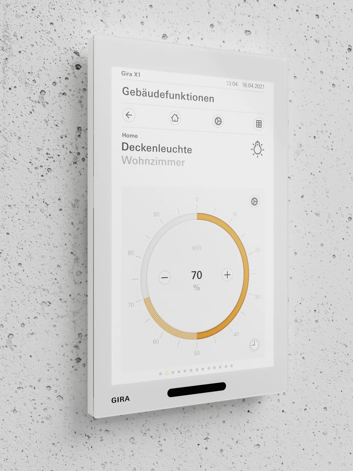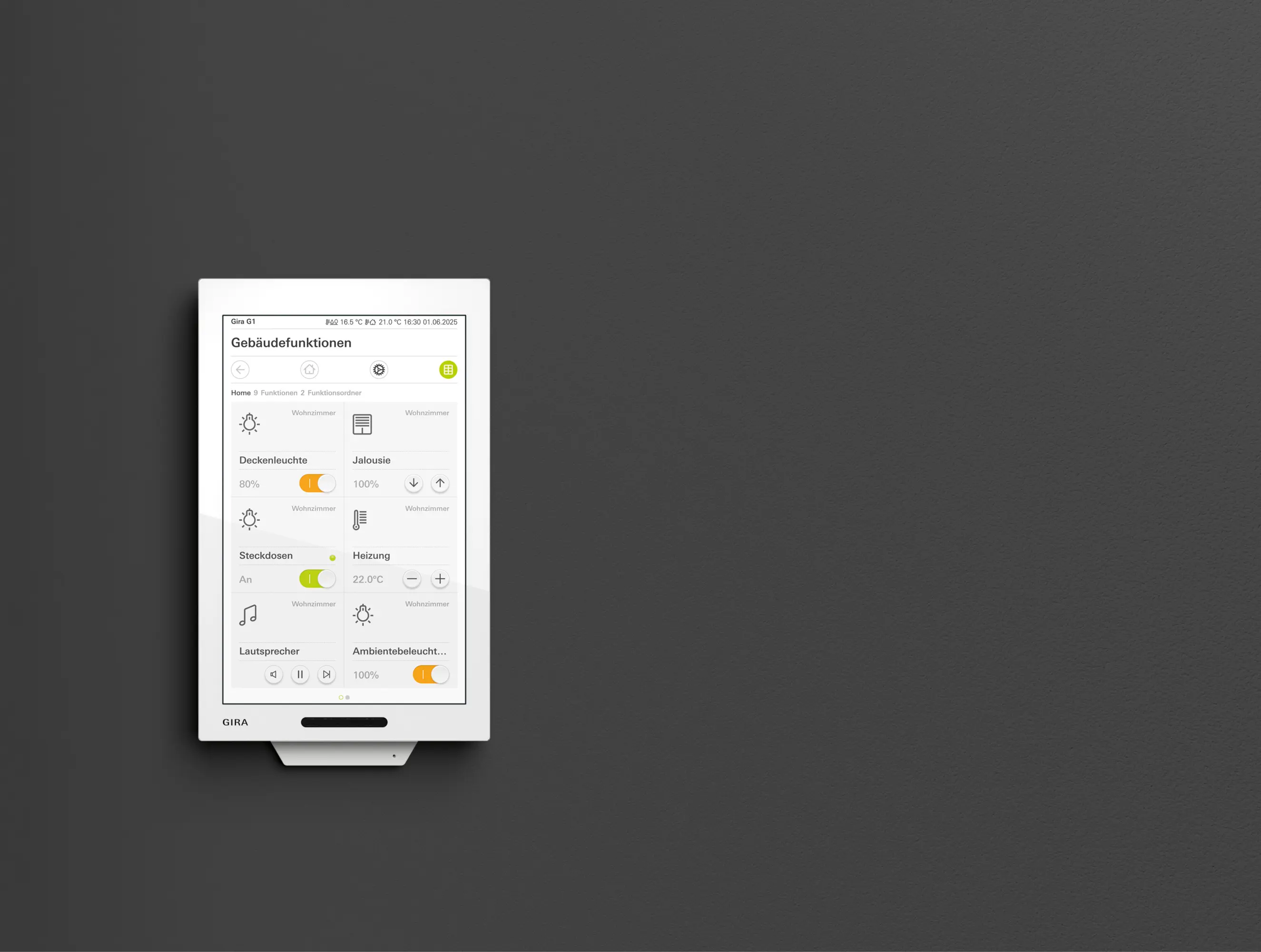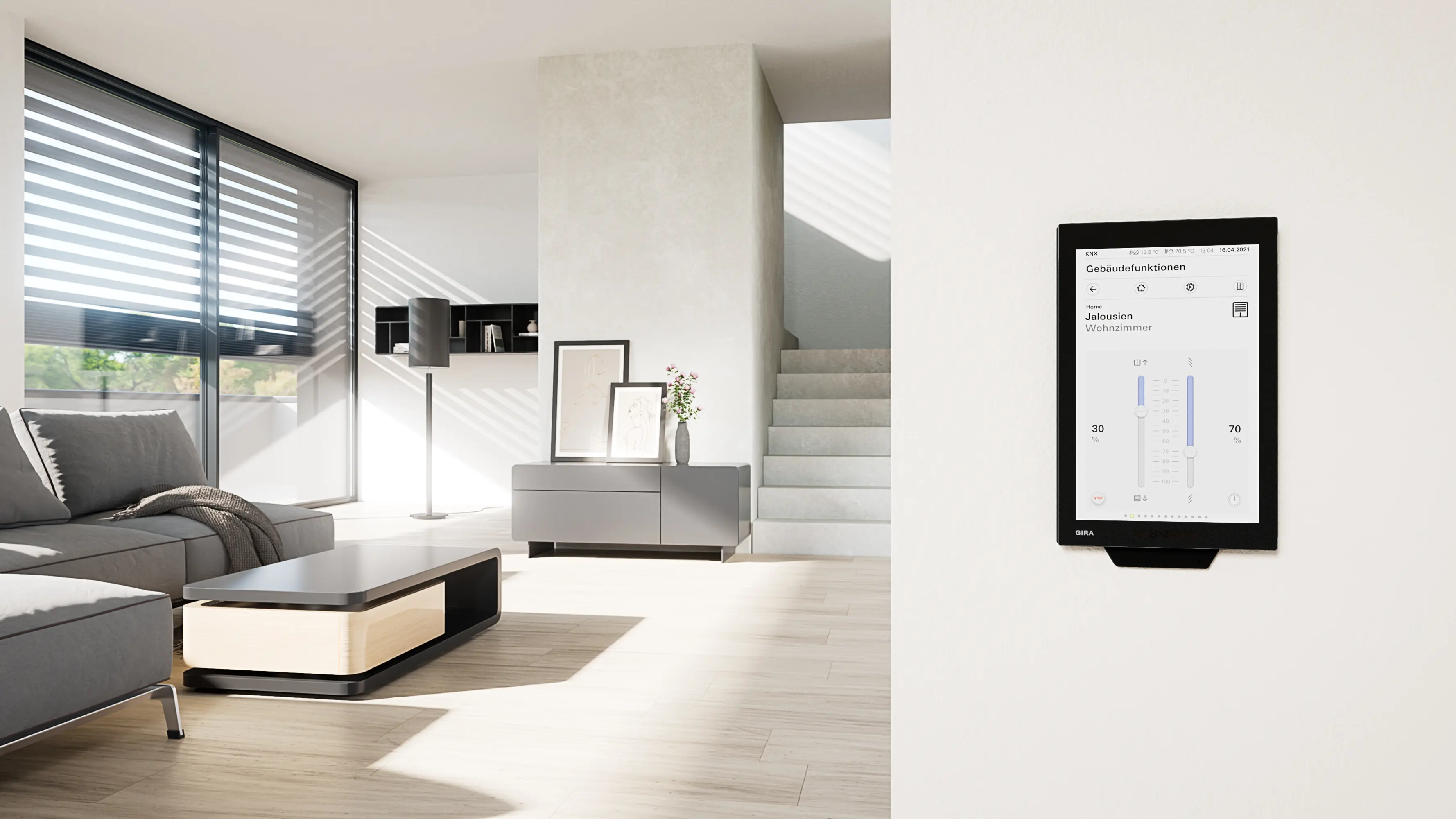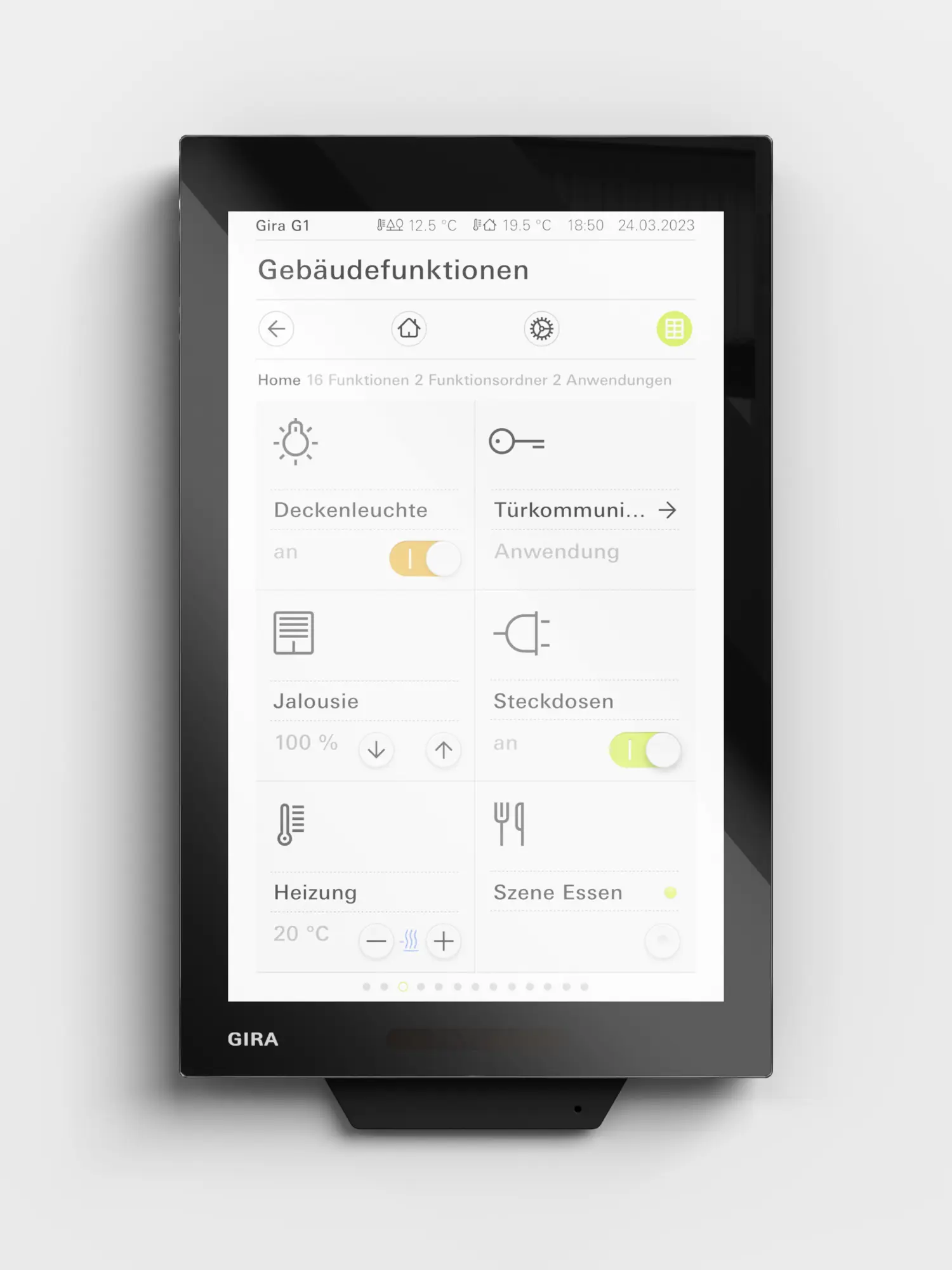 The Gira G1 combines modern technology with elegant design, making it the central control unit for every smart home. All building functions can be conveniently operated via the brilliant 7-inch touch display - from door communication to light and climate control to operating the blinds. With its minimalist design, available in black or white, the Gira G1 blends harmoniously into any modern living environment.