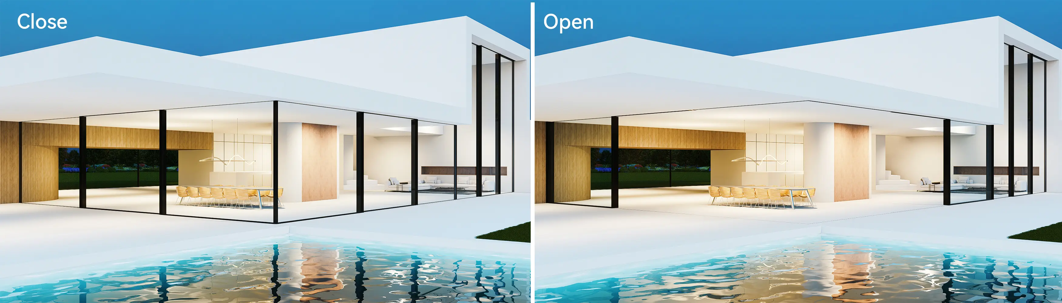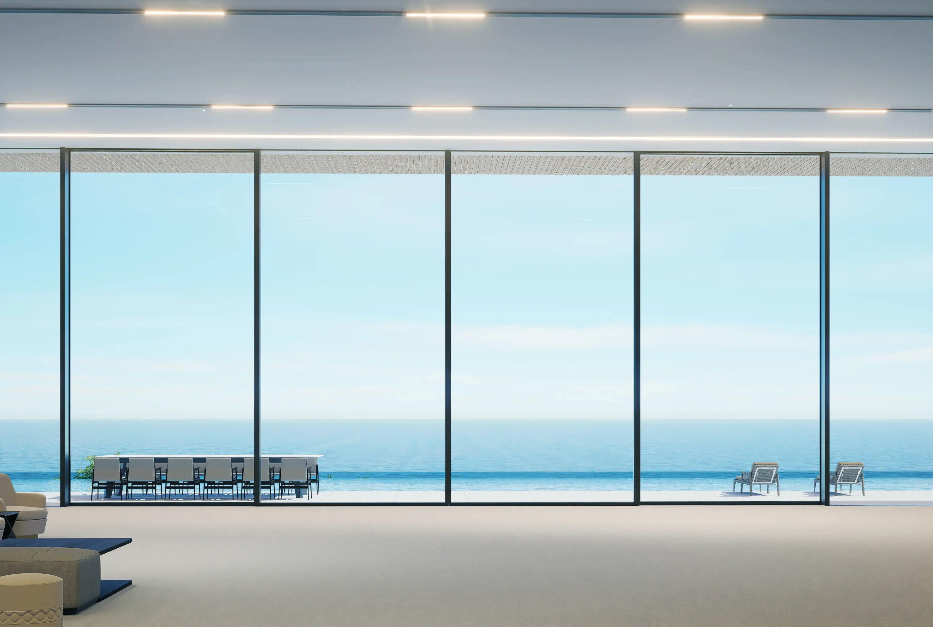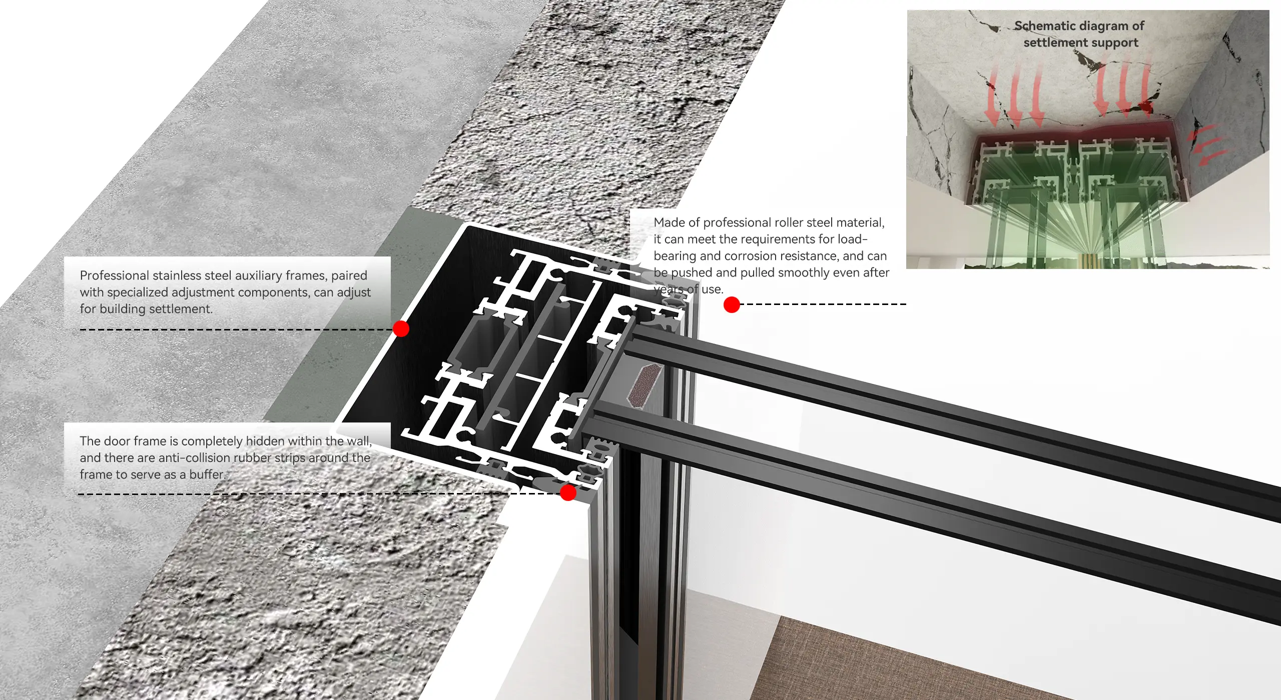 The I85 Panoramic Sliding Door System is currently the only door and window solution capable of addressing sudden and uneven settlement in buildings. The key lies in the adjustment space reserved in the frame, buffer strips, and dedicated adjustment mechanisms, enabling displacement compensation after structural deformation. The adaptive pulley system can autonomously absorb track offsets. The I85 integrates curtain walls, doors, and windows, eliminating all excess aluminum materials to achieve visual seamless fusion, and supports free combinations according to the building facade layout to attain the optimal panoramic effect.
