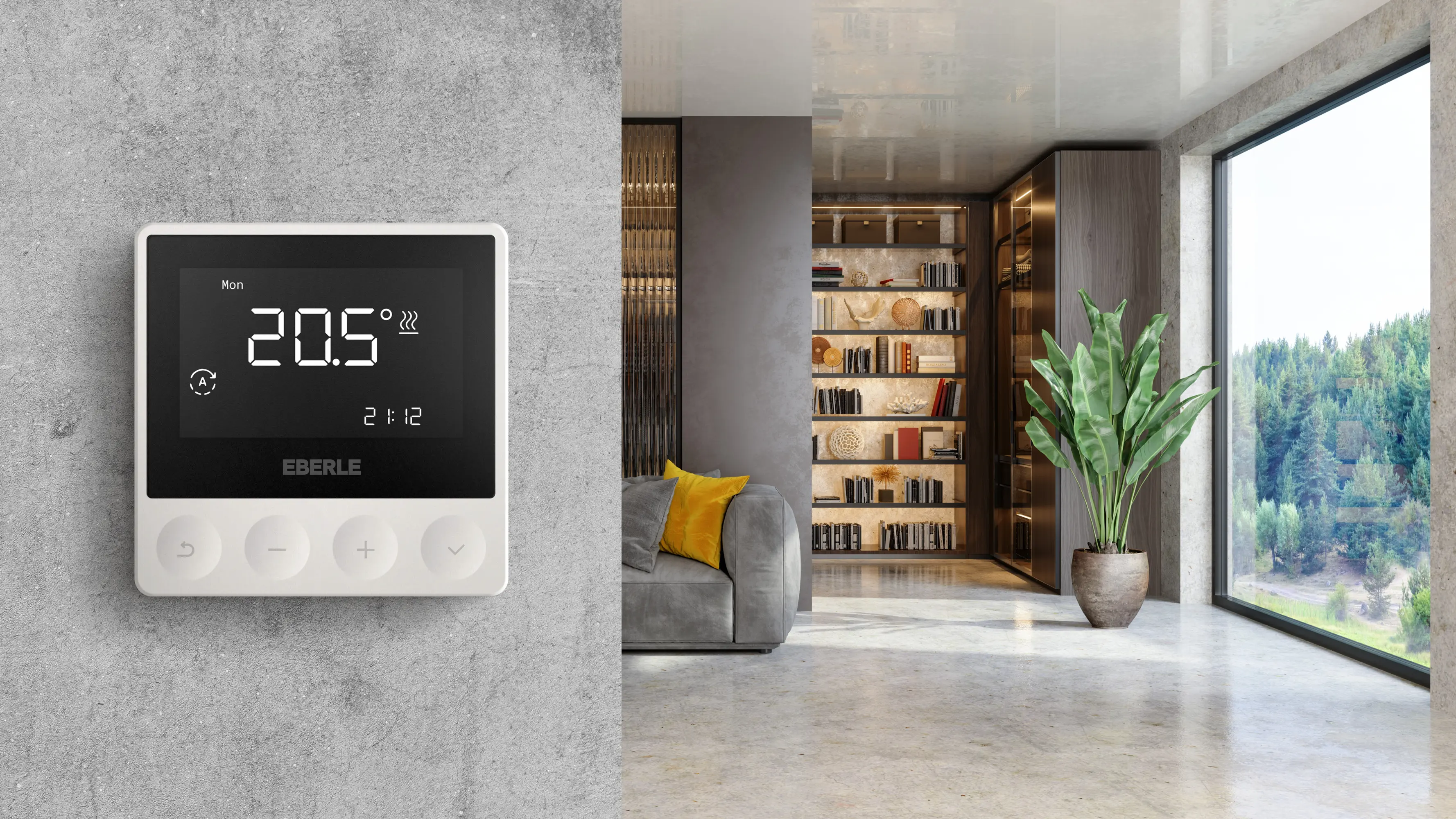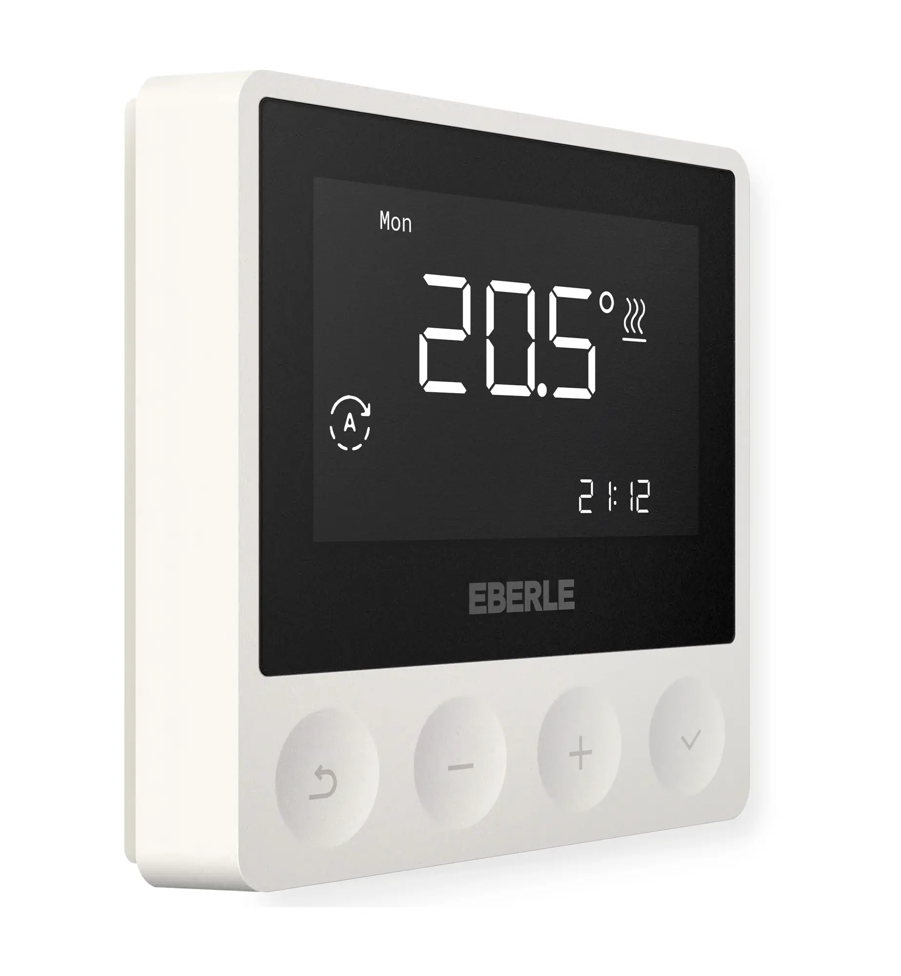 EBERLE's new surface-mounted temperature controller ATR 4000 impresses with its modern design, easy installation and intuitive operation. The digital surface-mounted controller has a high-quality look due to its low installation height of 21 mm, its compact format of 86x86 mm and its timeless colour. The large, elegant screen with digital display can be controlled via an intuitive menu. The black background with white lettering makes it easy to read the display, even in the dark. The ATR 4000 is available in the heating/cooling version (ATR 4500) and the Advanced version (ATR 4800) – both models comply with the EU Ecodesign Directive LOT20.