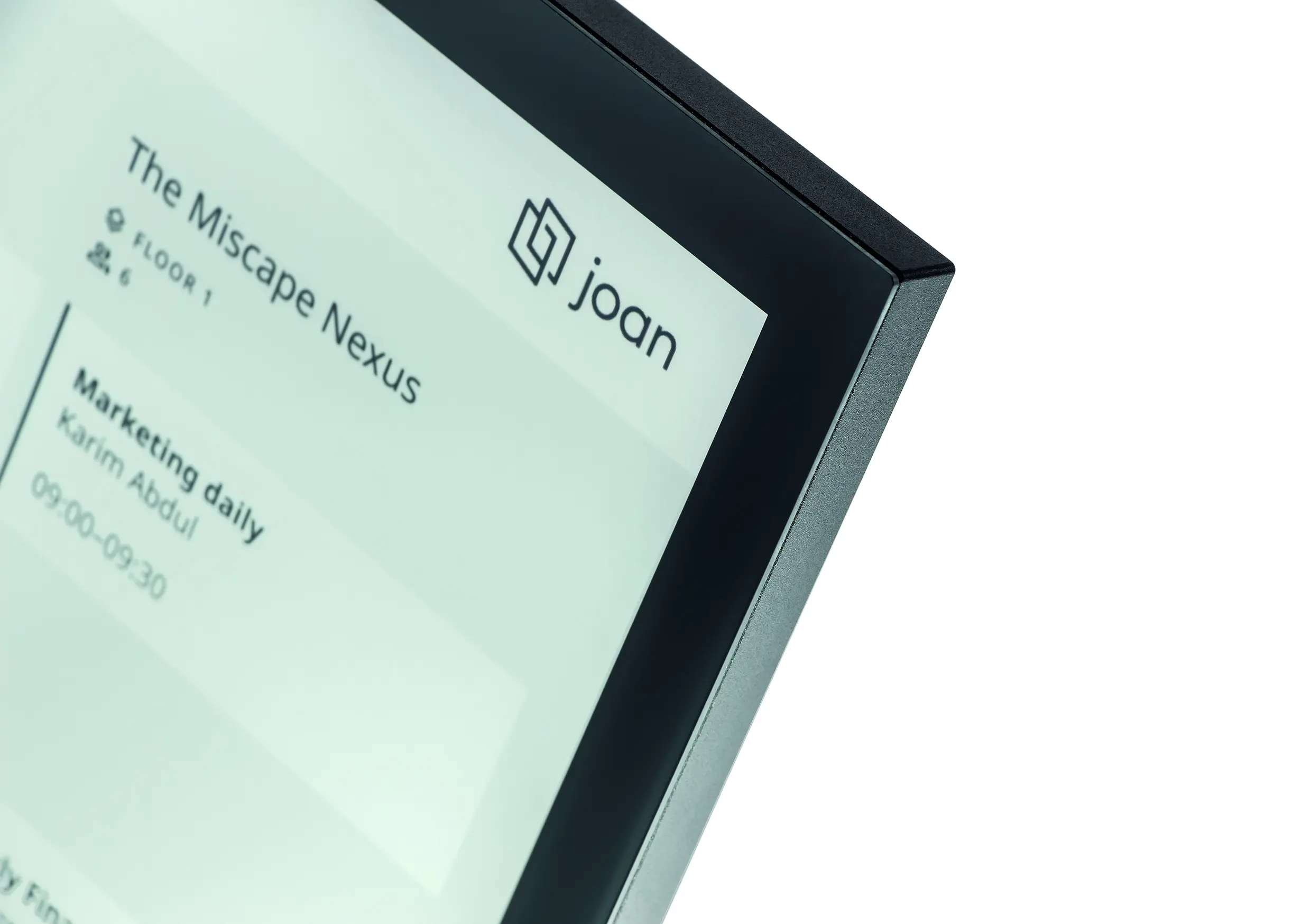 Joan 13 Pro is a multifunctional scheduler that connects to company calendars like Google or Teams. Its interactive, large touch-screen allows viewing and booking any meeting room in the company from a single display. If the selected room is occupied, switch from single-room to multi-room view and book another available room directly—no need to walk around. The Smart magnet enables wireless mounting anywhere and stores settings for all configured rooms. Made from aluminum and glass, it blends into any office. Its energy-efficient ePaper display lasts up to six months and supports sustainability efforts.