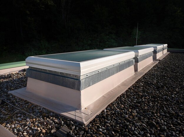 Thanks to its optimized insulation core and the warm edge in the standard quadruple-glazed insulating glazing, the LAMILUX flat roof window FE Passivhaus meets the Passive House efficiency class phC and the criteria for the cool-temperate climate zone with a low heat transmission coefficient Usk of 0.85 W/m²K. Additionally, the structural glazing design with 5° inclined upstands ensures optimal water drainage and clean panes. Besides its function as a natural smoke and heat extraction system, the skylight creates a light-filled, architecturally appealing atmosphere that meets modern design standards."