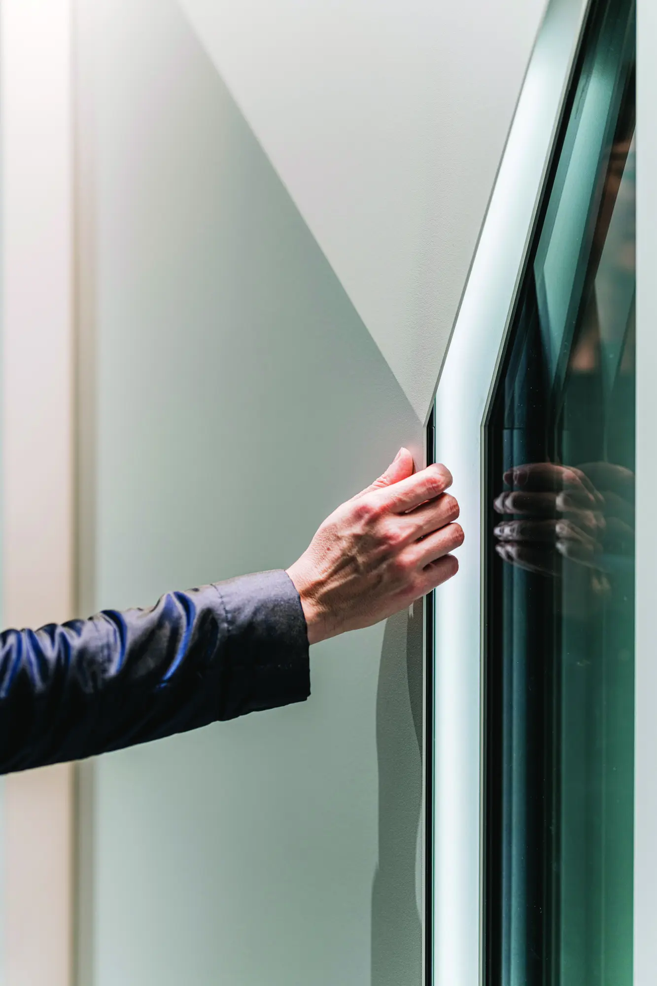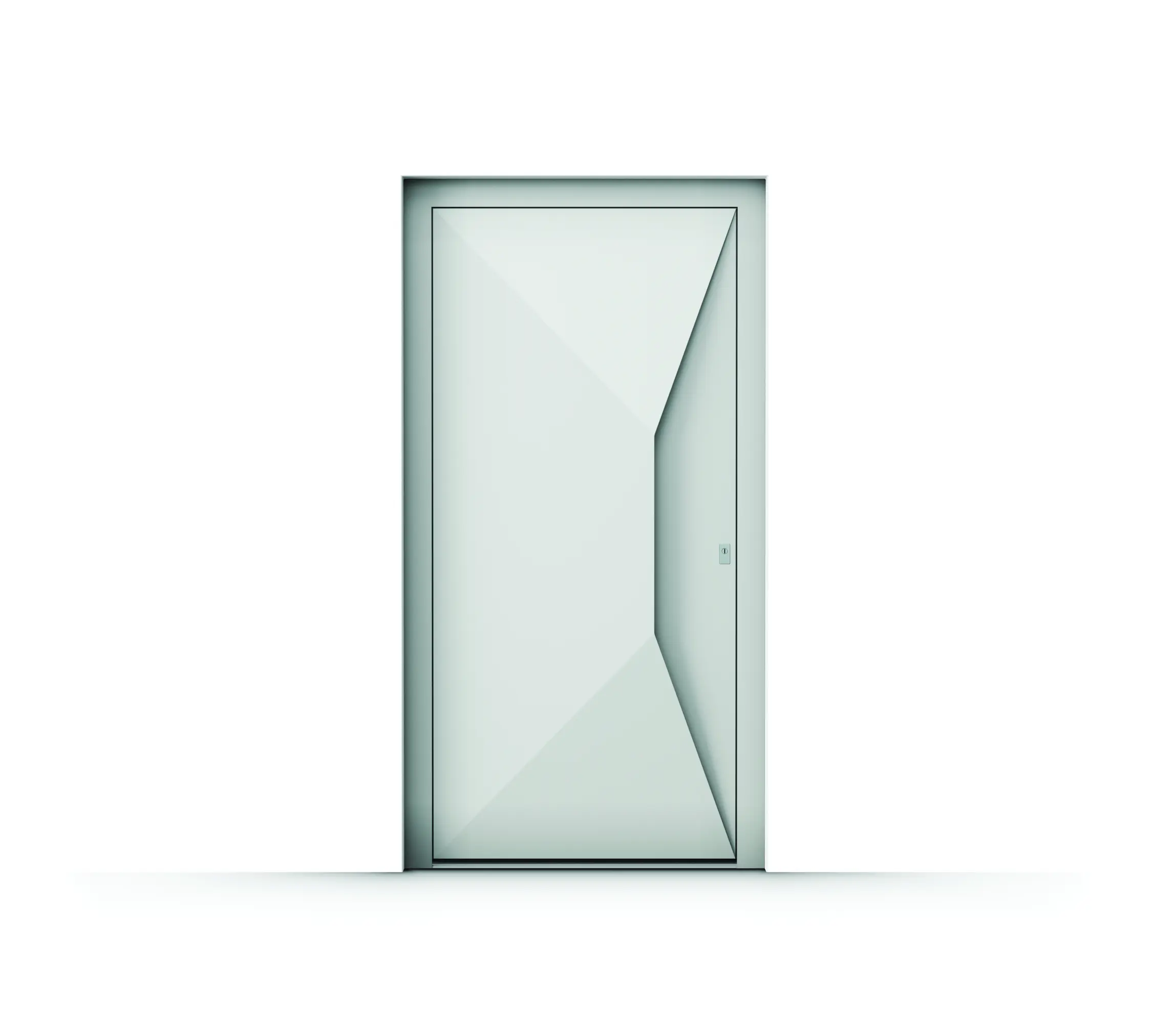 Letter is an entrance door that boldly transforms a flat plane into a three-dimensional form. Its design originates from the concept of a single line drawn from a flat surface, pulling the surrounding planes forward. This innovative approach allows for effortless opening and closing without the need for a traditional handle; instead, a functional slot is formed from the elevated surfaces. The production process mirrors the simplicity of its form: a single aluminium plate is bent to create the final shape. The door can be crafted entirely from metal, with the option to incorporate a glass panel for added light.