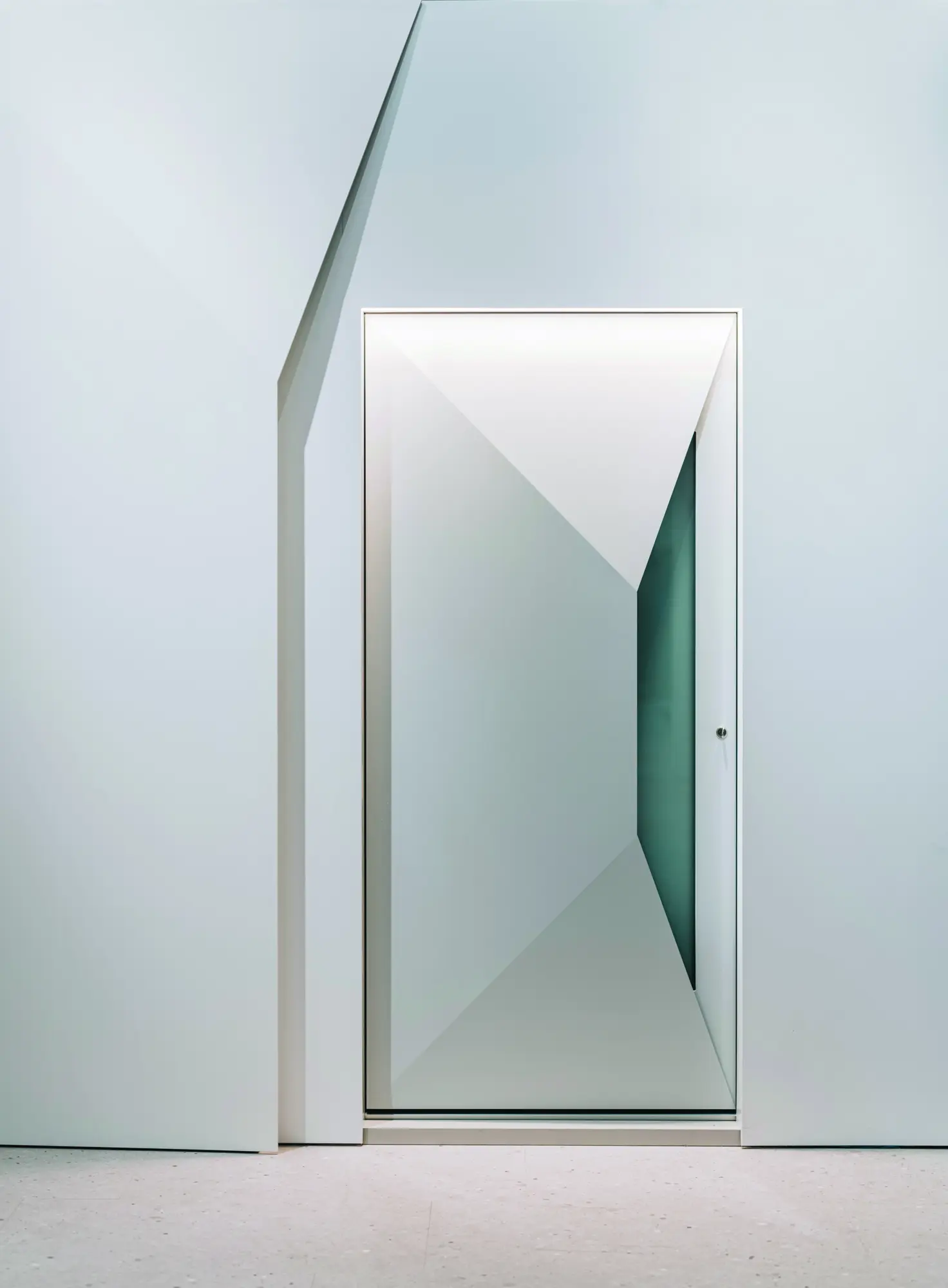 Page is an entrance door that subtly ventures into the third dimension. Its front plane gently curves toward the user, creating a space that allows light to softly filter through. Behind the curved profile, a strip of glass is seamlessly integrated, allowing natural light to enter the home. The door's lightweight design ensures effortless opening and closing. It can be opened using either the curved profile or the integrated handle on the opposite side of the curve. For added refinement, the door can include built-in LED lighting, accentuating the subtle curved detail.