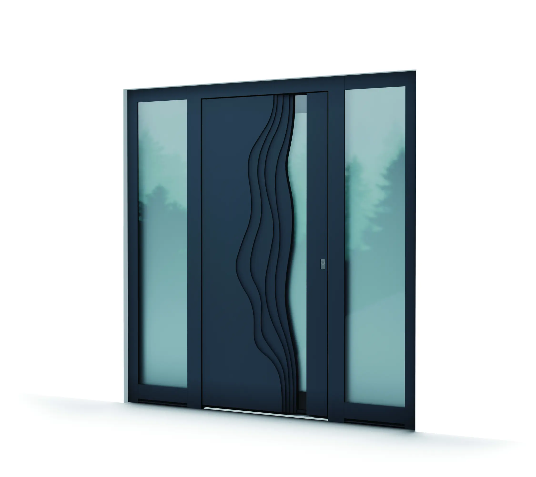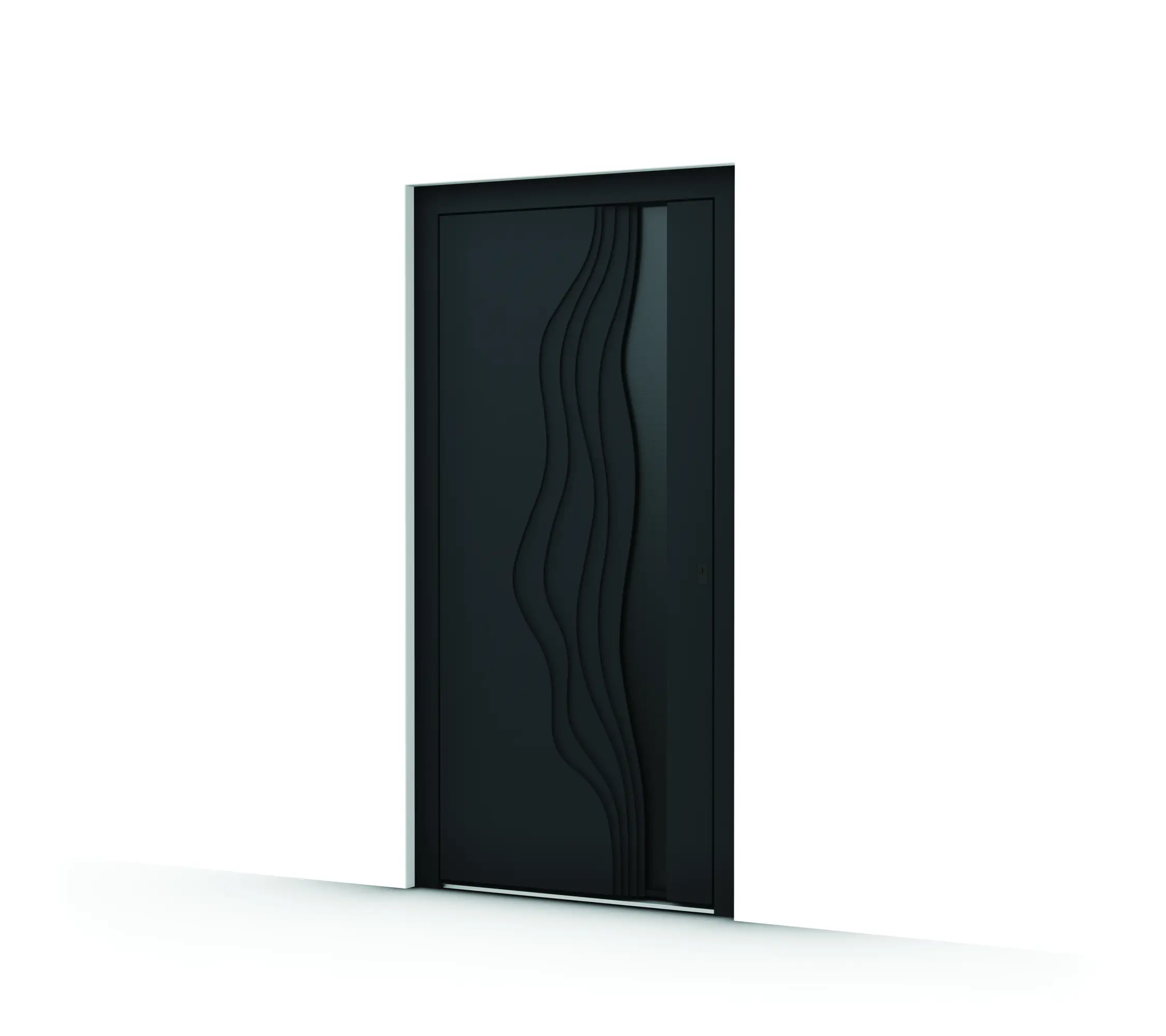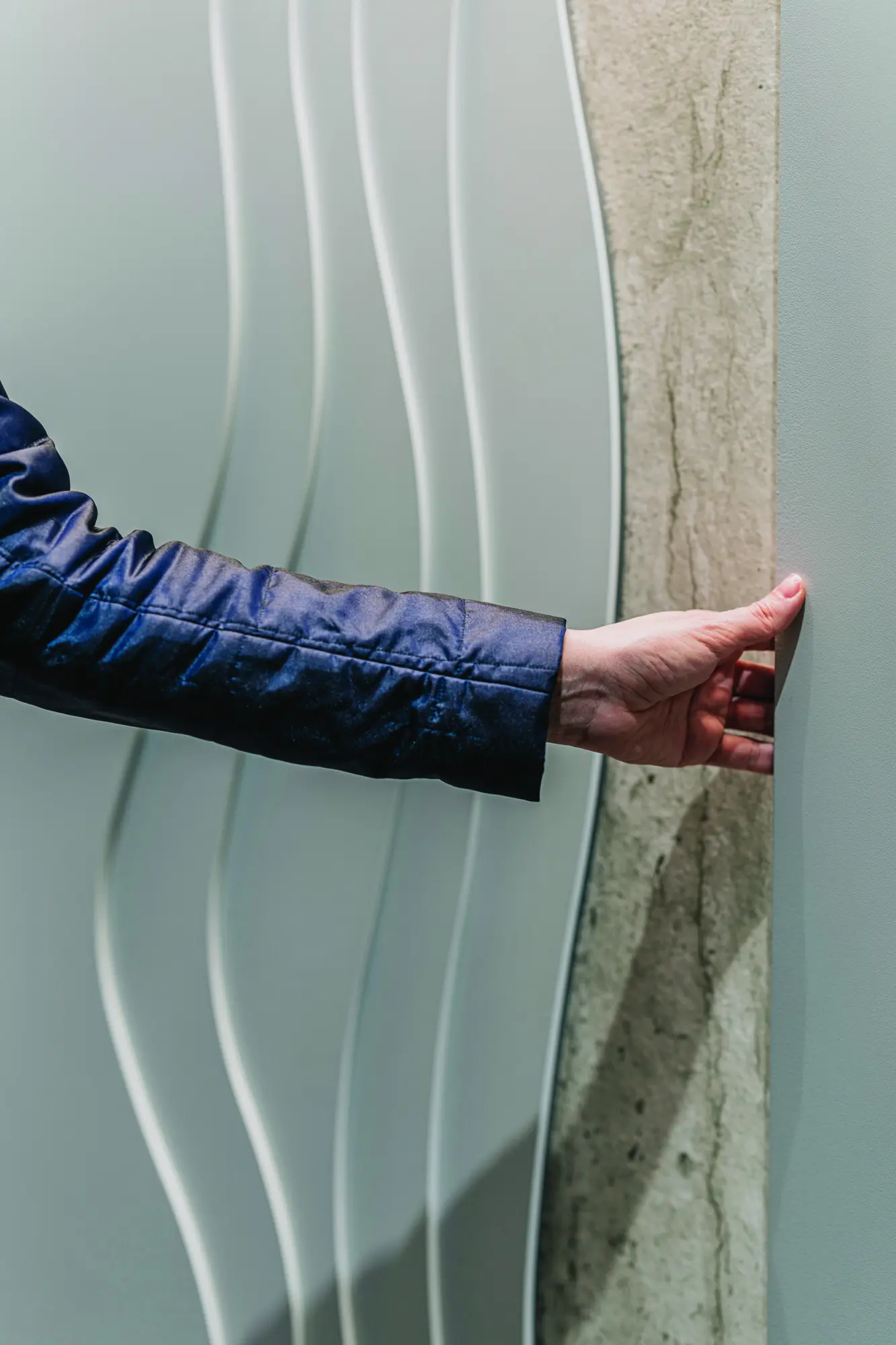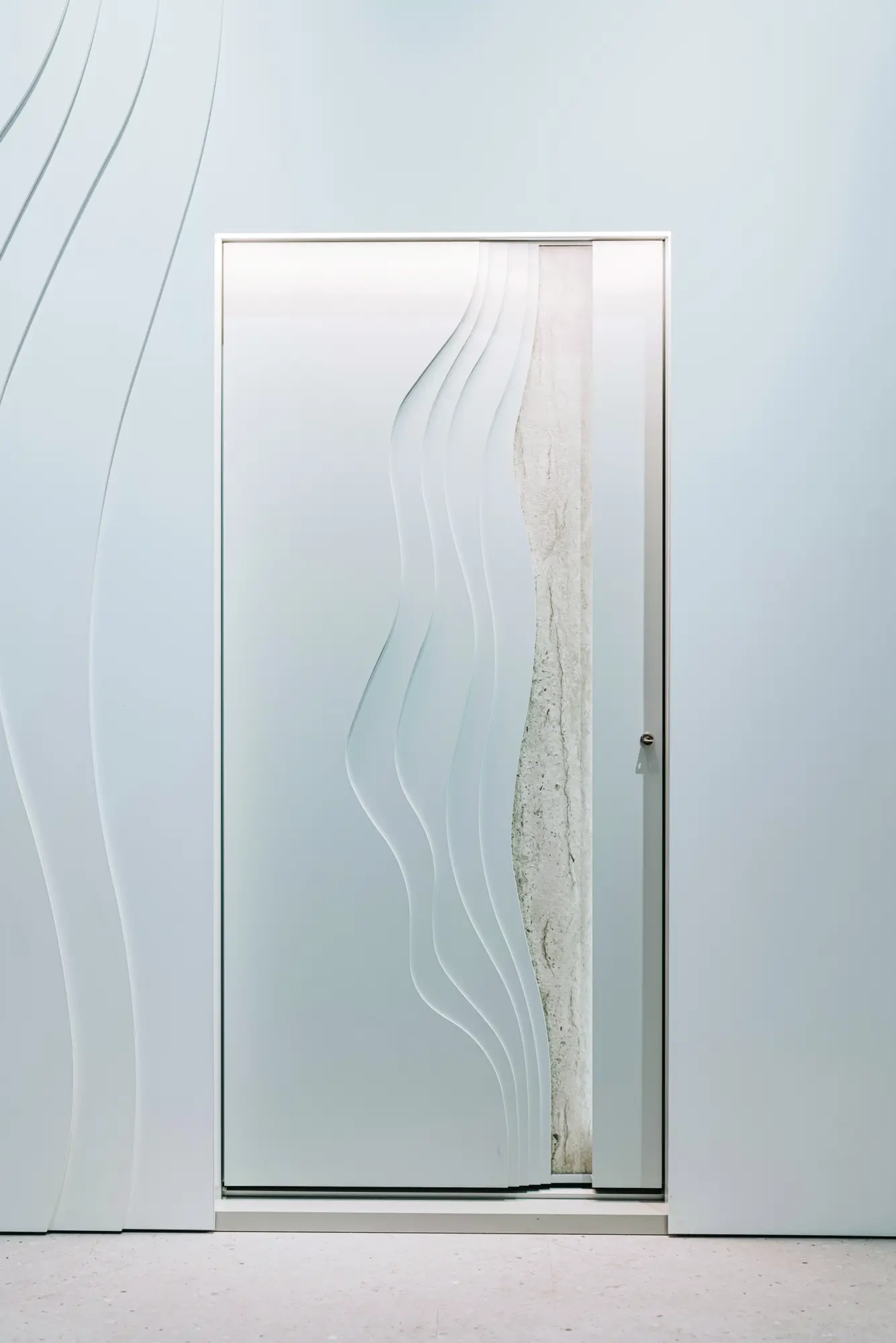 Terra is an entrance door that reimagines the concept of the door as a three-dimensional object. Its design draws inspiration from the isohypses of mapped terrain. The lines of the map are transposed onto the vertical surface, each forming the contours of layered aluminium plates. These layers gradually recede to reveal a deeper core made of aluminium, ceramic, stone, or glass. This exploration of depth eliminates the need for a traditional handle – the handle becomes an integral part of the door, seamlessly aligned with the door frame. Additionally, the door can be equipped with built-in LED lighting, enhancing its sculptural appearance.