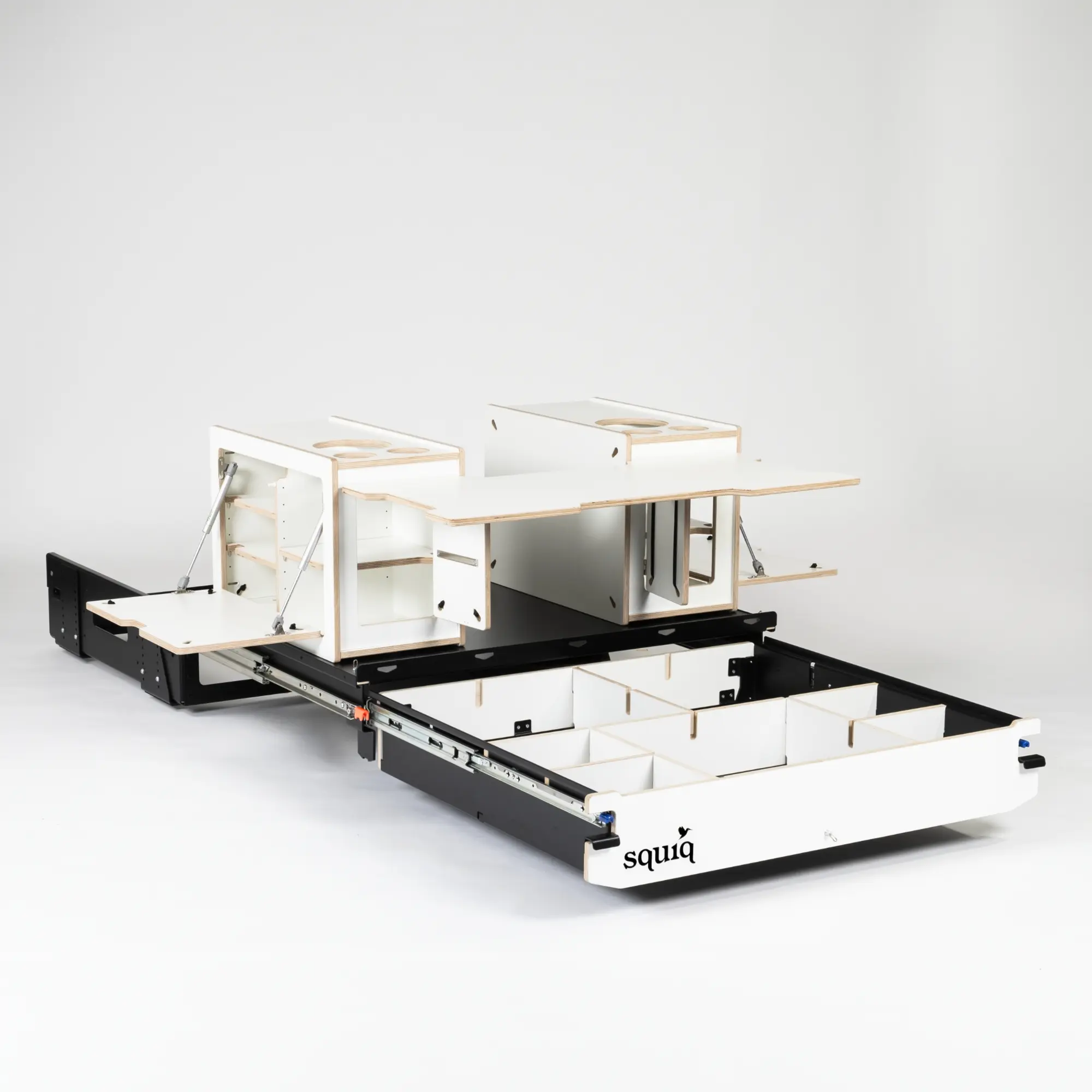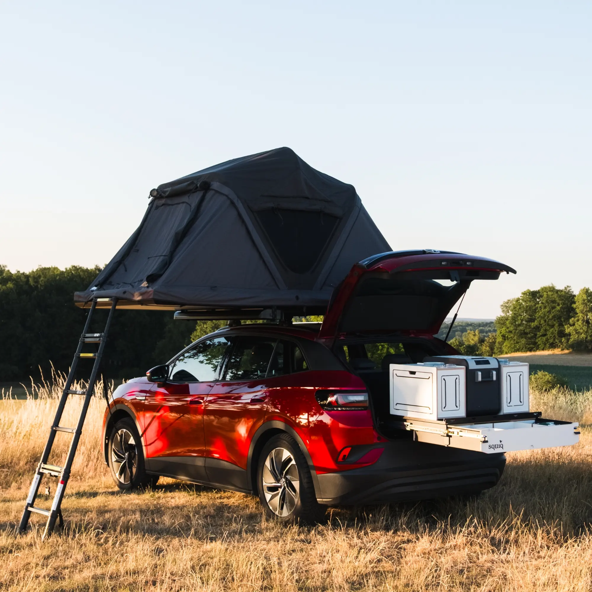The squiq Traveller is the first modular camping pull-out for car trunks, designed specifically for cars with roof top tents. With its clean design, intuitive handling and innovative concept, it transforms everyday vehicles into fully-fledged campers. It combines flexibility and comfort with a minimalist, functional design. Made from renewable, fully recyclable raw materials, it stands for sustainability and resource conservation. The squiq-Traveler sets new standards in car camping – economically, aesthetically and for the future.