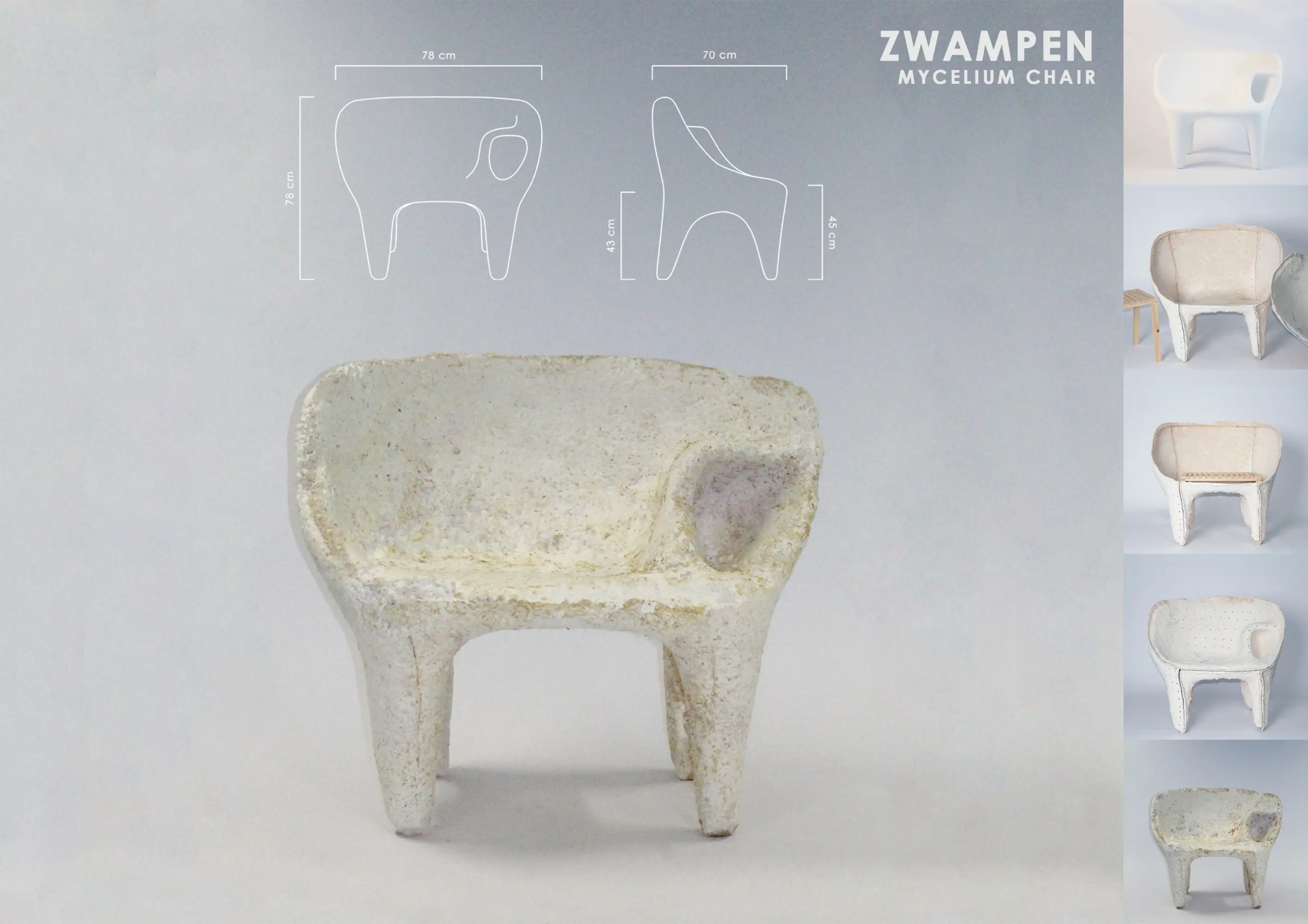 This project explores how fungi can shape sustainable design by growing furniture from a blend of spores, wood shavings, flour, water, and time. The fungal network binds these ingredients into lightweight yet durable forms, creating pieces that are as much grown as designed. Inspired by biomimicry, the furniture follows the mushroom’s own soft geometries and biological logic. The Spore Stool and Zwampen Armchair sequester carbon during growth and return nutrients to the soil at the end of life. A circular, low-tech design that transforms overlooked byproducts into living furniture for learning, reflection, and ecological engagement.