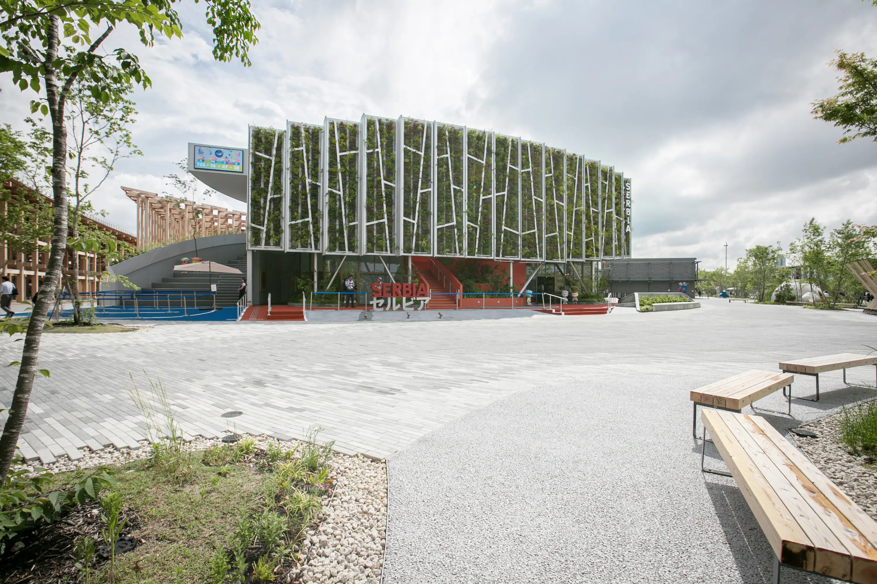 The Serbian Pavilion at Expo 2025 Osaka, designed by ALEATEK Studio, features a living façade—a bold biophilic design with 95% recyclable construction. Inspired by Belgrade’s Great War Island, its "Floating Forest" theme merges urban life with nature. Positioned at the West Entrance, it drew 10,000+ visitors on opening day. Inside, the pavilion previews Belgrade EXPO 2027’s theme—PLAY for HUMANITY—through interactive installations, thematic furniture, and a sensory "red garden" exit. The design reflects Serbia’s commitment to sustainability, play, and cultural identity.