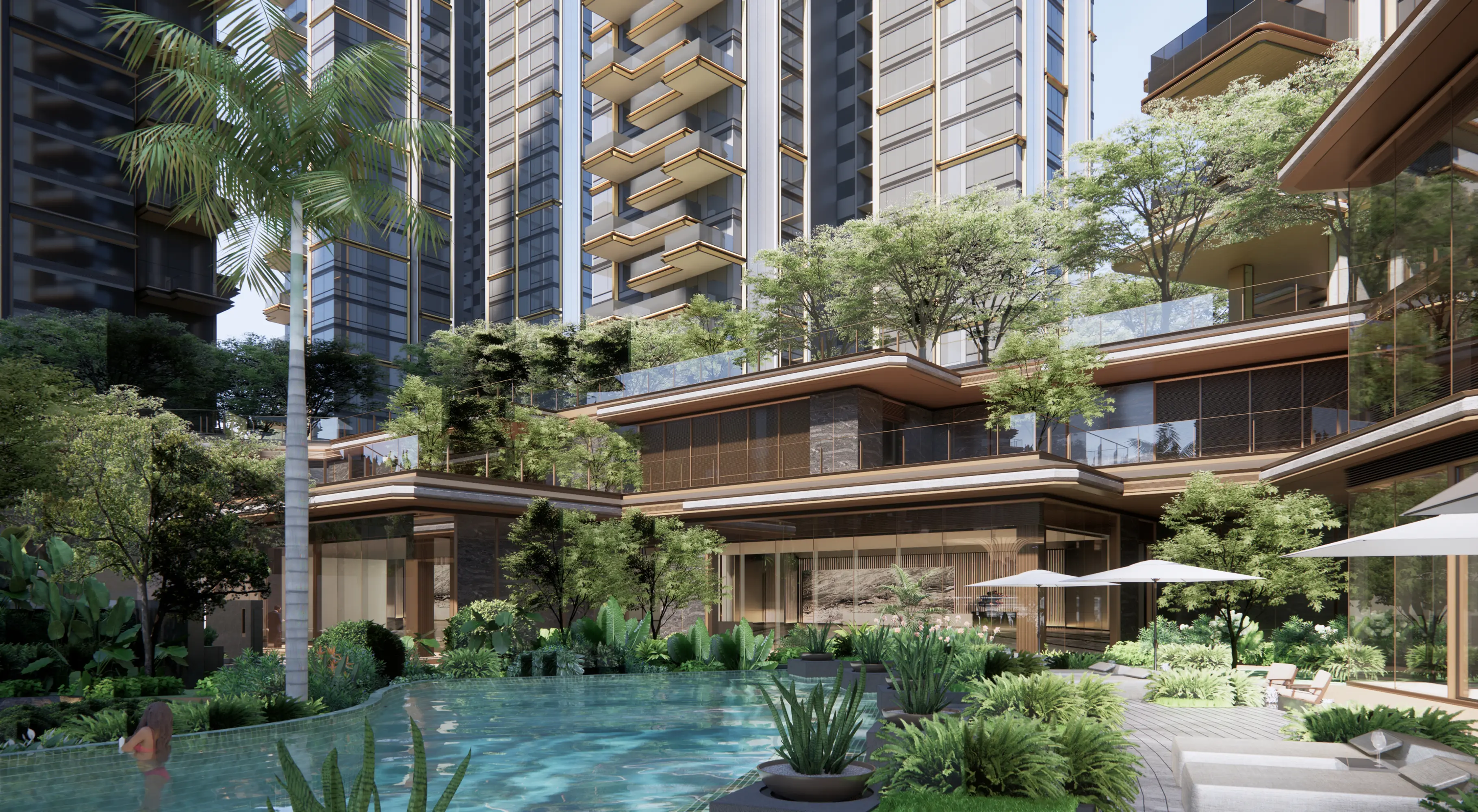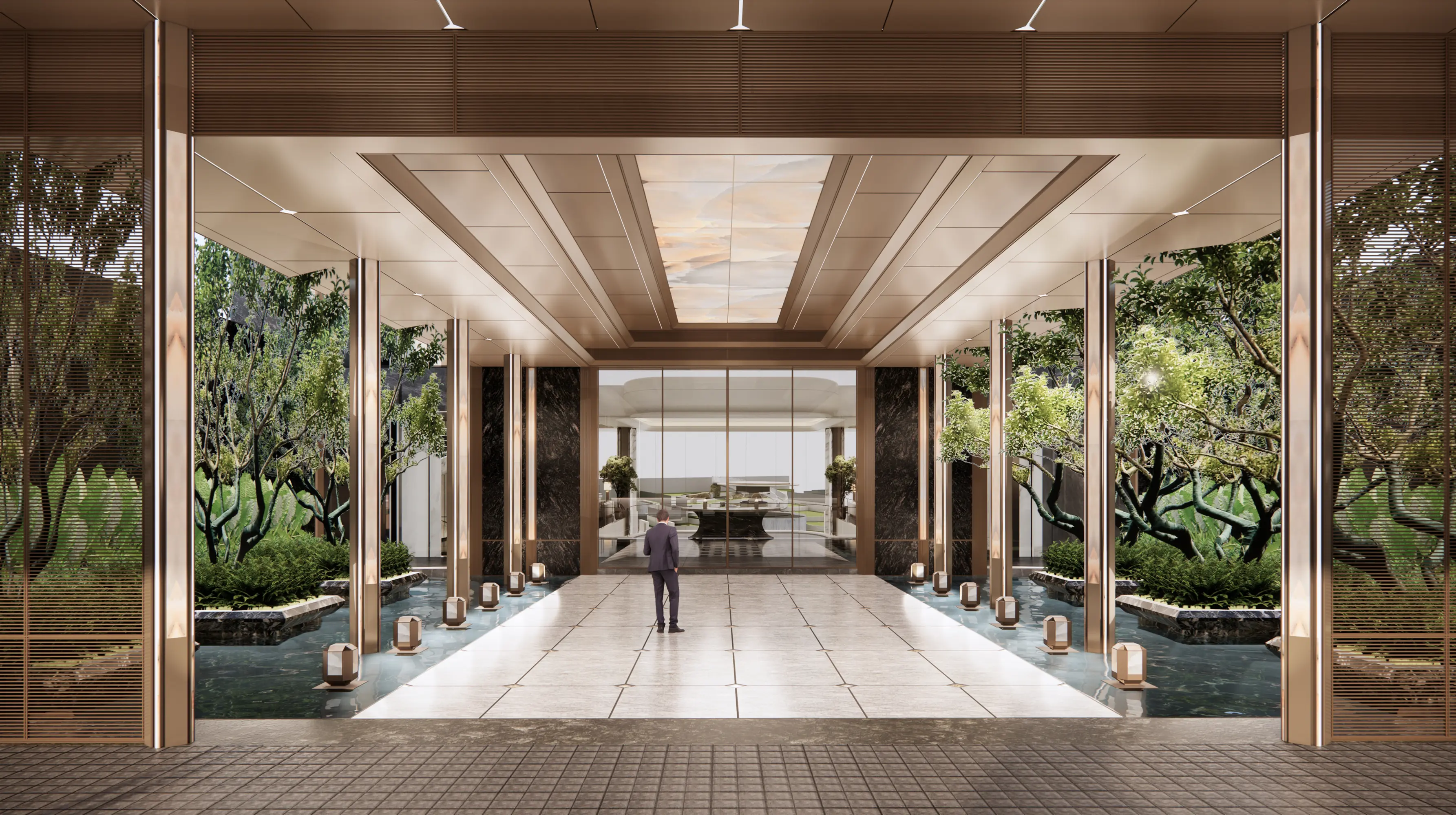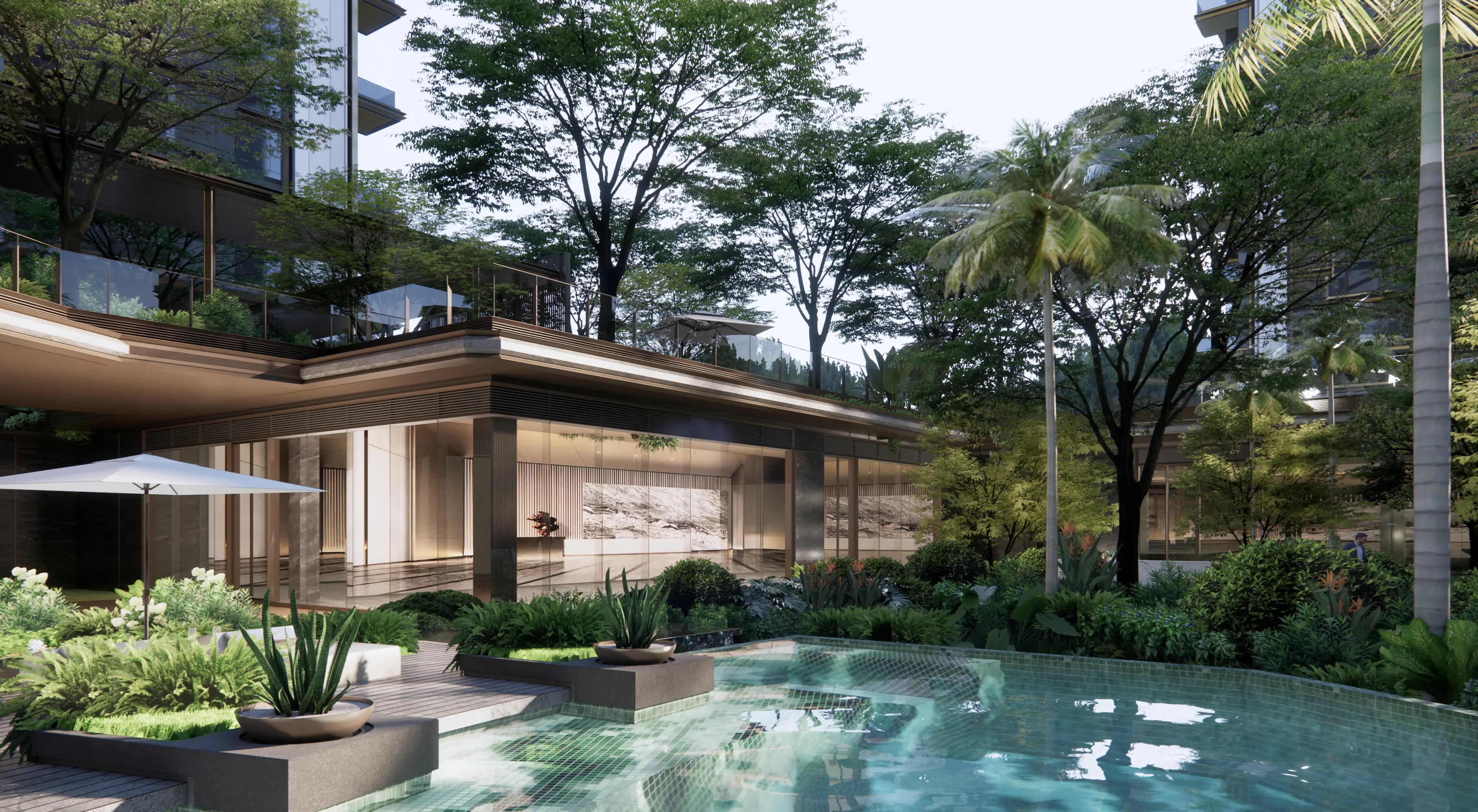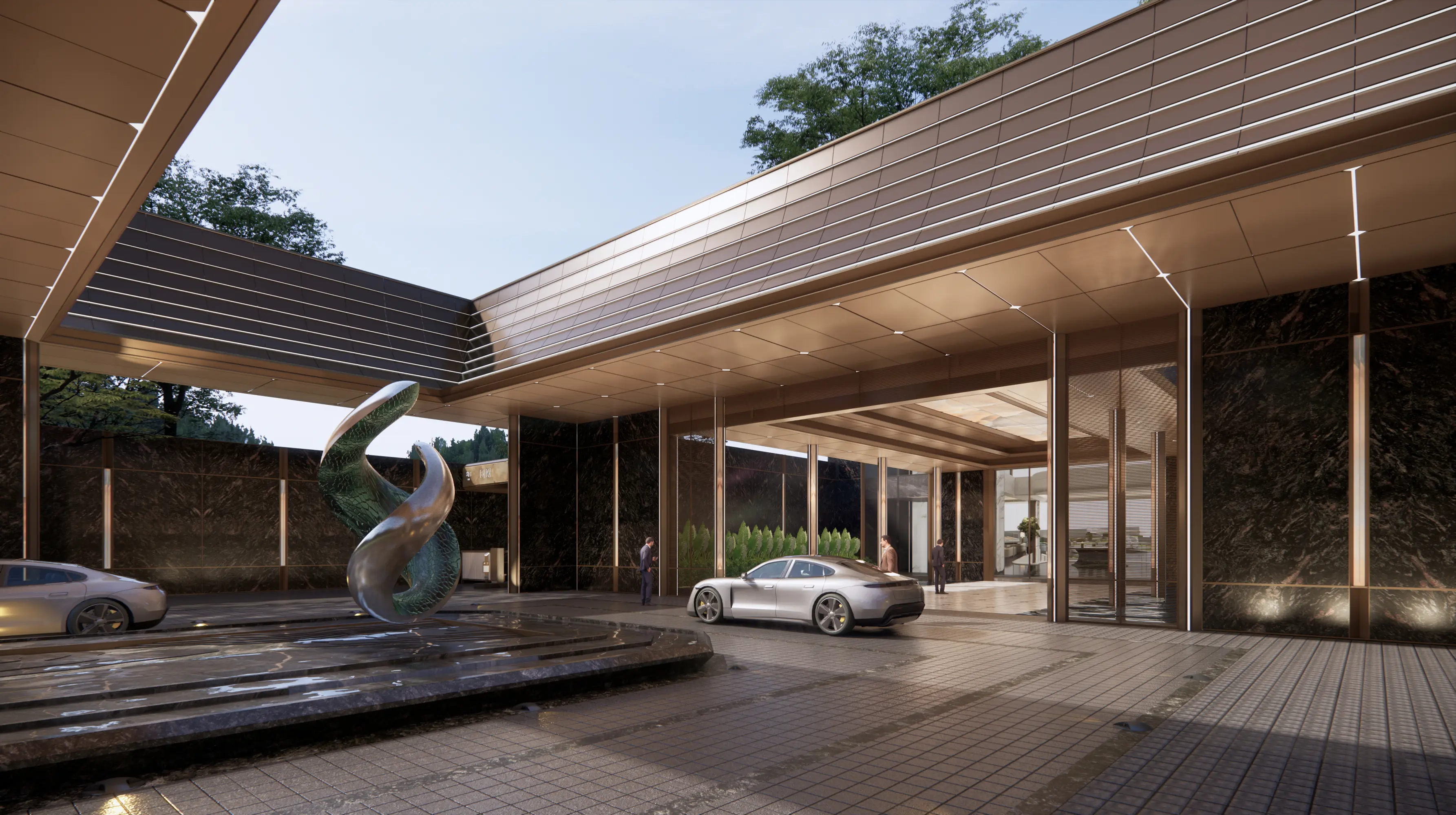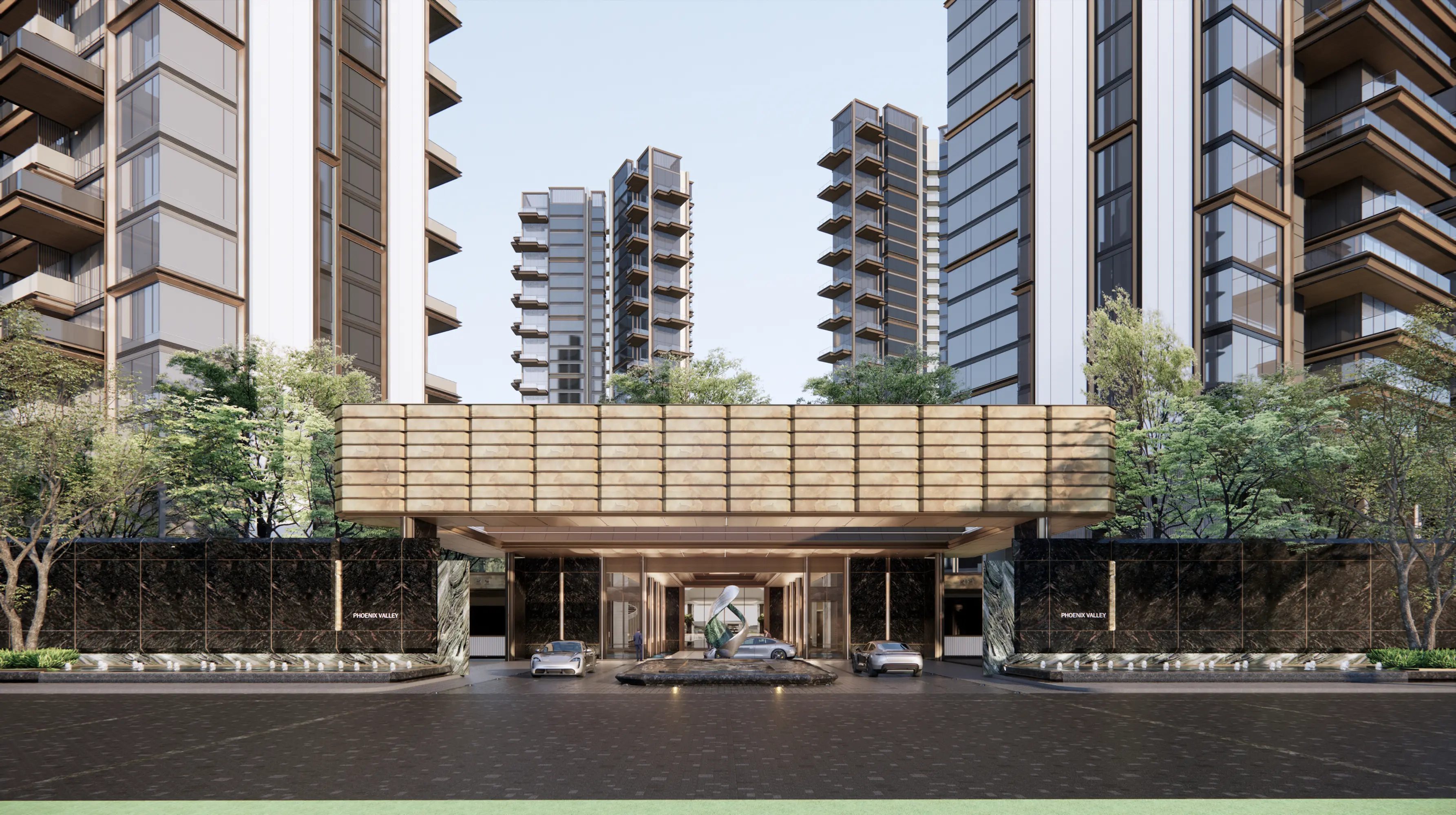 Huafa Phoenix Mansion in Zhuhai's Xiangzhou district enjoys a premium location near Xiangshan Lake, Phoenix Mountain Park, and Meixi Reservoir. Its design uses landscape-inspired visual analysis to plan unit layouts. The "Super Living Base" features elevated structures integrating commercial and parking facilities. The "Forest Island Living" theme creates a central ecological oasis with tiered gardens. The clubhouse modernizes Lingnan style, featuring a jade-like facade and interior "metal wings" reflecting the Phoenix Valley theme. Diamond-inspired details and metal accents enhance refinement and prestige.