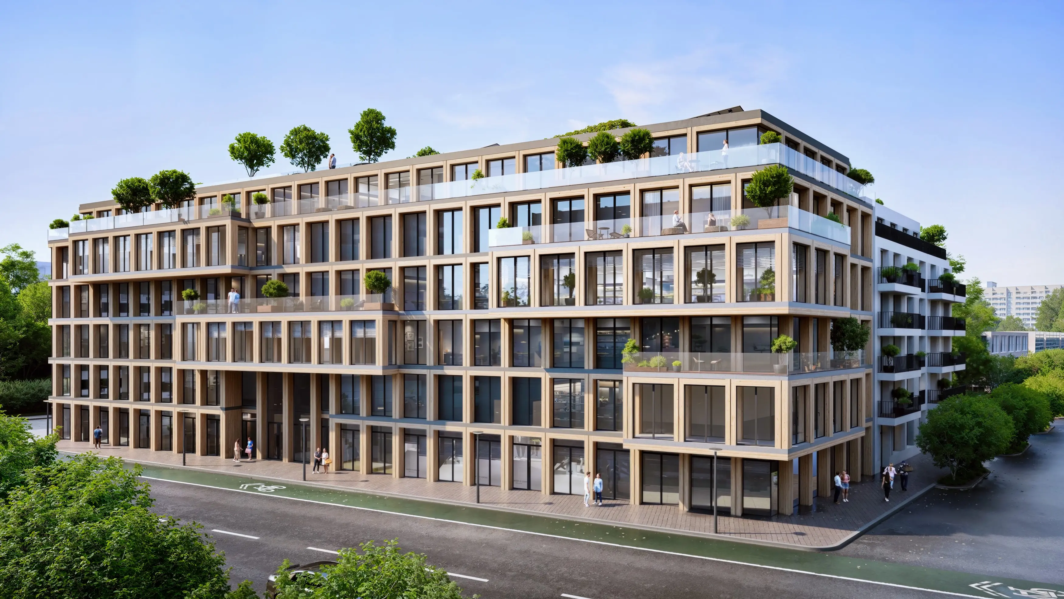 A modern timber-hybrid office building and two residential buildings with 60 flats are grouped in a U-shape around a green inner courtyard. The courtyard's substructure is intended to support Berlin's cultural and creative industries with studios and cultural events. The offices in the modular, ecologically sustainable timber hybrid building can be used flexibly. Wood is also used here for the façade, so that the materiality of the innovative construction is reflected both outside and inside. The roof is equipped with green terraces and photovoltaic modules, which make an important contribution to the fossil-free operation of the building.