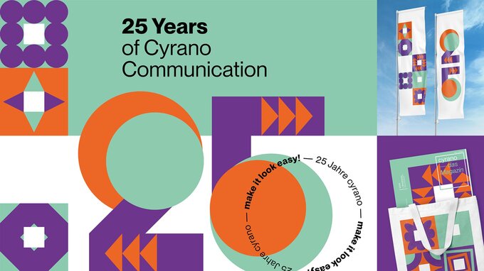 The corporate design for the 25th anniversary, »25 Years of Cyrano Communication«, skillfully reinterprets logo elements and employs modern colors such as sage, purple, and orange to provide the brand with a fresh identity. This visual language emphasizes flexibility and recognizability, inspiring creative communication for the future.