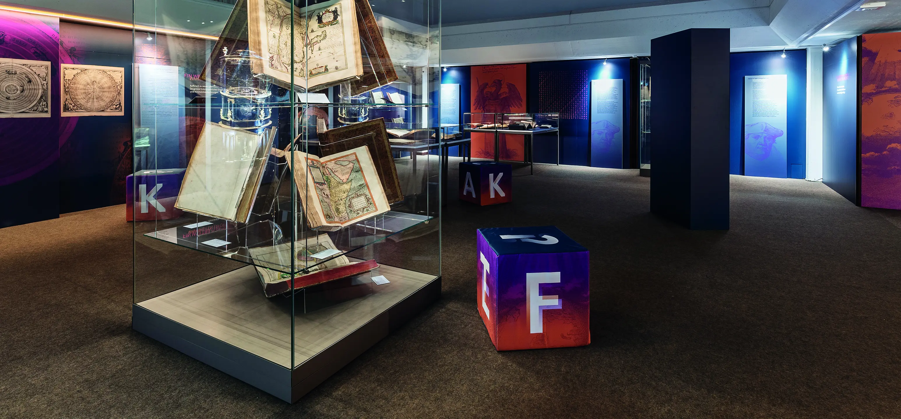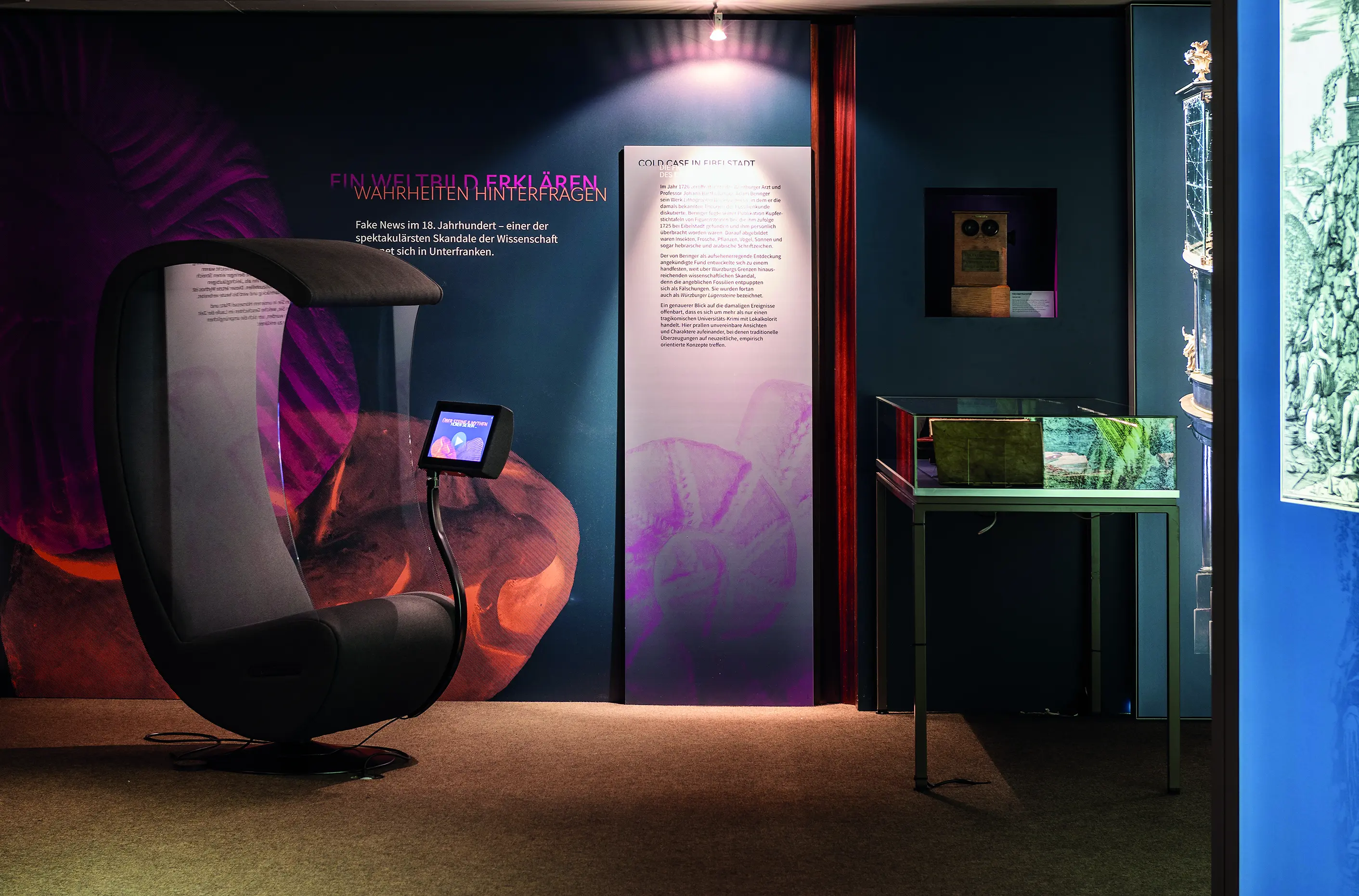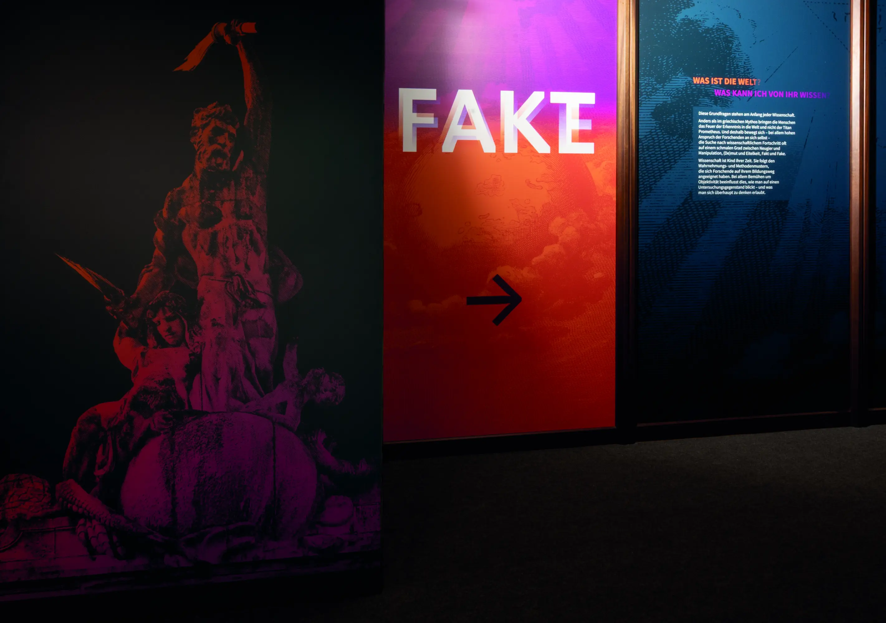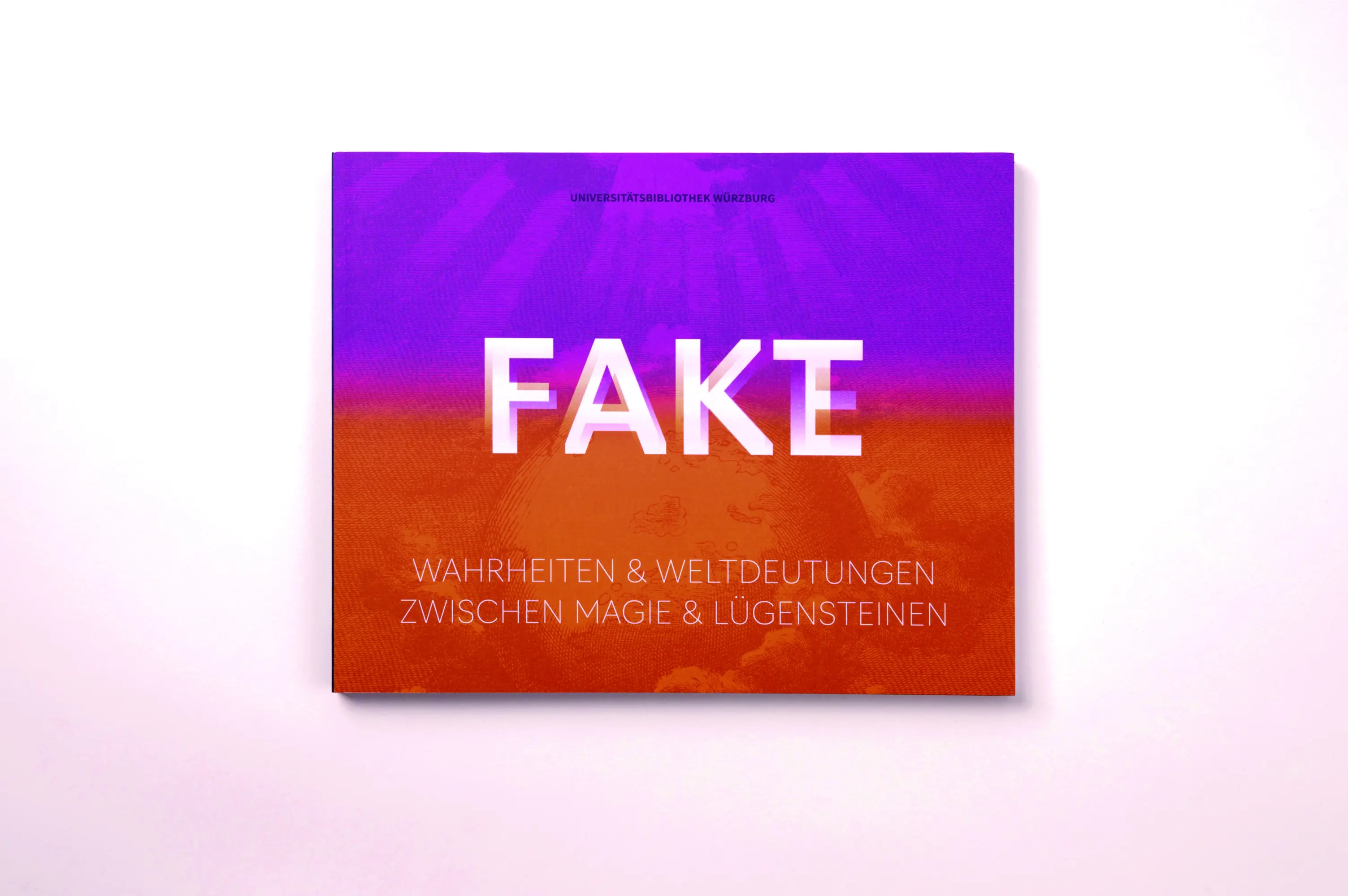 The Würzburg University Library has like all libraries always been confronted with questions about reliability of sources and scientific work. Numerous unique special objects from its collections illustrate that yesterday's facts are today's fakes. The key visual shows precisely this transition, it irritates with the central, large lettering, which initially looks like a mistake and thus generates attention. The nebulous, blurred transition reflects the core of the exhibition and shows that a clear separation of facts and fakes is not always possible. This visual idea is continued to all elements of the exhibition design.