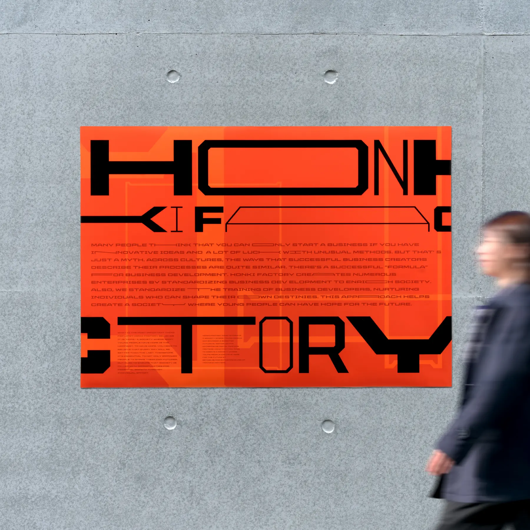 Honki Factory redesigned its visual identity to realize its vision of establishing entrepreneurship training centres and to gain trust from major corporations. The logo reflects a mission to help both individuals and companies learn how to build new businesses and take on challenges. Inspired by a framework for business and a factory for production, I designed a flexible “H”-shaped symbol and a variable logotype. The system ensures consistency across cards, posters, websites, and proposals, supporting clarity and scalability. Within a year, the 10-person firm secured 30+ major clients and won Silver awards from Graphis and A’ Design Award.