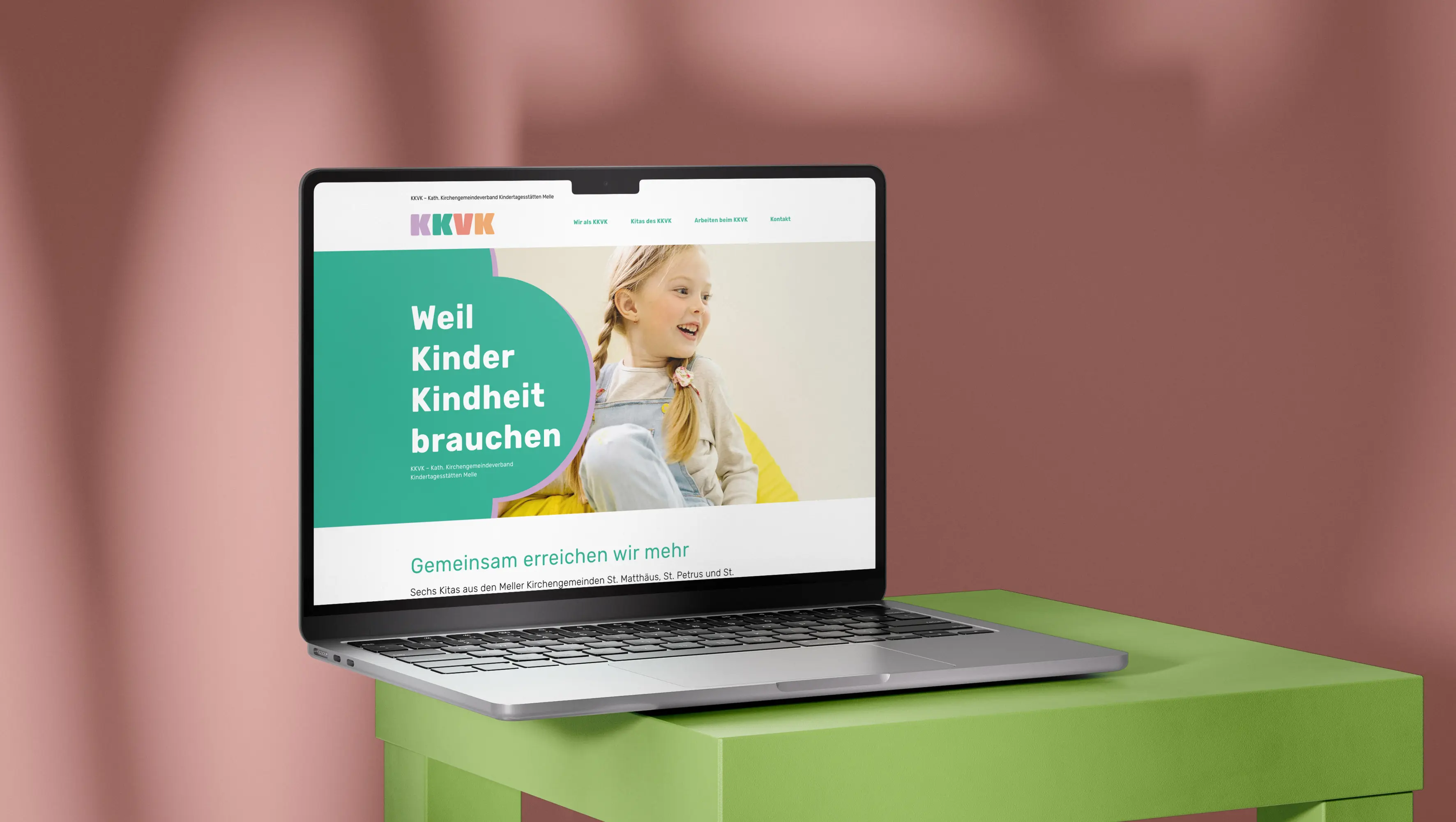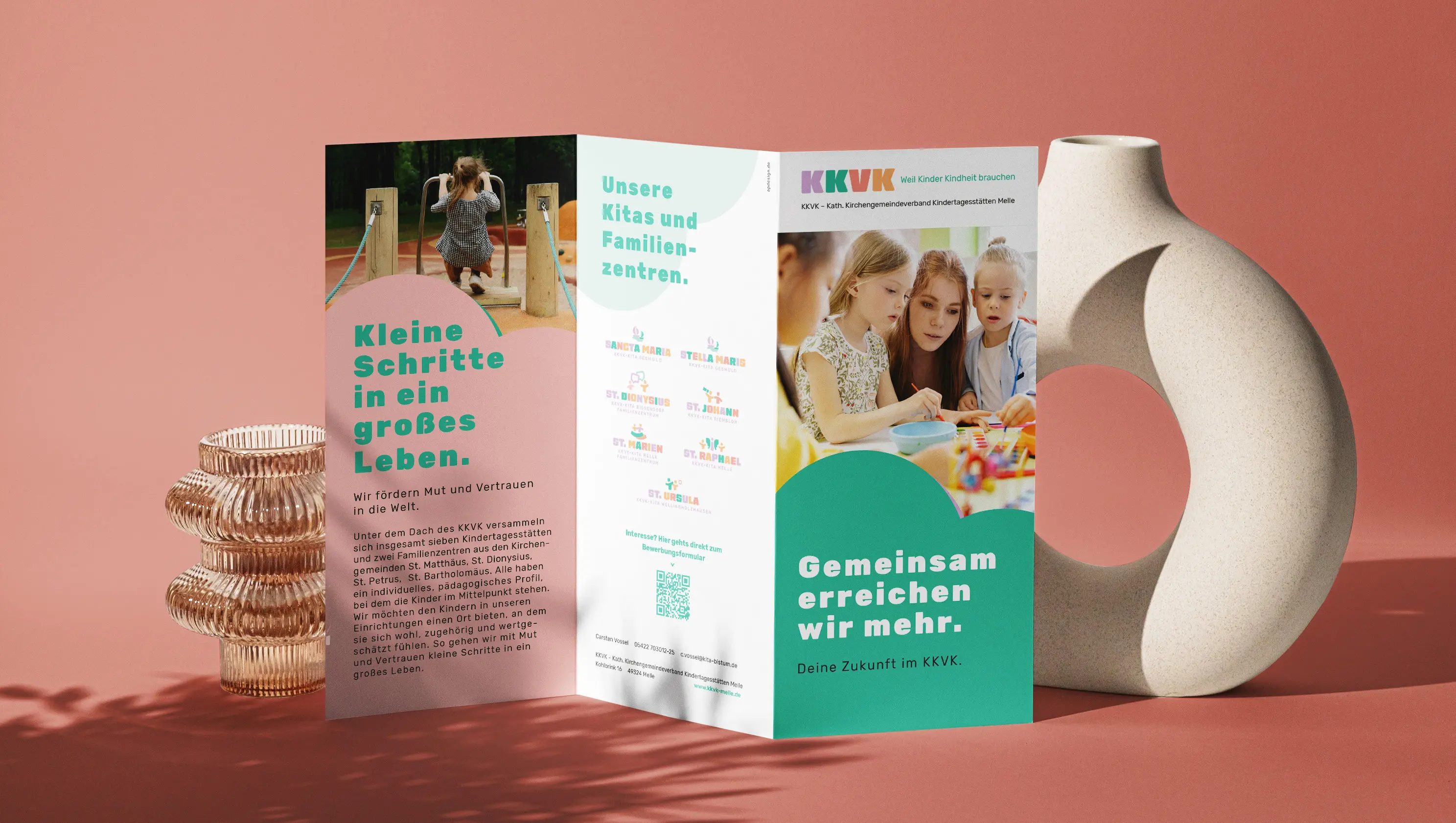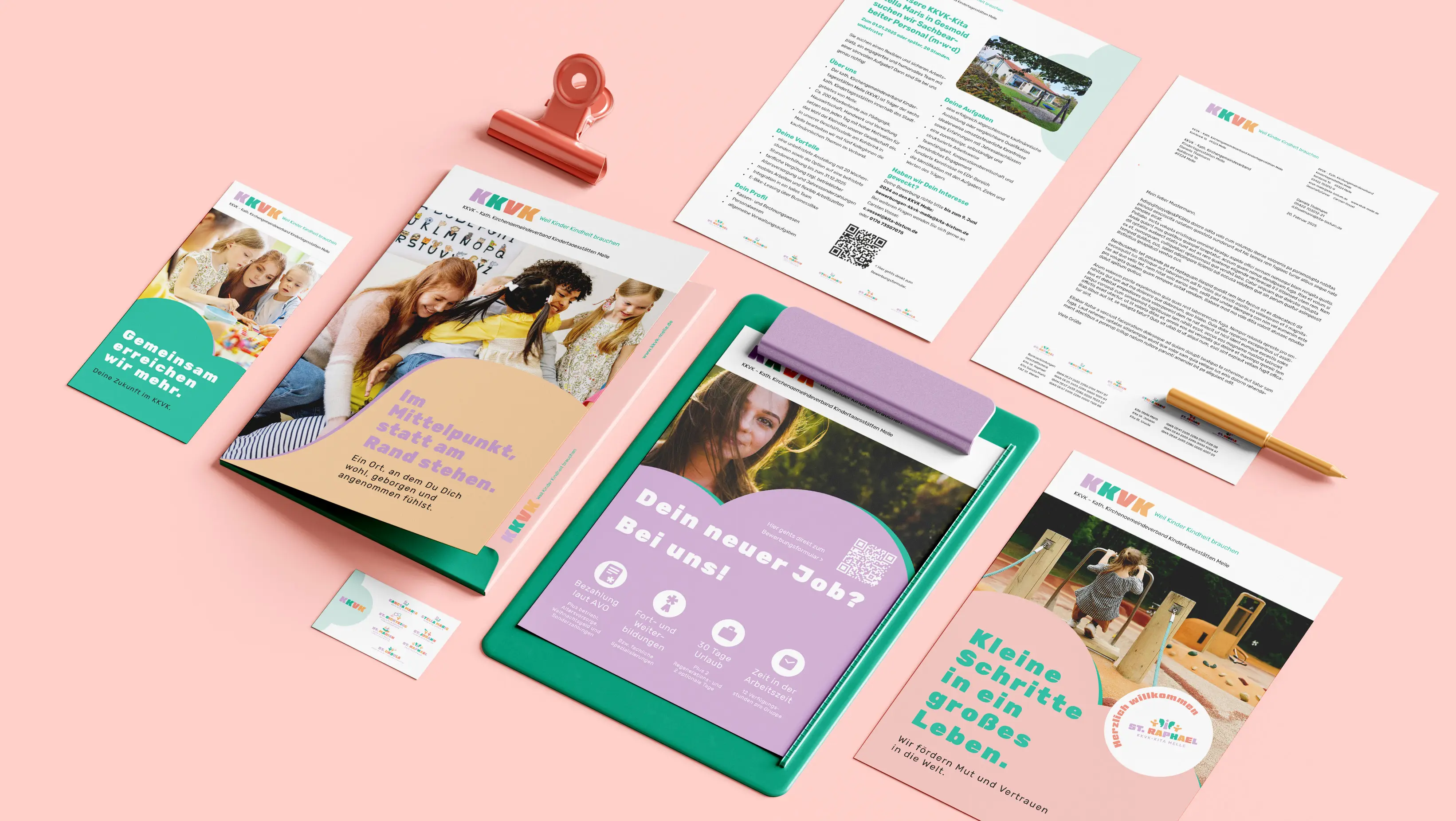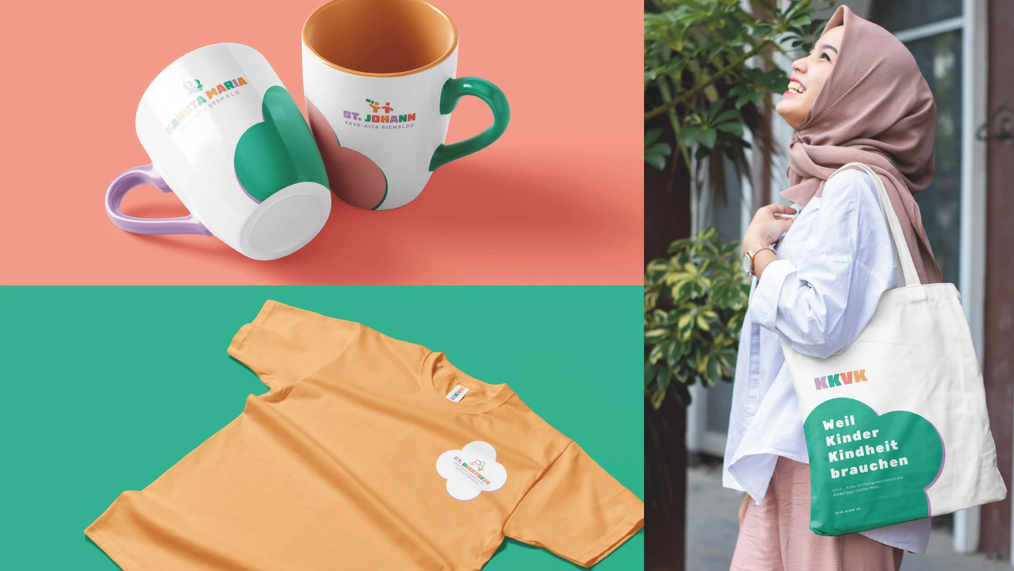 The project involved the development of a uniform corporate design for the Catholic Parish Association of Day Care Centres in Melle and its seven day care centres. The design features typographically constructed logos, modular pictograms, pastel colours and accessible websites, creating a clear, warm and functional identity. The design is emotional without appearing childish and clearly differentiates the KKVK from its competitors.