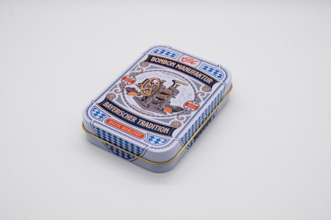 The metal “Bavaria Bonbond tin” is a reminder of 150 years of confectionery and craftsmanship in Bavaria. The nostalgic motif of a hand-operated candy machine, combined with an iconic Bavarian diamond, emphasizes the cultural origin. The handy, resealable tin remains attractive until the last sweet and fits in every pocket.