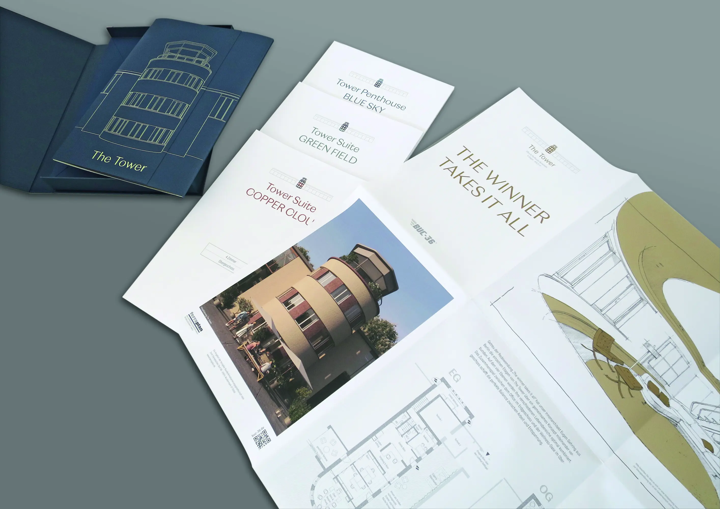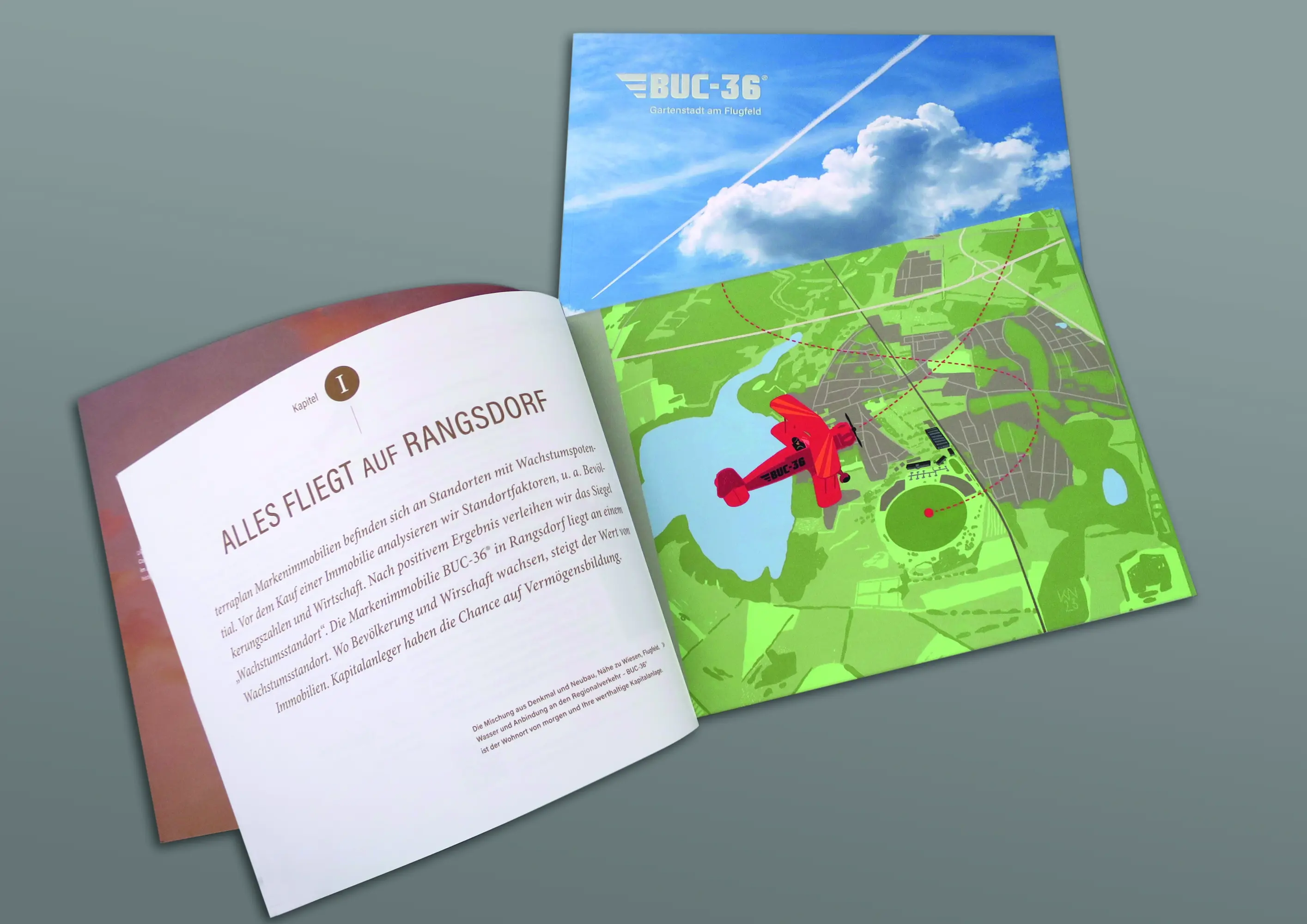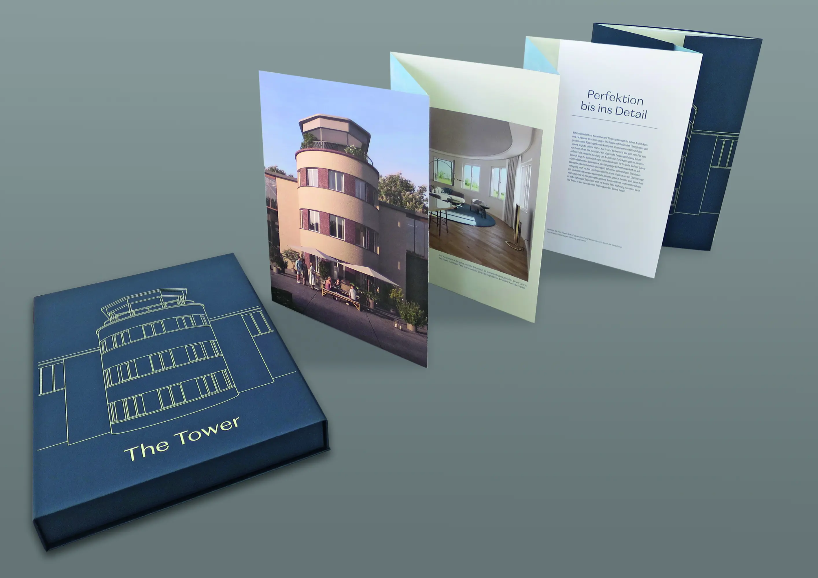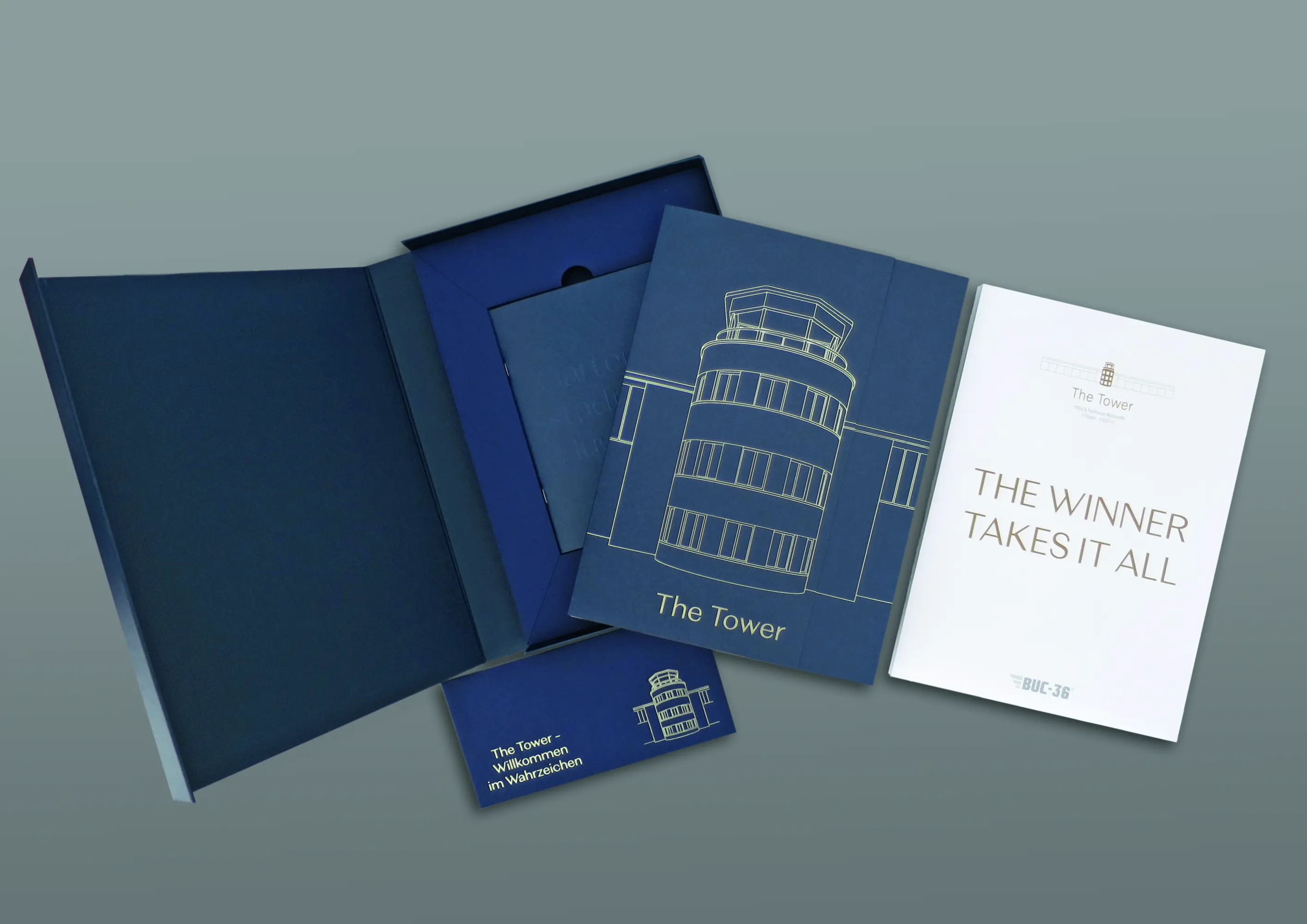 A new neighborhood is being built on the former Rangsdorf airfield near Berlin, with the historic „Einfliegerhalle“ as its landmark. Two high-quality catalogues and a handmade case with a leporello and plans present the monument. The design concept combines sky, vastness, and recreational flying. Full-page illustrations reinforce the message and create a special visual experience. The focus is on the “The Tower” accordion fold, which is 2.55 meters long and offers a 180° panoramic view. Fine materials and precise workmanship emphasize the high quality standards.