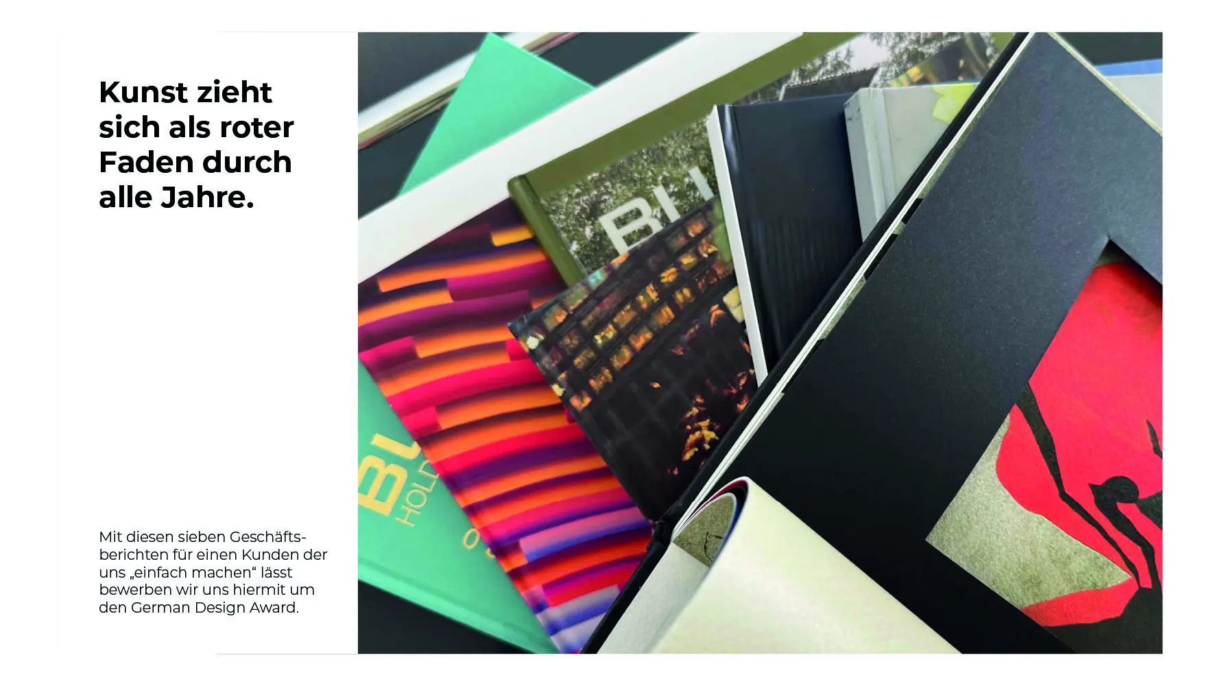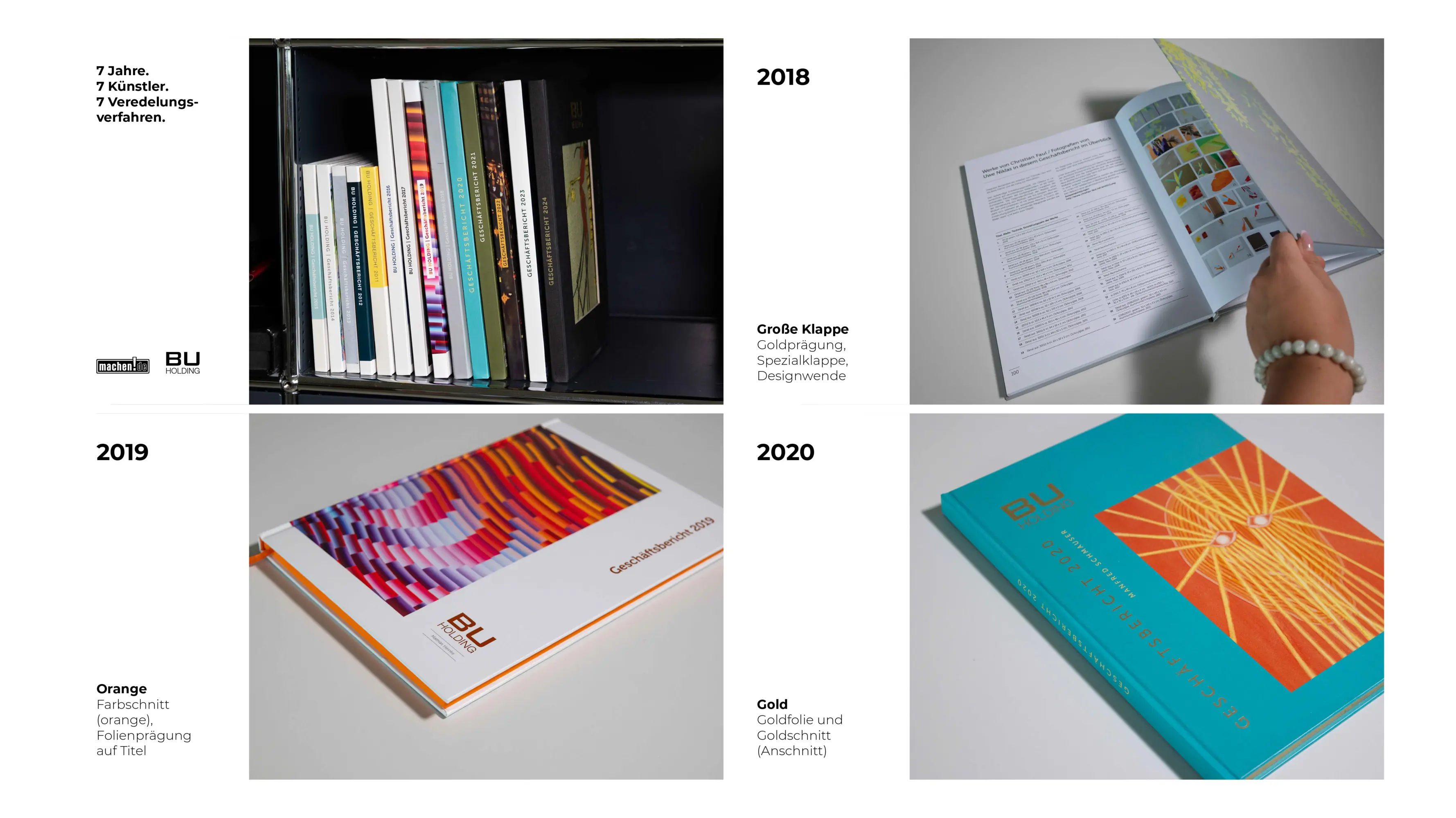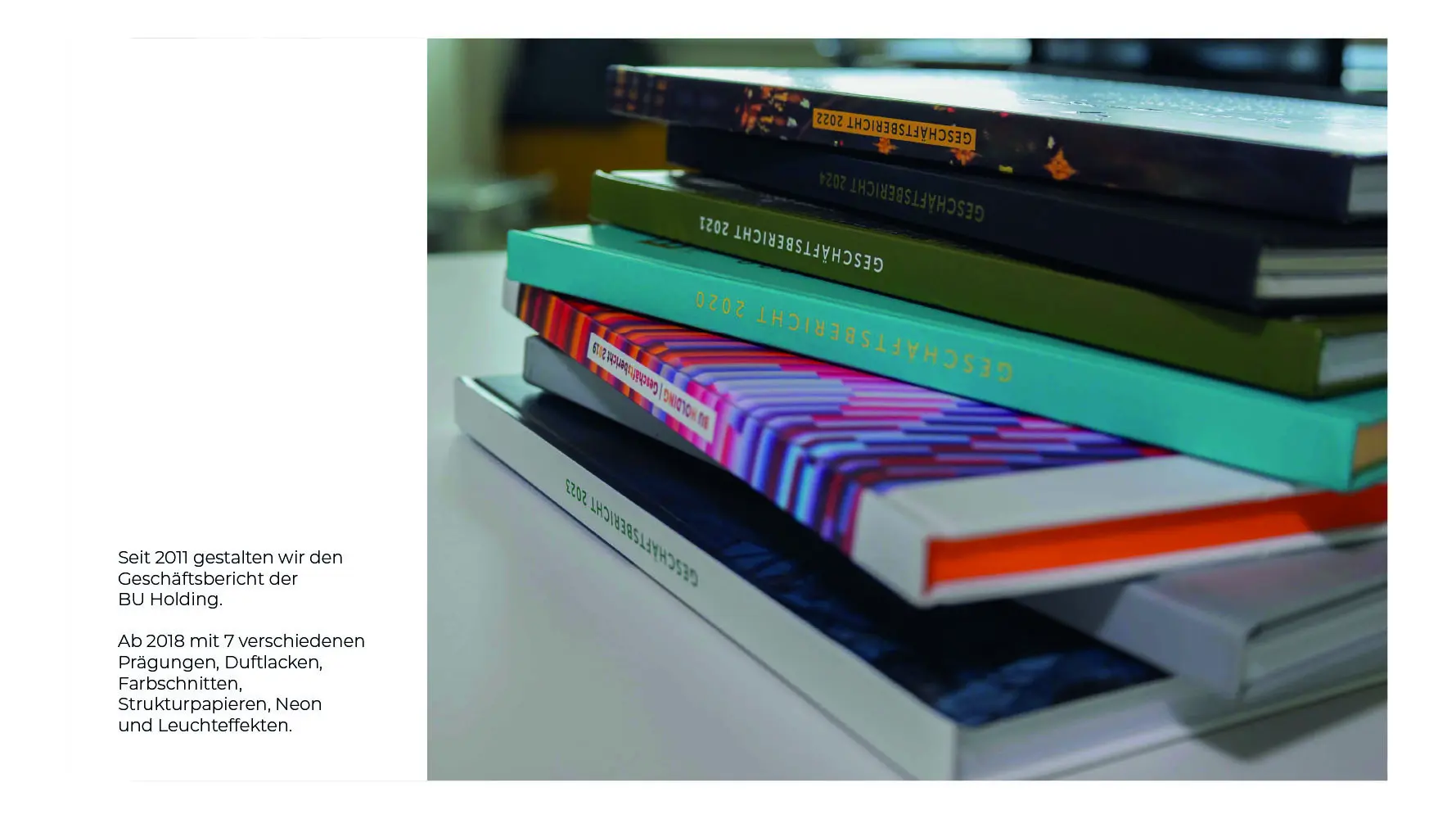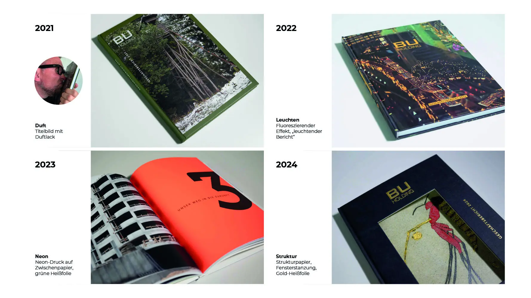 Since 2011, we have been designing the annual report for BU Holding. Starting in 2018, seven consecutive editions were created with a strong artistic approach and elaborate finishing techniques such as embossing, scented coatings, coloured edges, textured papers, neon, and light effects. Art runs as a unifying theme, connecting design, materiality, and narration. With these seven reports, we are applying for the German Design Award.