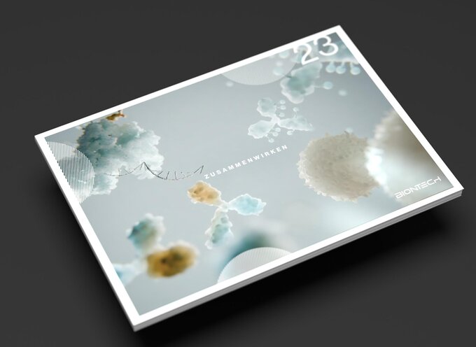 The magazine accompanying the 2023 report “Working together - creating synergies” focuses on modern combination therapies. It emphasizes BioNTech's vision of developing precise cancer treatments of the future. The aim is to create a portfolio of therapies that work in combination to optimize their effect and thereby increase treatment success for patients by exploiting the full potential of each technology. The synergetic approach is illustrated clearly and graphically in print by a lenticular image on the cover and in the digital PDF version by an animation.