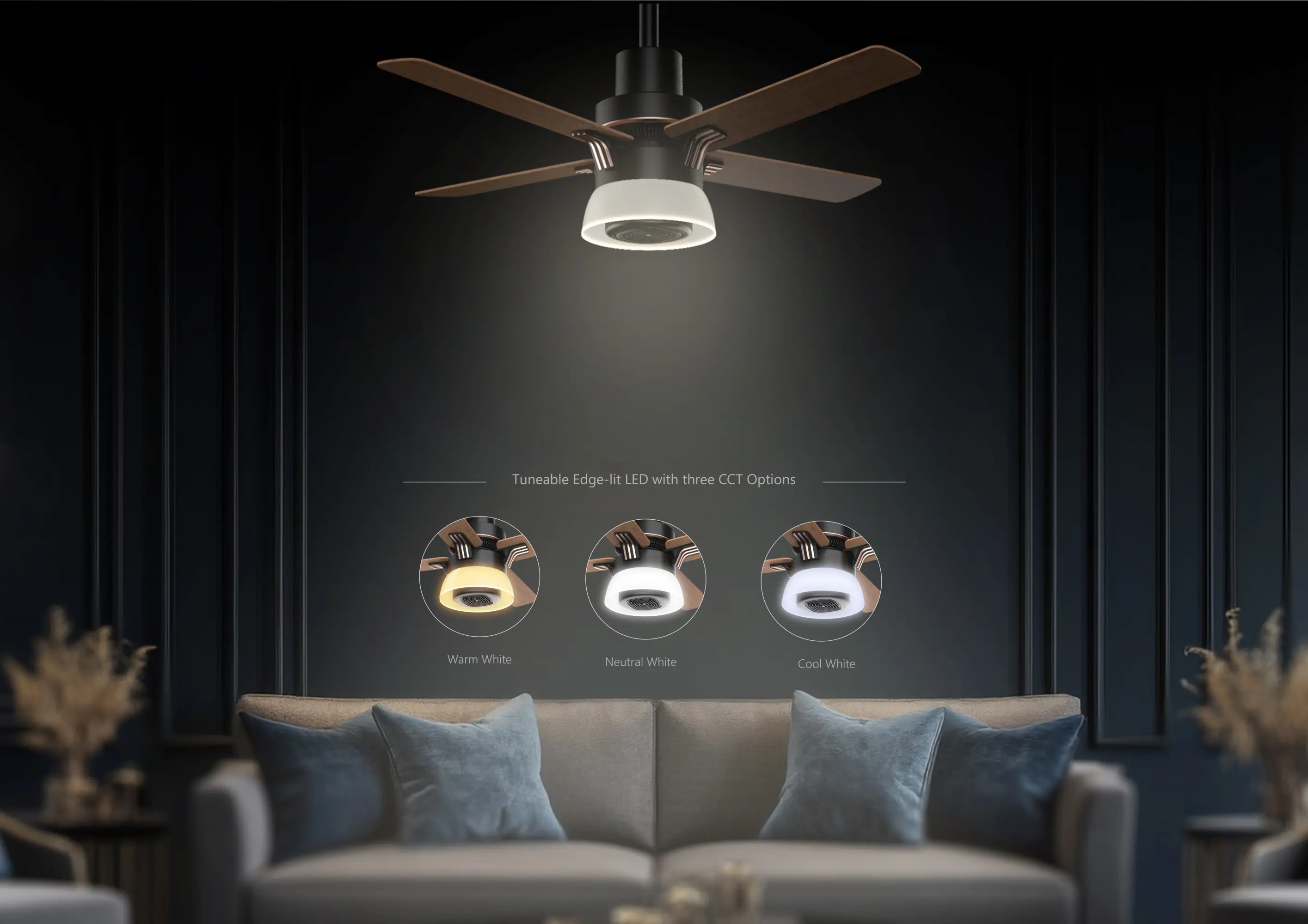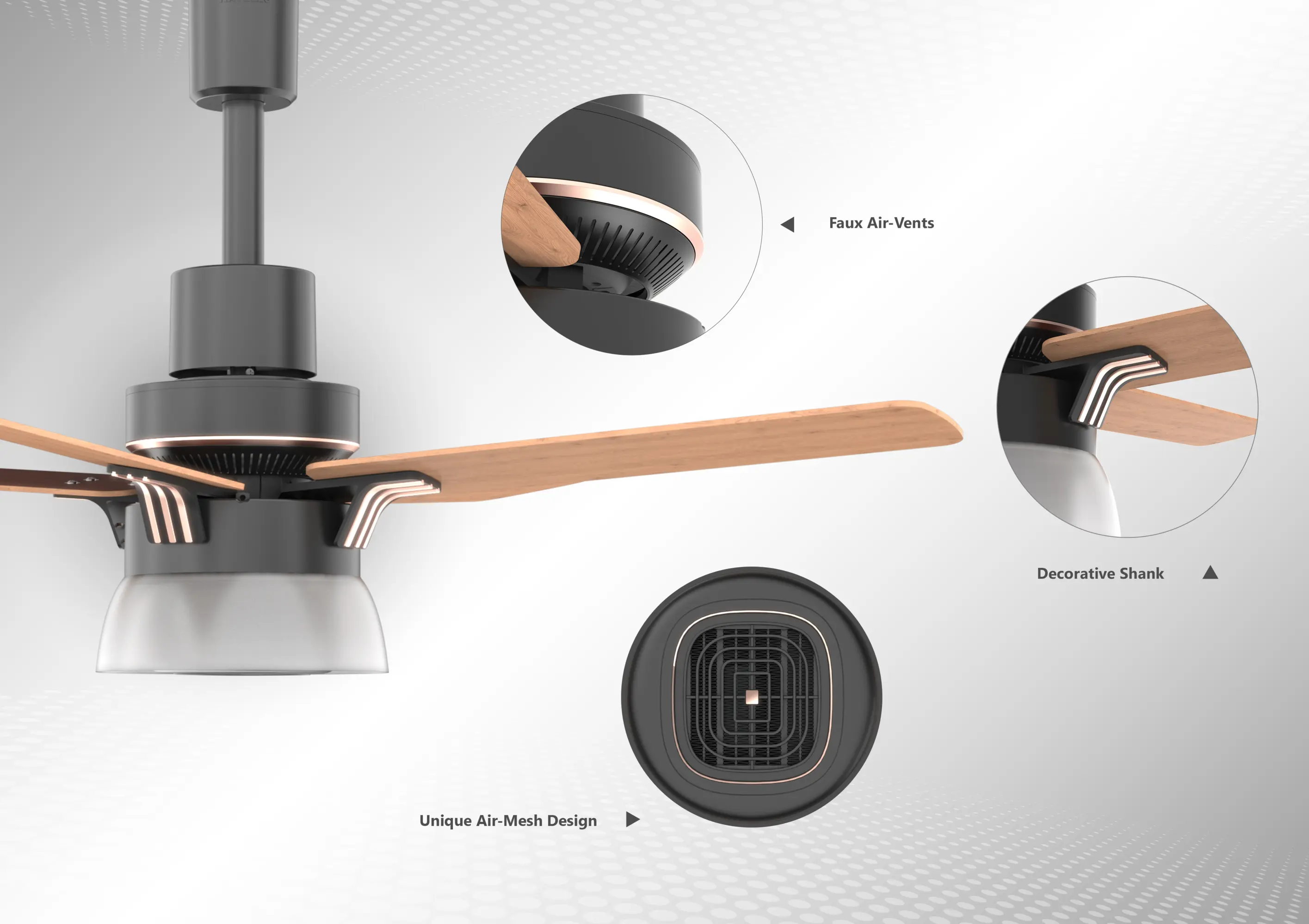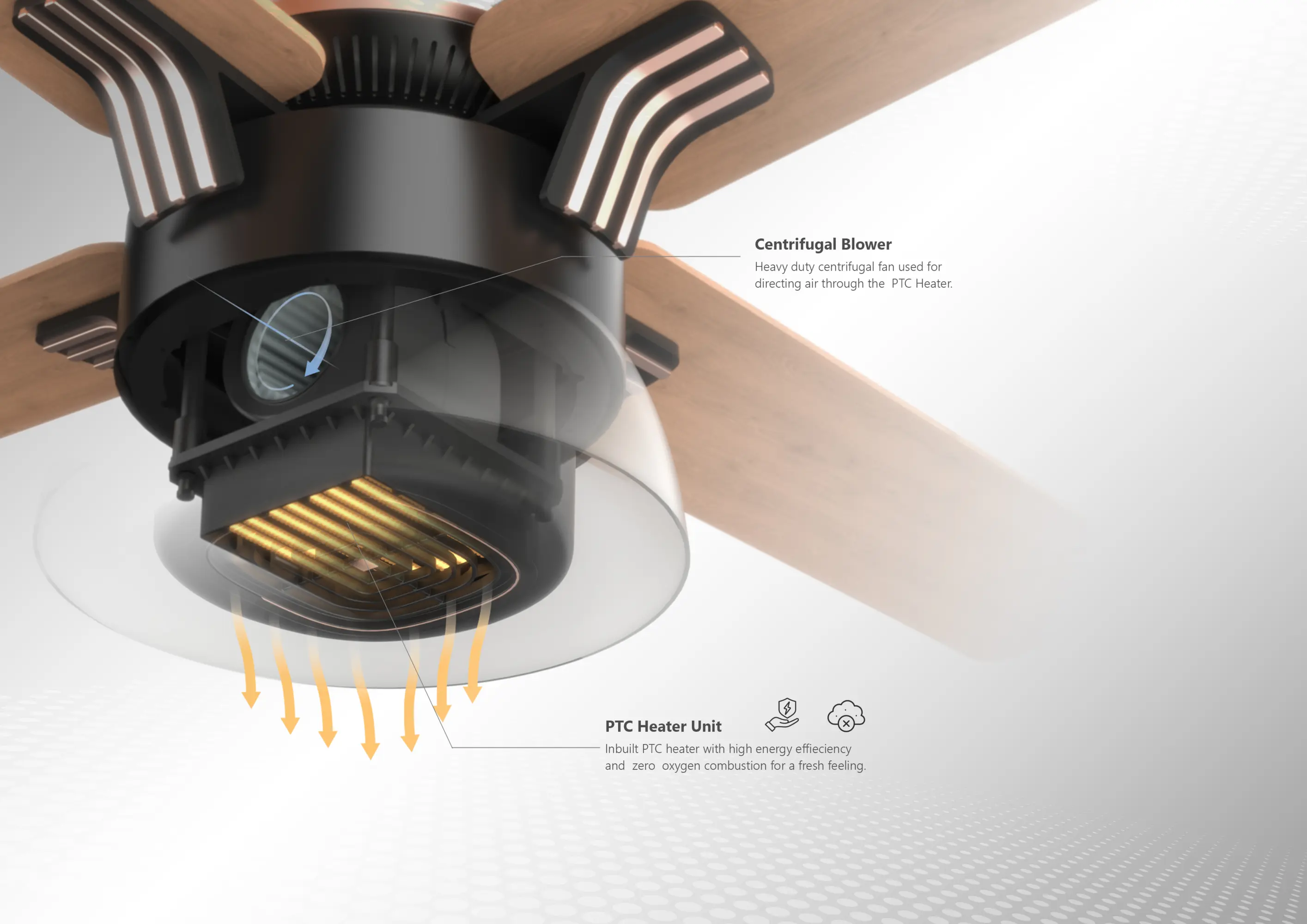 Florette- All weather Fan is an industry first Premium BLDC ceiling fan that comes with an integrated PTC heater, that circulates warm air during the winters and cool comfort during the summer. Its contemporary form accented with retro-industrial elements such as decorative shanks is inspired from the timeless elegance of a blooming lotus. The edge-lit luminous skirt that provides ambient lighting hides the heater unit seamlessly within the main fan body. Built on a platform-based design, it smartly repurposes an existing under-light fan body to house the heater—cutting NPD costs and material use without compromising style or performance.