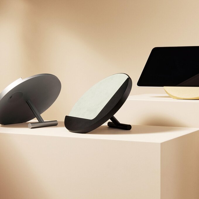 Sunset stand for iPad resembles an elegant cufflink for exclusive occasions. The round casing is machined from a solid aluminium block and anodised for smoothness. It is thoughtfully equipped with a USB-C port for charging. The gold, silver or black anodised surface beautifully contrasts with an Alcantara inlay. This interchangeable inlay offers an impressive visual quality that can be adjusted to the interior. Together with the tablet, the Sunset stand conveys a feeling of modern elegance and brings out the best of aluminium.