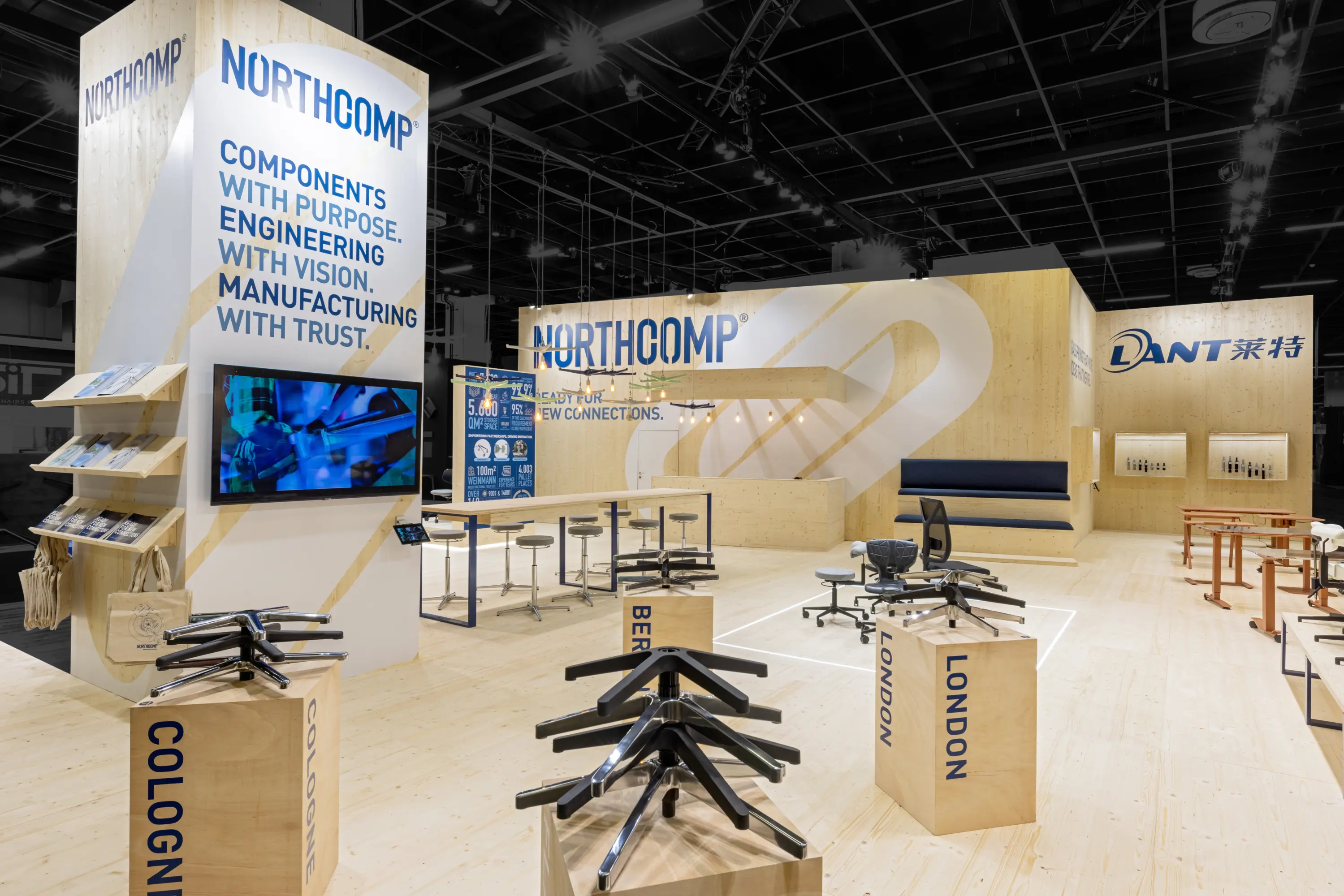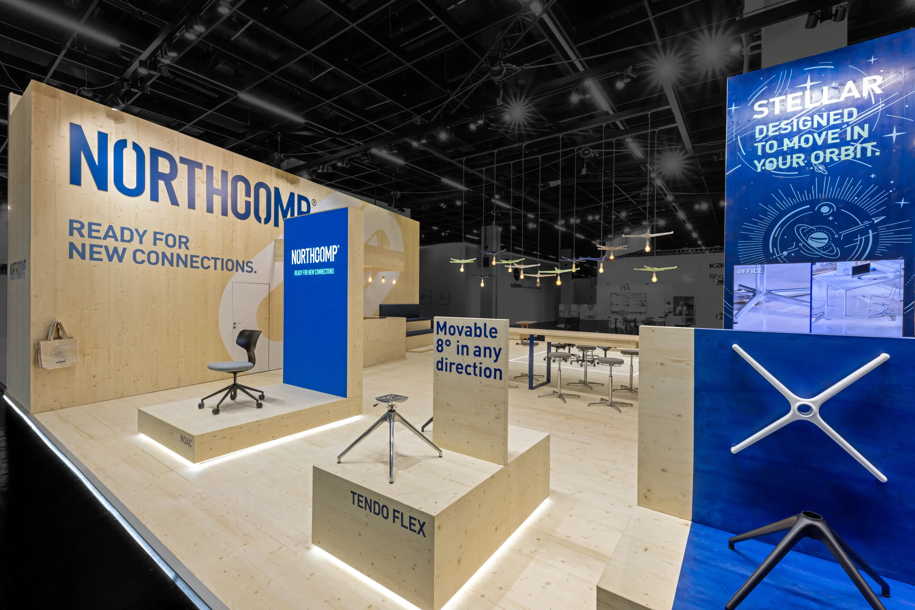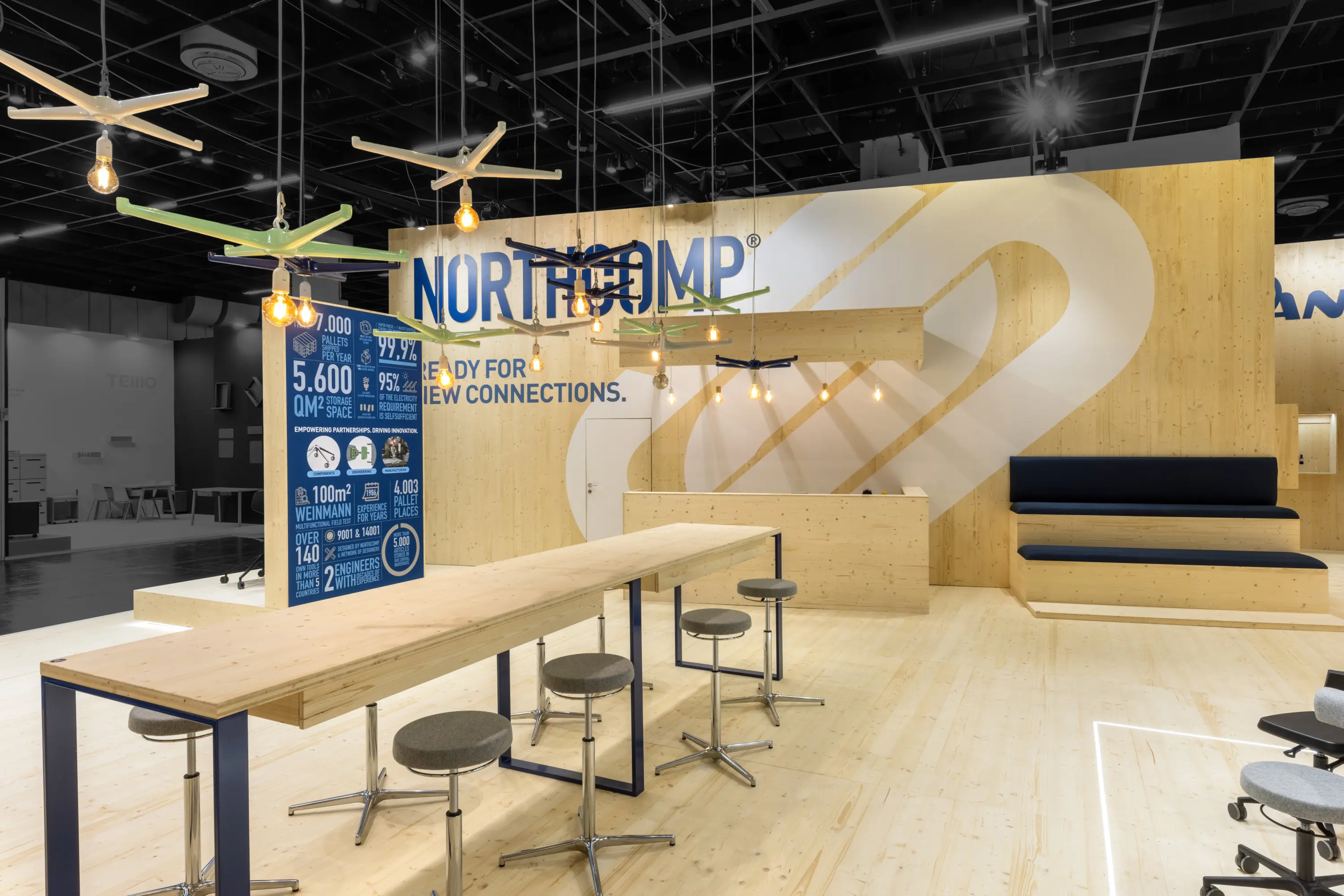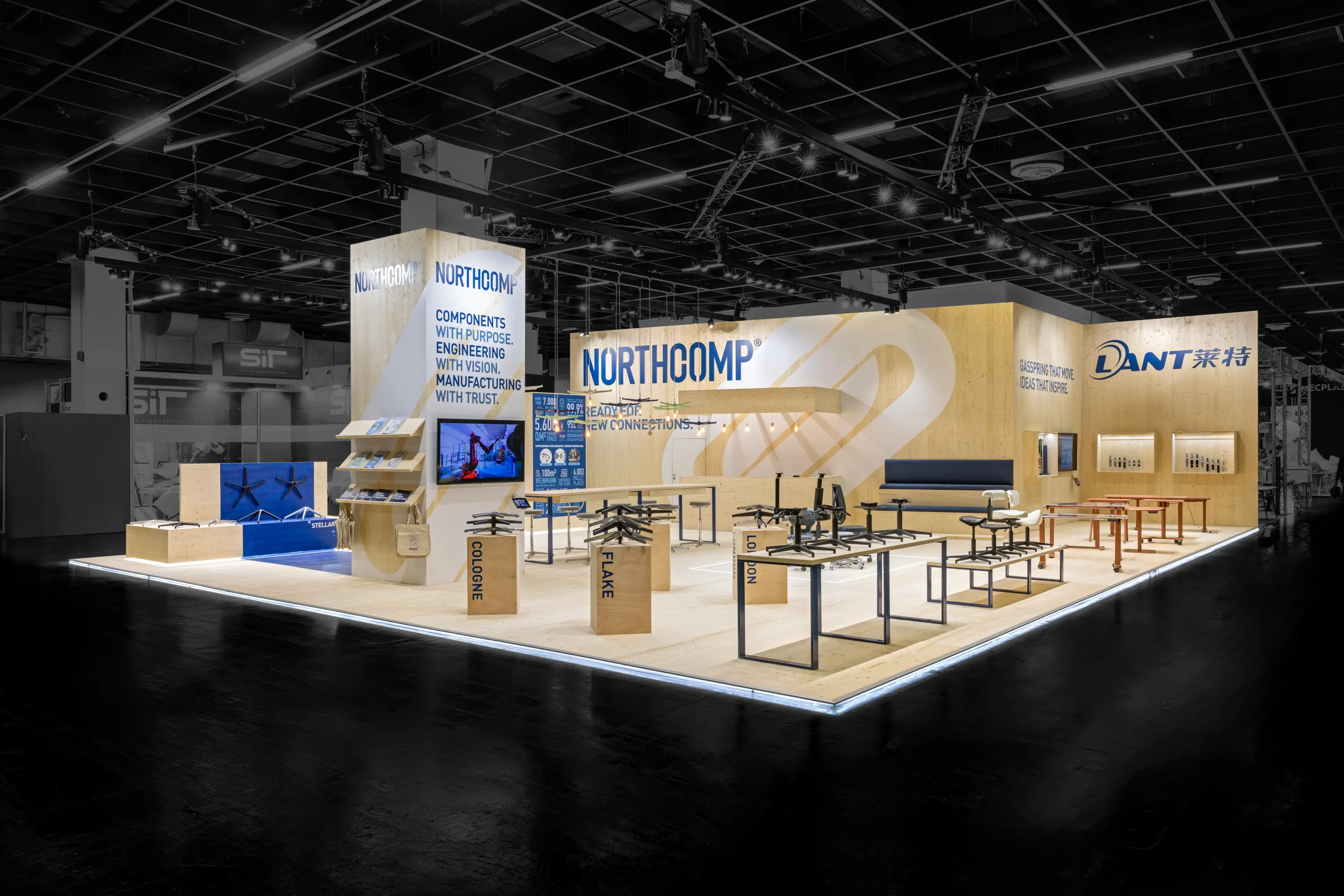 Northcomp's trade fair appearance at Interzum 2025 in Cologne resulted in a stand concept that combines sustainability, functionality, and brand identity in a modular, recyclable design. The starting point was the desire to create a resource-saving trade fair appearance that would last beyond the moment. The central idea: a completely reusable stand construction system made of 3-layer panels that is not only visually appealing but also environmentally friendly. The design was dominated by a clear, minimalist style that draws attention to the products and creates space for interaction. The result: “Rethinking Resources.”