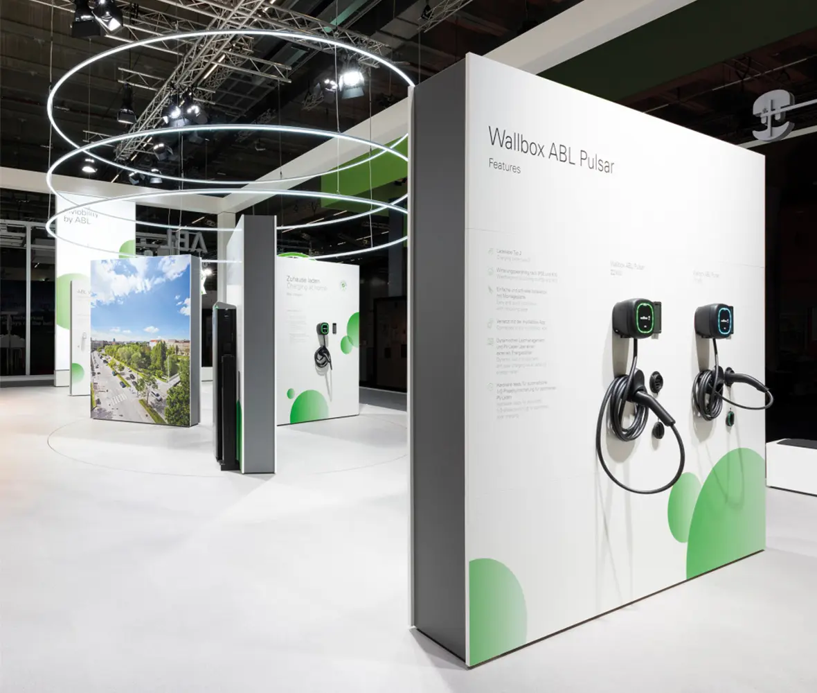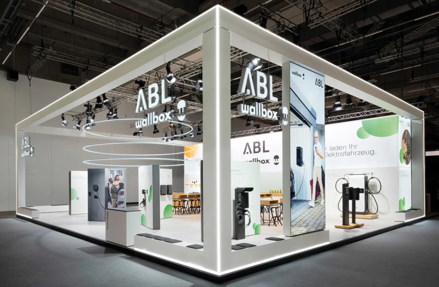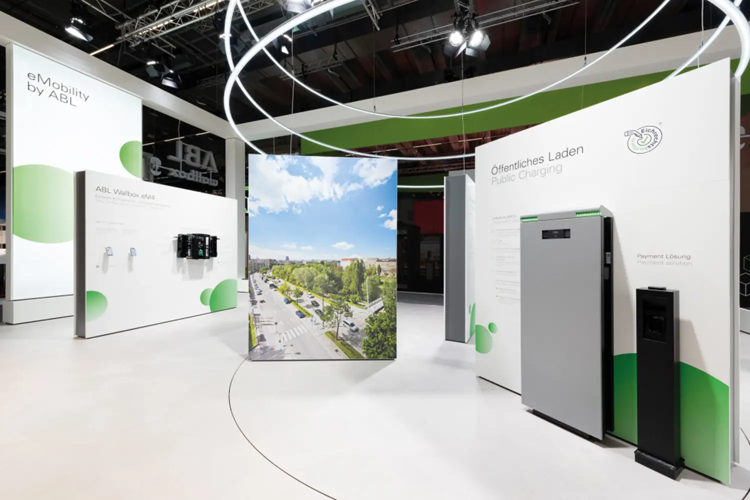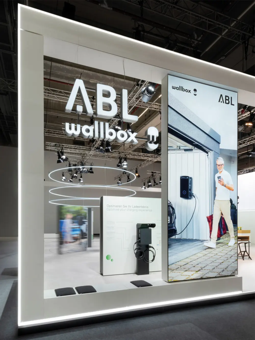 For Light + Building 2024, Ueberholz. has developed a stand concept for ABL that combines innovative design elements and interactive presentations. Illuminated frames and integrated benches form the stand's contours and create an inviting atmosphere. A walk-in revolving stage and display walls enable dynamic product presentations, while large-format illuminated images reinforce the brand identity and add visual accents. The design combines functionality and aesthetics, optimizes the spatial effect, and offers visitors an unforgettable experience of the electric mobility brand.