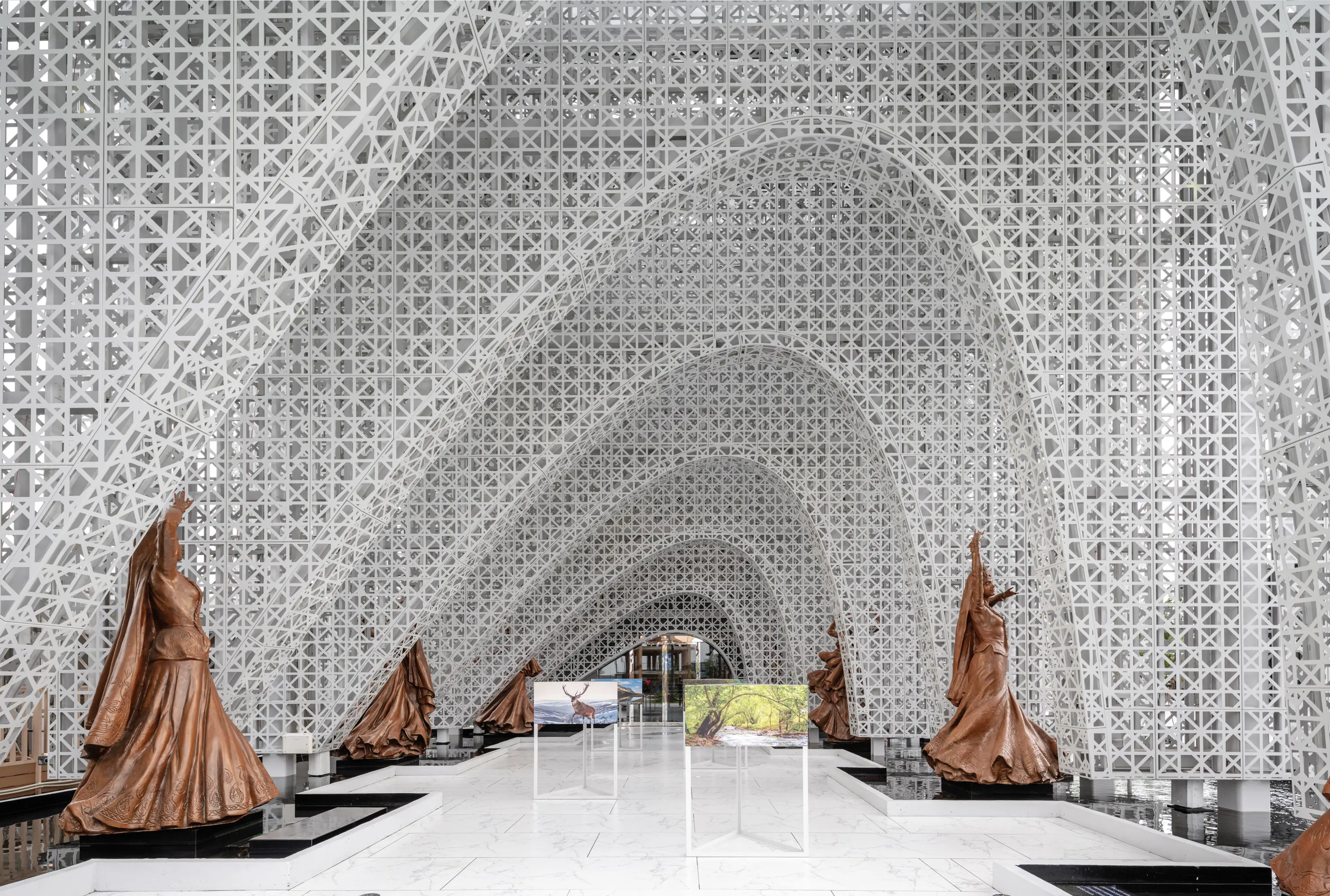 At Expo 2025 in Osaka, the Azerbaijan Pavilion invites visitors on a journey through the country’s culture, history and future. The overall theme is “Connecting Lives.” Created by Bellprat Partner and ELEVEN with the Heydar Aliyev Foundation, it blends architecture, scenography, and technology into an immersive experience. Inspired by Nizami Ganjavi’s tale of the Seven Beauties, the Pavilion features seven arches, each revealing a new chapter of Azerbaijan, with symbolic threads woven into a fabric of exchange and sustainability. The highlight is the 360° Main Show, where tradition meets innovation.