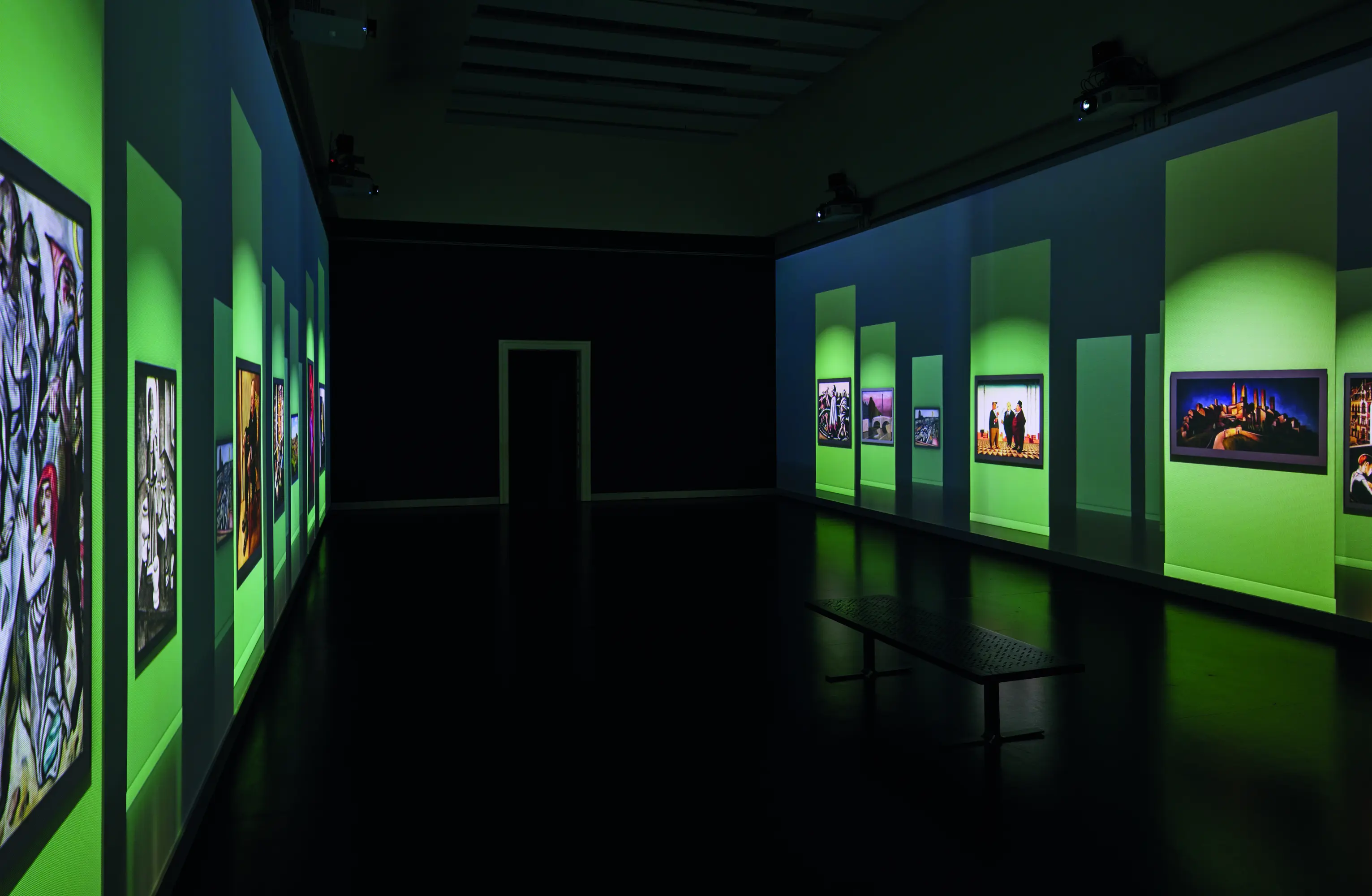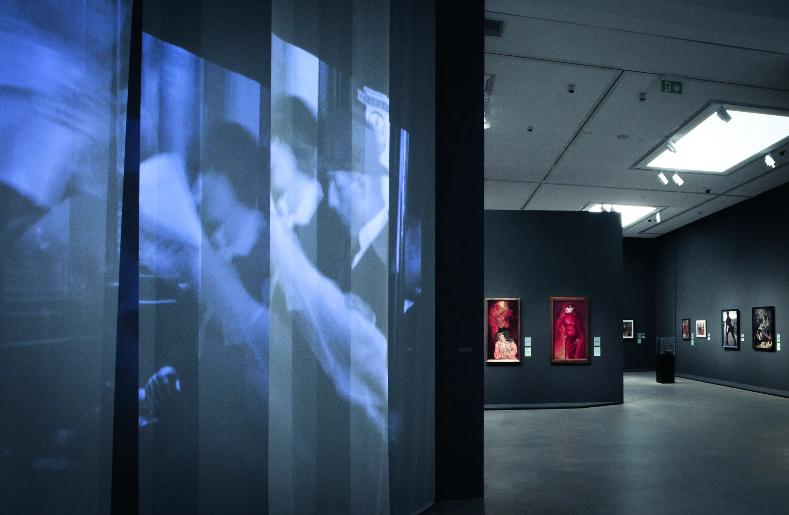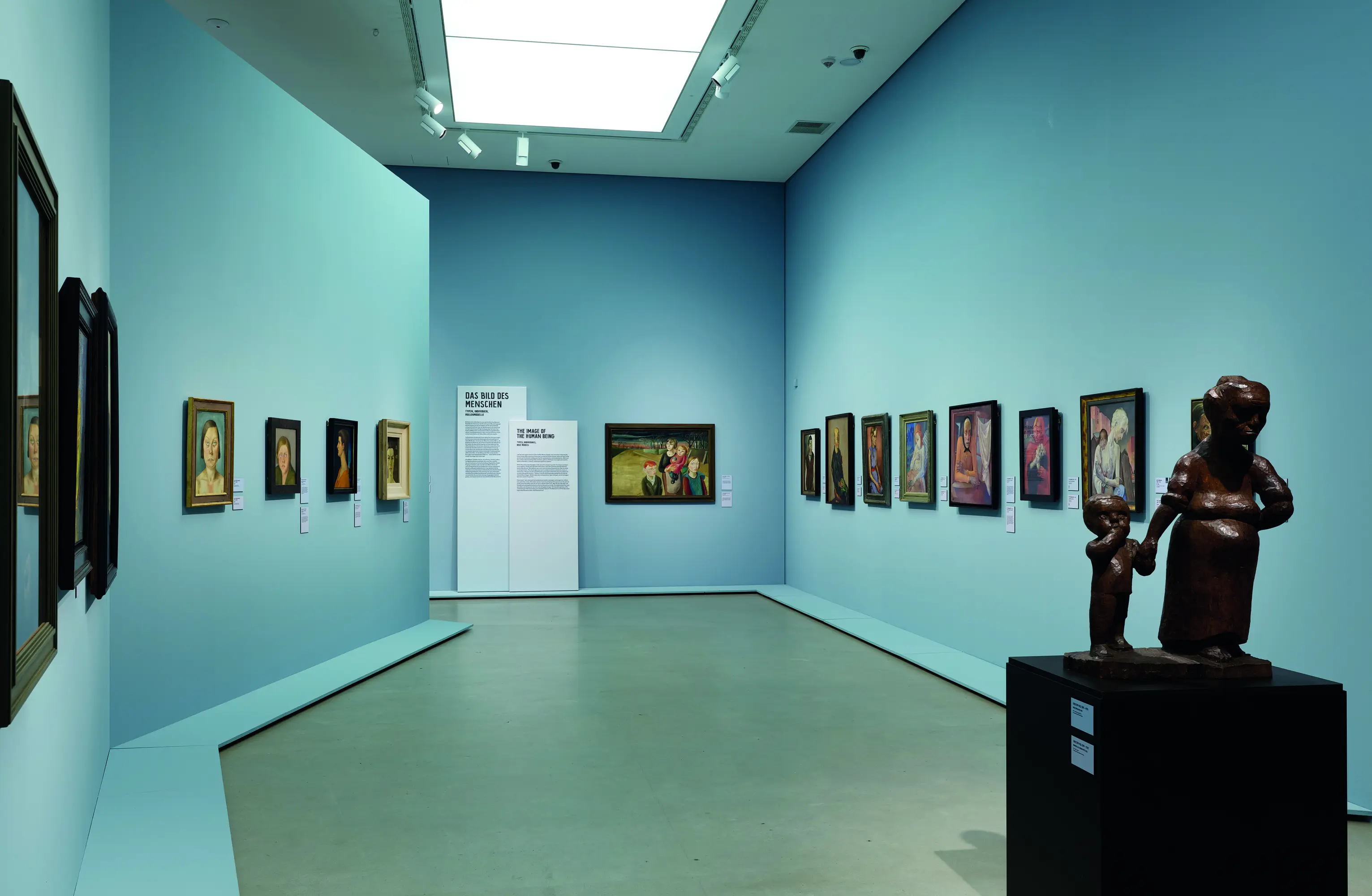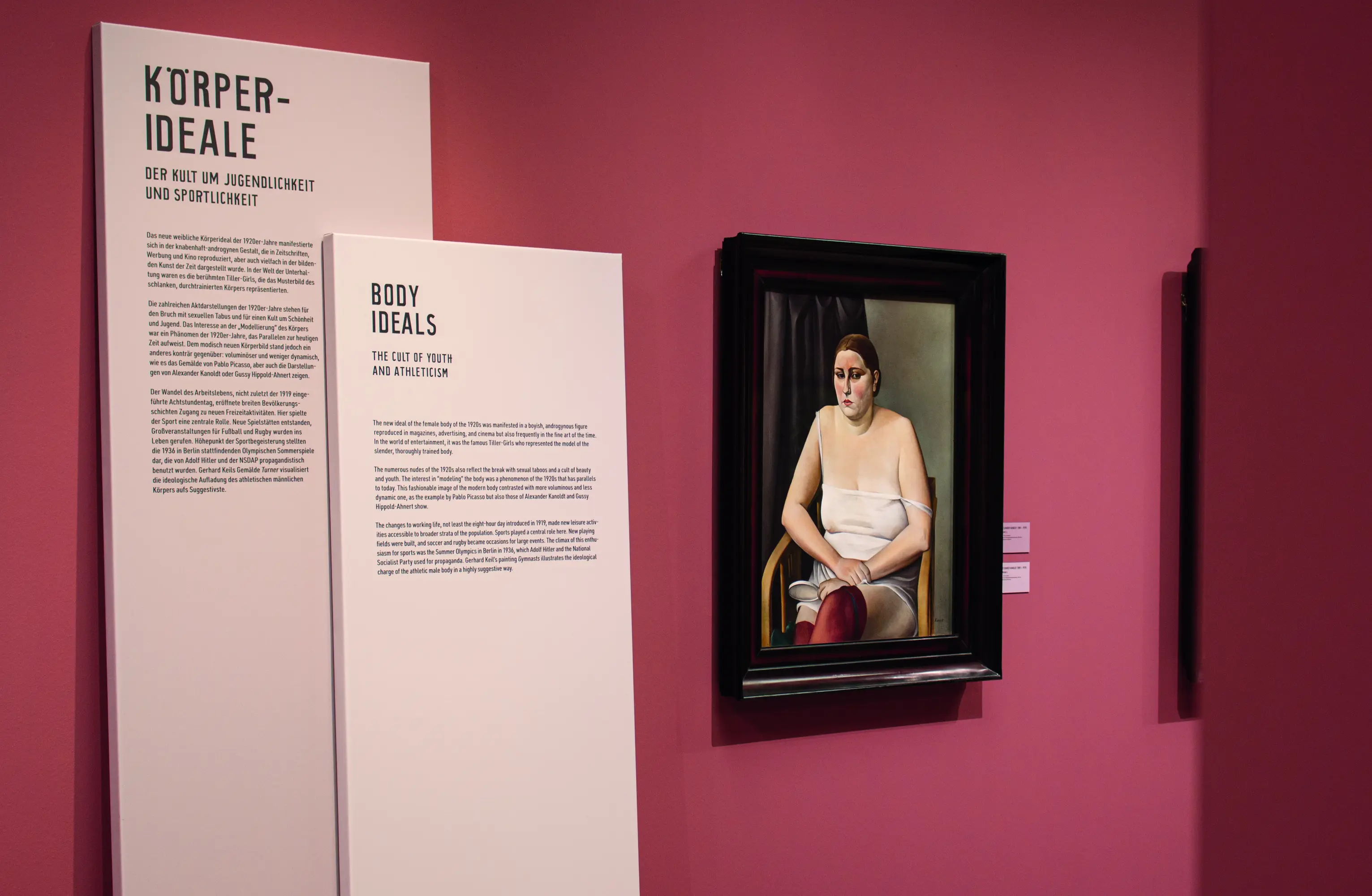 The scenography aesthetically transports visitors back to the era of New Objectivity. Inspired by the asymmetrical perspectives of many artworks, the spatial structuring elements are also arranged non-orthogonally; canvas frames leaning against the walls with informational texts suggest fragmentation and structure the image sequences. Targeted colour accents organize the spaces. A custom typeface was also developed, based on the original 1925 poster. Video projections on translucent fabric panels create dreamlike glimpses into the 1920s. One room with immersive animations brings the lost original exhibition back to life.
