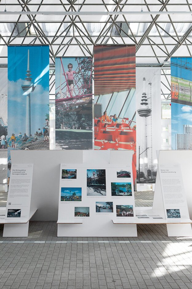 The exhibition "A city changes the festival - The garden shows 1907, 1975 and 2023." focuses on the changes in the garden shows in Mannheim. In a plant showroom, the three garden shows are juxtaposed in a spatial setting. In the middle of the room, a prism made up of individual parts unfolds, the three sides of which each present the time layers 1907, 1975 & 2023. The honeycomb cardboard carrier material is light, environmentally friendly & recyclable. Large hanging flags visualize the impressions from the respective time layers.