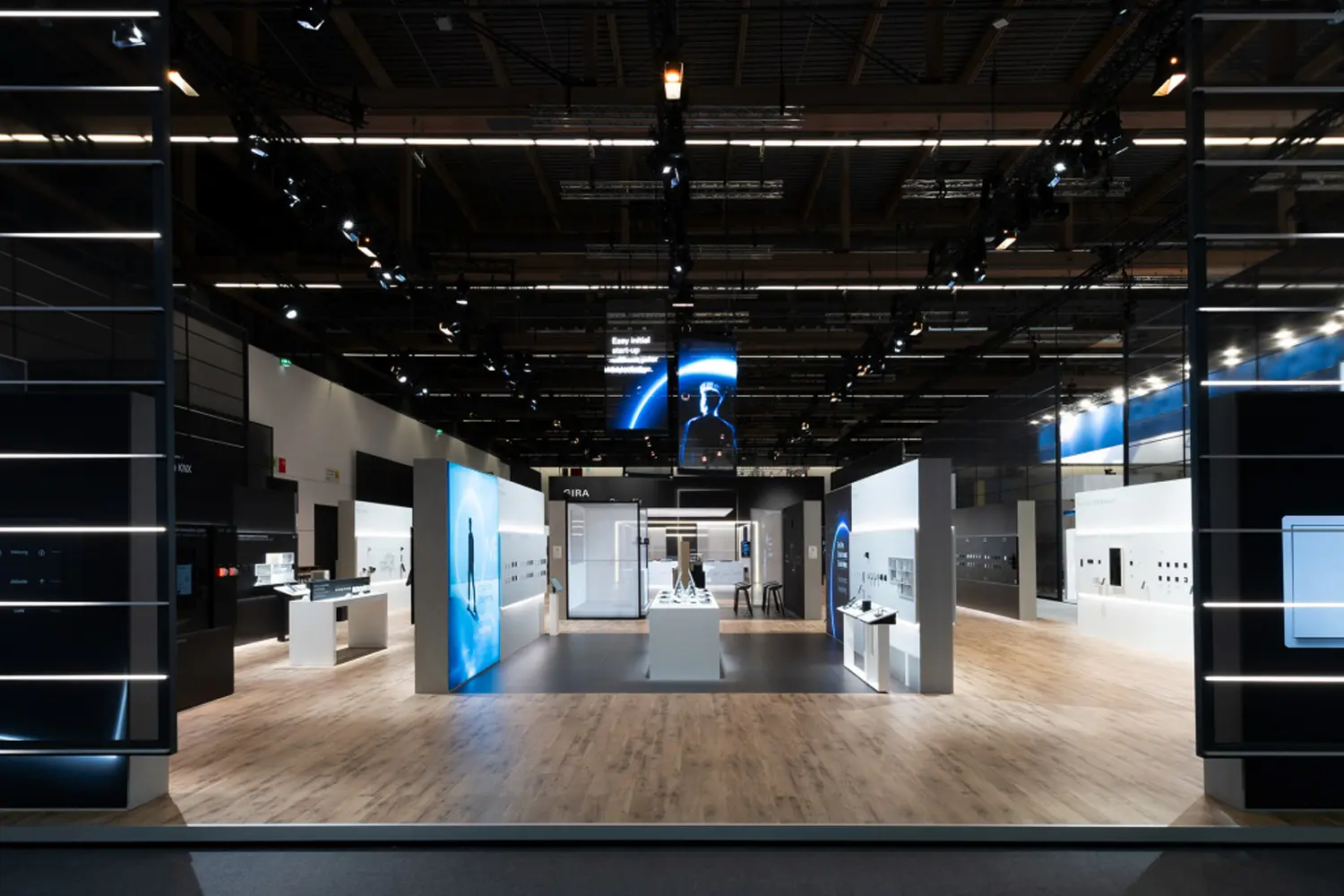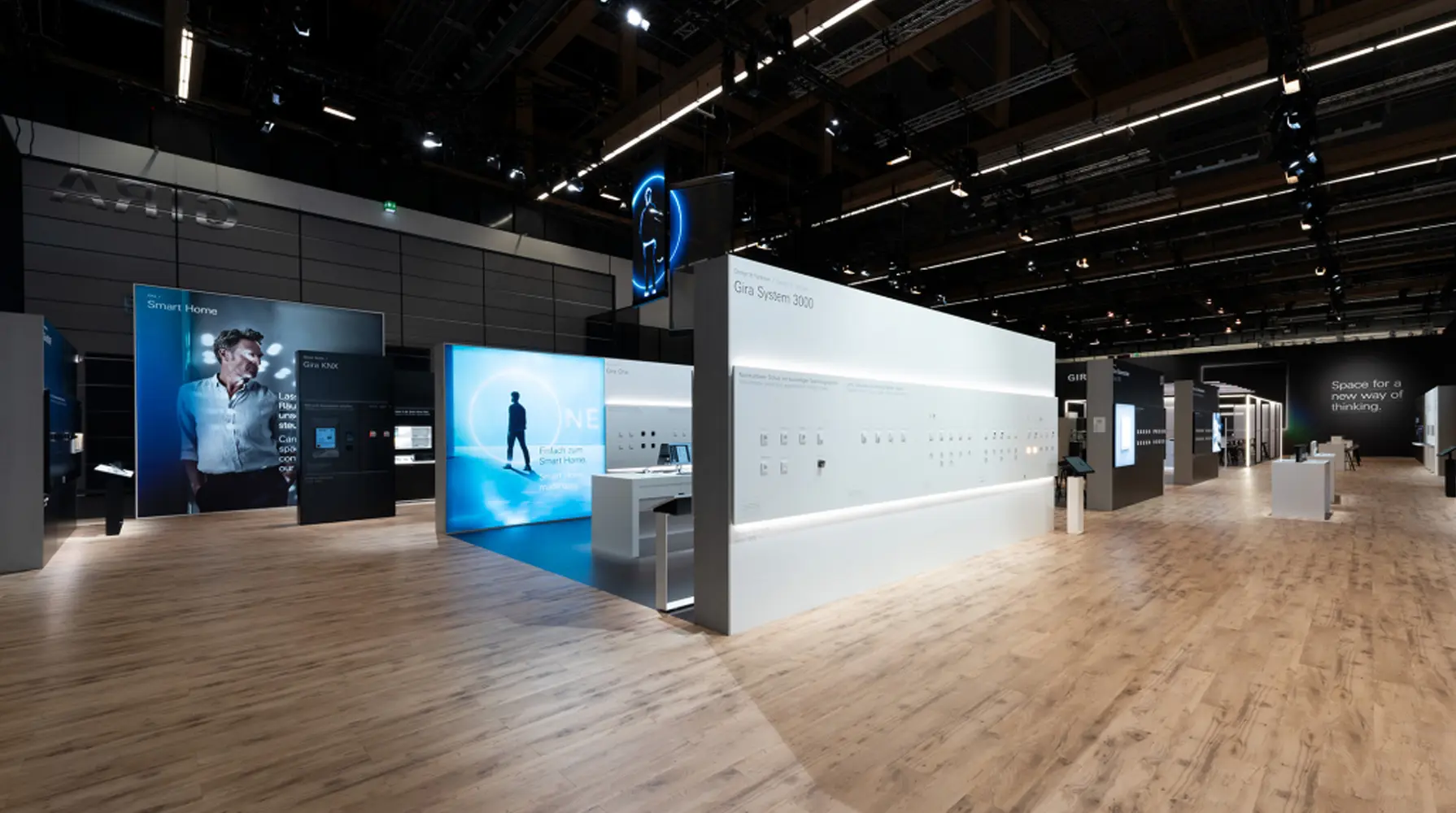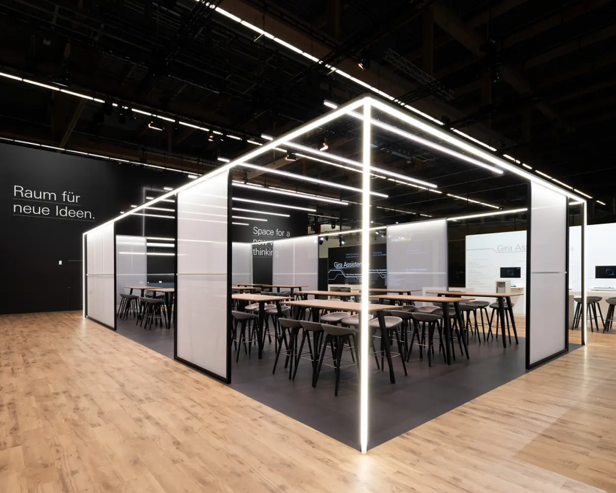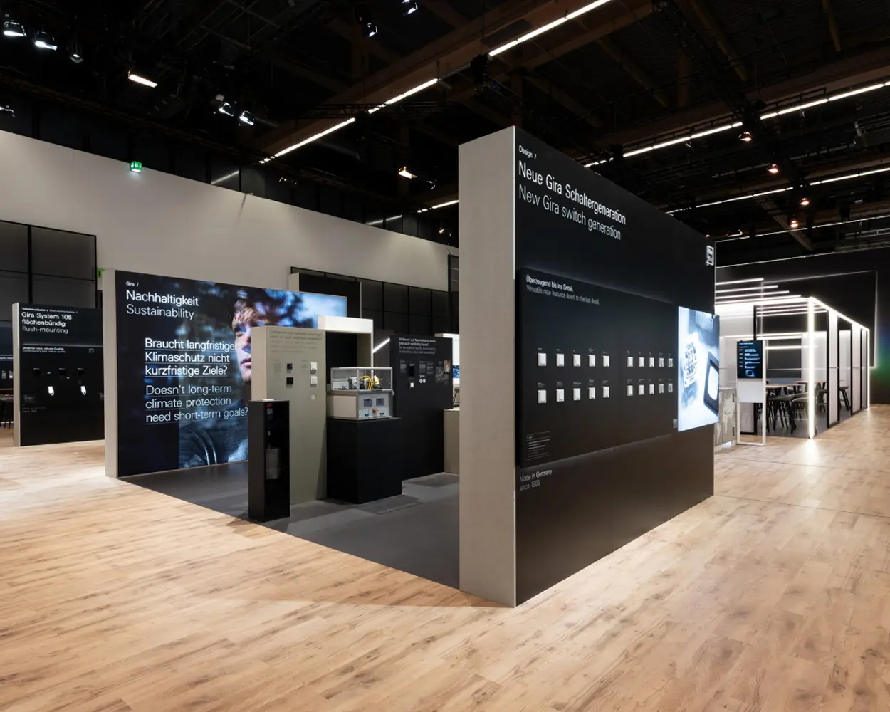 A striking façade made of transparent fabric and pulsating light symbolizes the flow of energy and invites visitors to experience GIRA. On more than 1,000 square meters, the space is divided into a product presentation area, a live studio, and an experience and hospitality area. The space appears bright, open, and structured, with graphic elements that enhance the visual impact and show the light in constant change. Large-format product photographs support the exterior view, but also the clear product presentation in the interior. Aesthetic yet functional, visitors' attention is directed specifically to the product presentation.