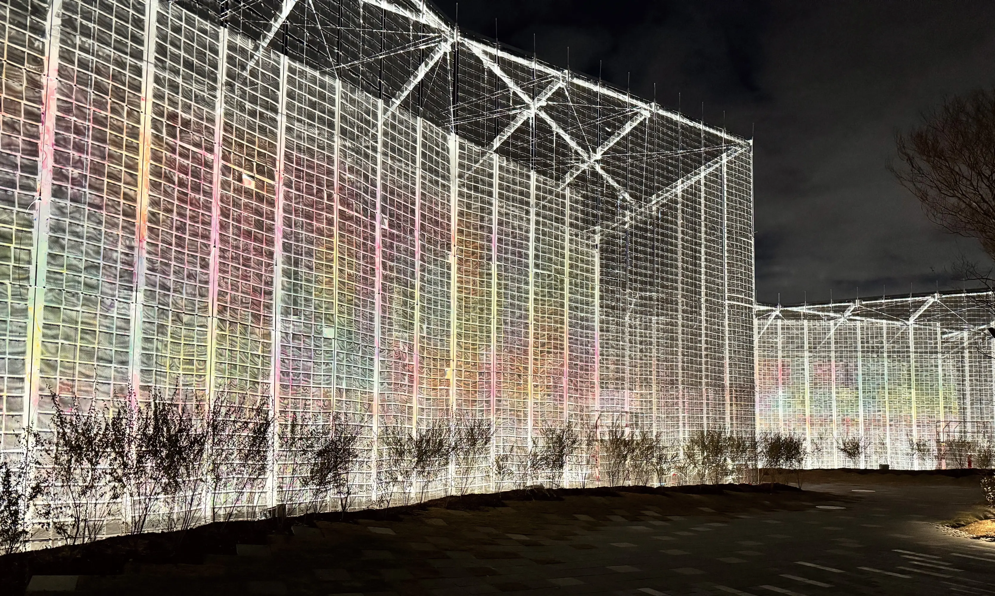 The NTT Pavilion expresses beauty through the fusion of digital and real. Its tent-like wire structure achieves low carbon and creates a soft, calm exterior. The wires form ruled lines draped with bit-patterned fabric outside and multicoloured, nature-inspired cloth inside, conveying emotion. Touching the wires produces string-like sounds, while subtle movements make the fabrics flutter and emit sound. Inside, visitors’ emotions are digitally analyzed and expressed as vibrations and sounds on the outer cloth. The pavilion moves like a living organism, blending people, nature, architecture, and digital—Architecture Draped in Emotion.