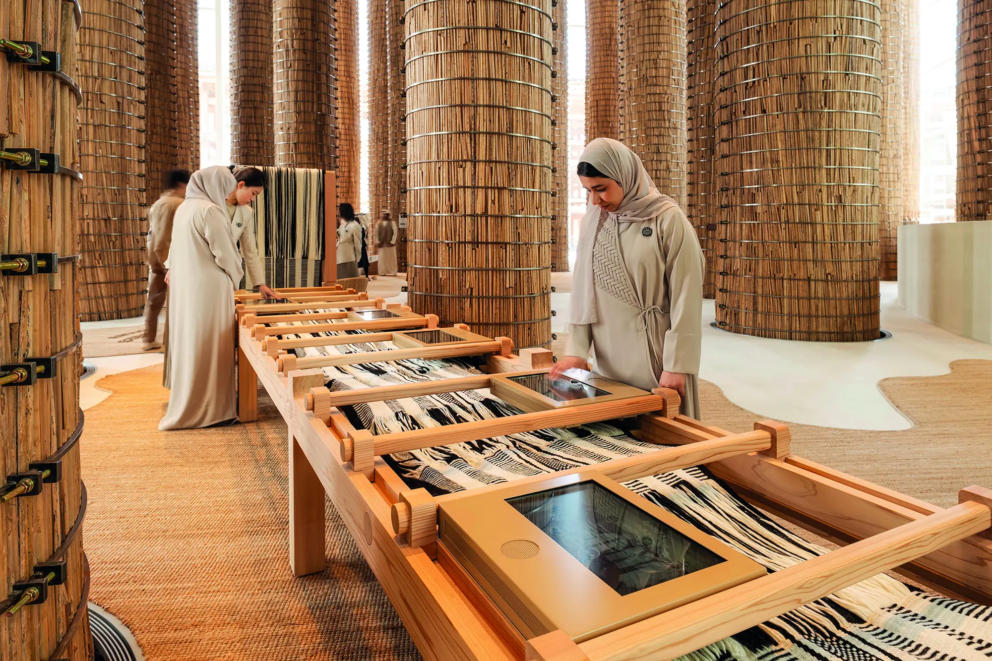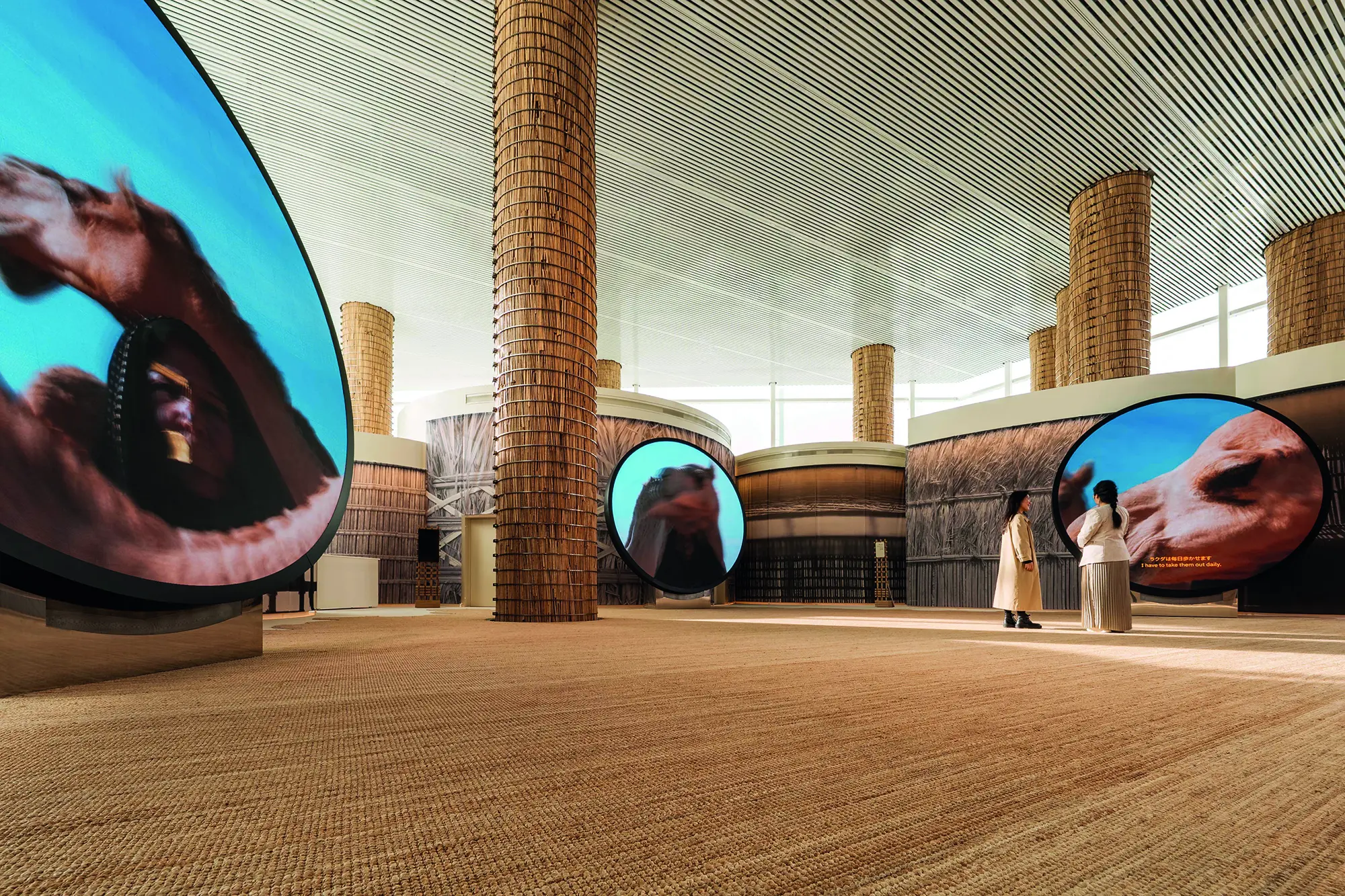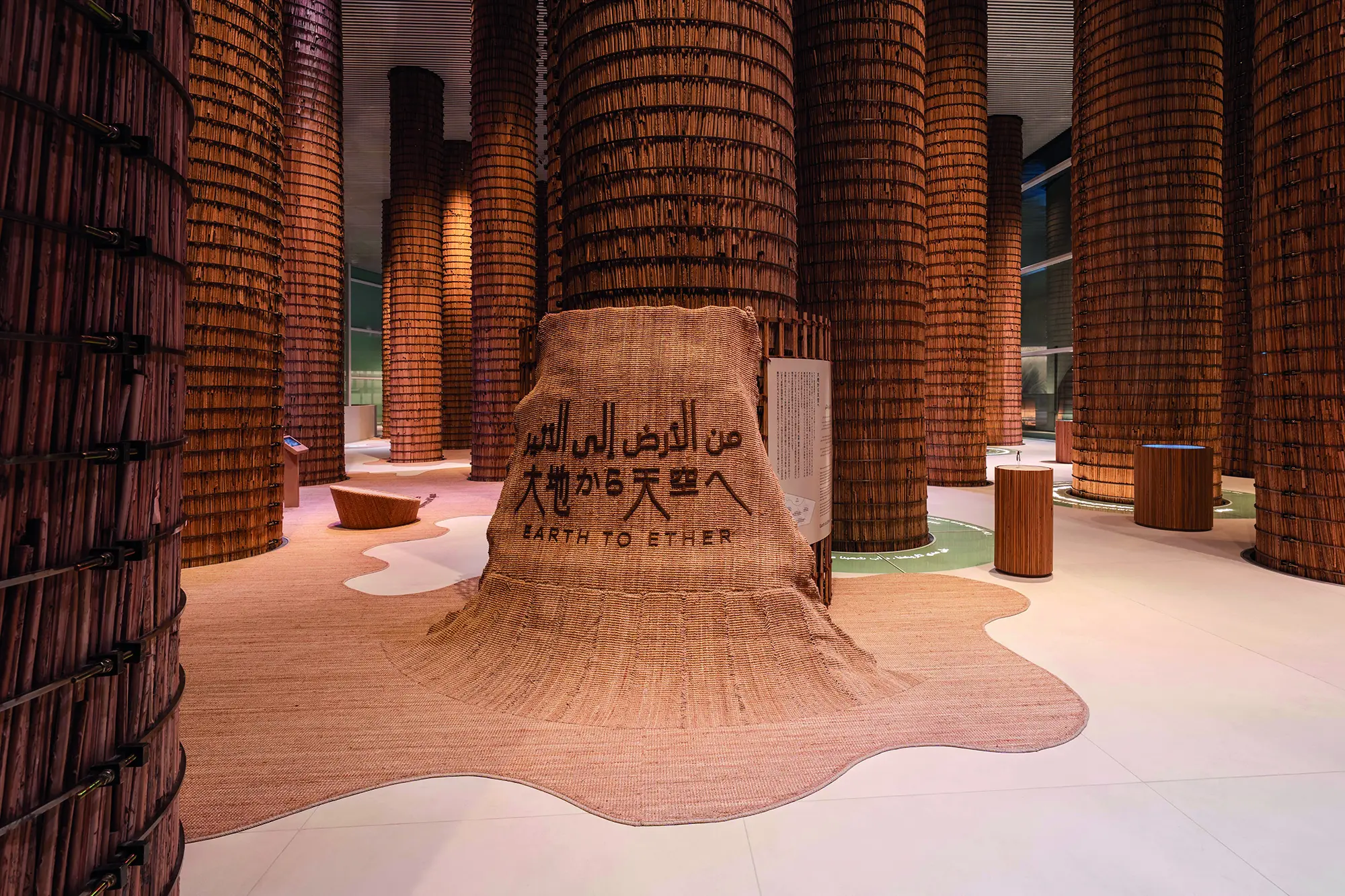 The UAE Pavilion at Expo 2025 Osaka invites visitors into an immersive, multisensory journey where heritage and innovation are seamlessly interwoven. Under the theme "Earth to Ether", the exhibition celebrates the United Arab Emirates as a nation deeply connected to its heritage while boldly pioneering solutions for the future. At its heart stands the date palm – a symbol of resilience and resourcefulness – integrated into structural columns, scenographic furniture, signage, and wayfinding elements. Interactive installations, cinematic narratives, and thematic zones create a unique interplay of tradition and technology.