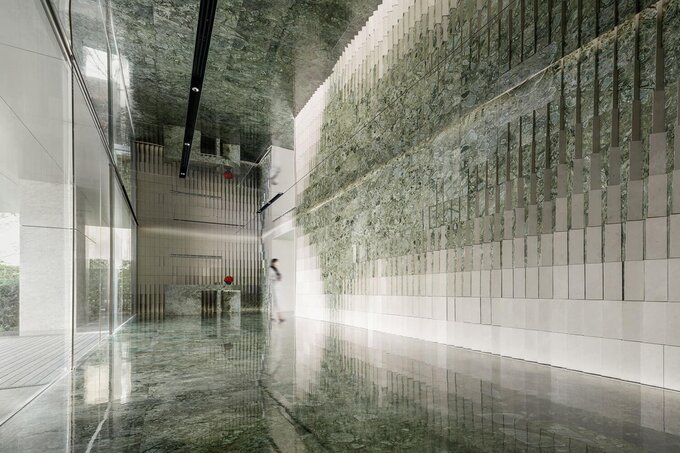 The Shenzhen Dream City Exhibition Hall offers a captivating experience from the moment guests step into the entrance reception area. The three-dimensional parametric design of the green and white stone wall tells the story of growth, complemented by serene water features and landscape trees. The open second-floor space reflects the germination process, with floor-to-ceiling windows allowing natural light to envelop the area. The use of green and beige stone, along with elements of nature and industrial design, creates a unique and timeless ambiance. The space is a harmonious blend of modernity and natural beauty for an immersive experience.