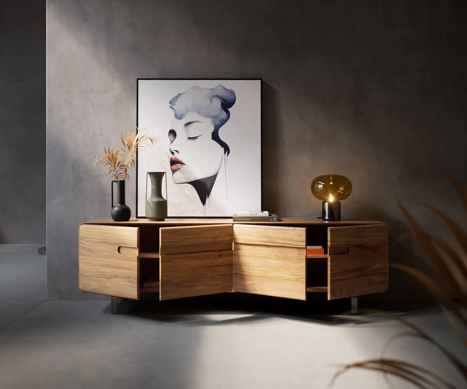 Anaya – Minimalism at its finest. Anaya brings a bold statement of modern design into your home. With its clean lines, rounded edges, and uncompromisingly minimalist aesthetic, this lowboard is a celebration of simplicity. Made from solid acacia wood, it radiates warmth through its natural grain—without sacrificing clarity. Handle-free doors with elegant recesses blend seamlessly into the front, while precisely crafted joints between doors and body complete the look. Anaya is more than just furniture—it’s a serene centrepiece for your living room.